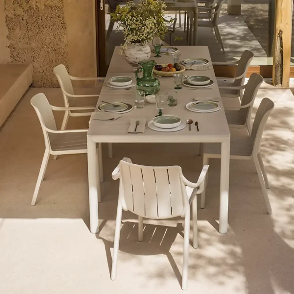 The Tiberina Outdoor Armchair, Set of 4 from Nardi Outdoor adds eco-friendly comfort to a porch or patio. Designed by Raffaello Galiotto and made in Italy from a recyclable fiberglass polypropylene resin incorporating UV resistance, its slender legs and non-slip feet keep it in place on smooth surfaces. The legs elevate a slatted seat that offers both airflow and cooling, and helps drain any rain rather than allowing it to pool. Each seat is smooth and stackable, while slender armrests coordinate well with the slight arch of the seat back.