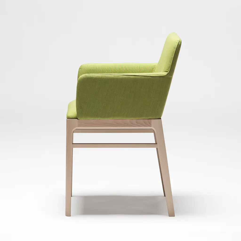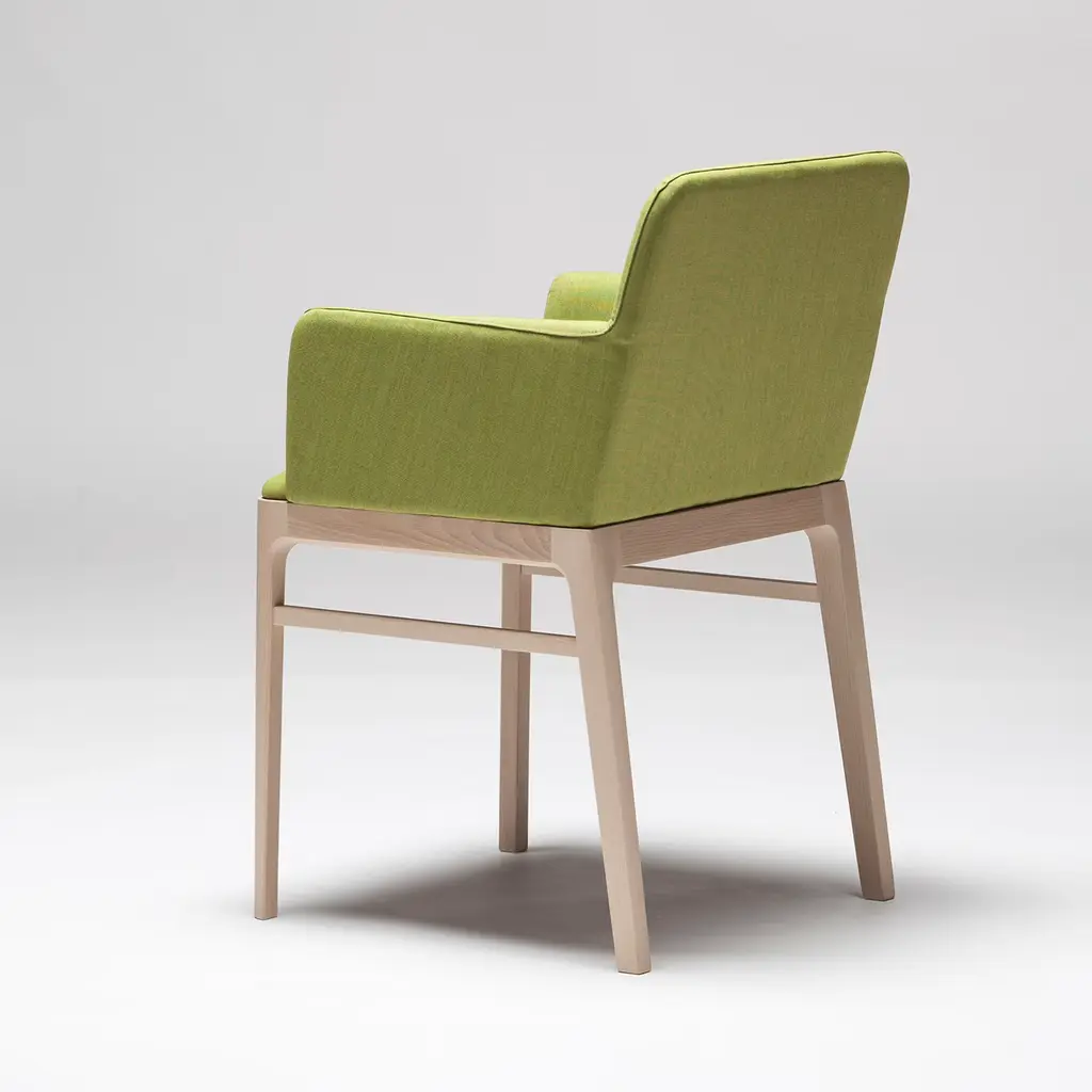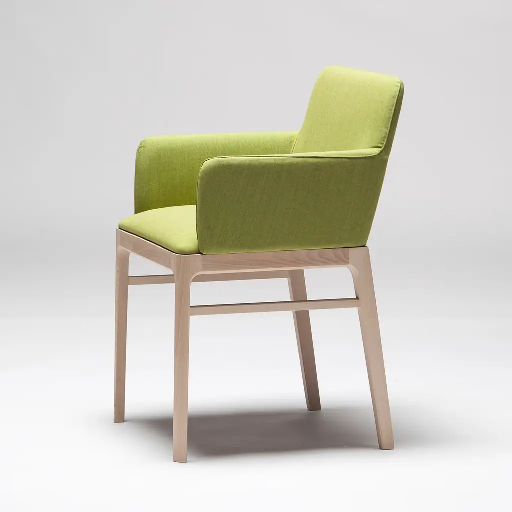 Tip Tap 381 is a chair with a seat and backrest upholstered and covered with fabric The structure is in beechwood and all the elements in the wood are connected. The frame has no corner fittings. The fabric in the picture is Extra 02, Remix 3. The chair is also available in leather, please contact the concierge for more information.