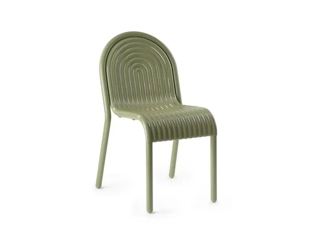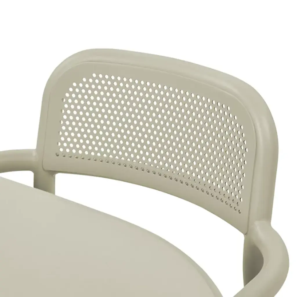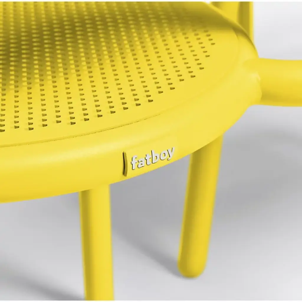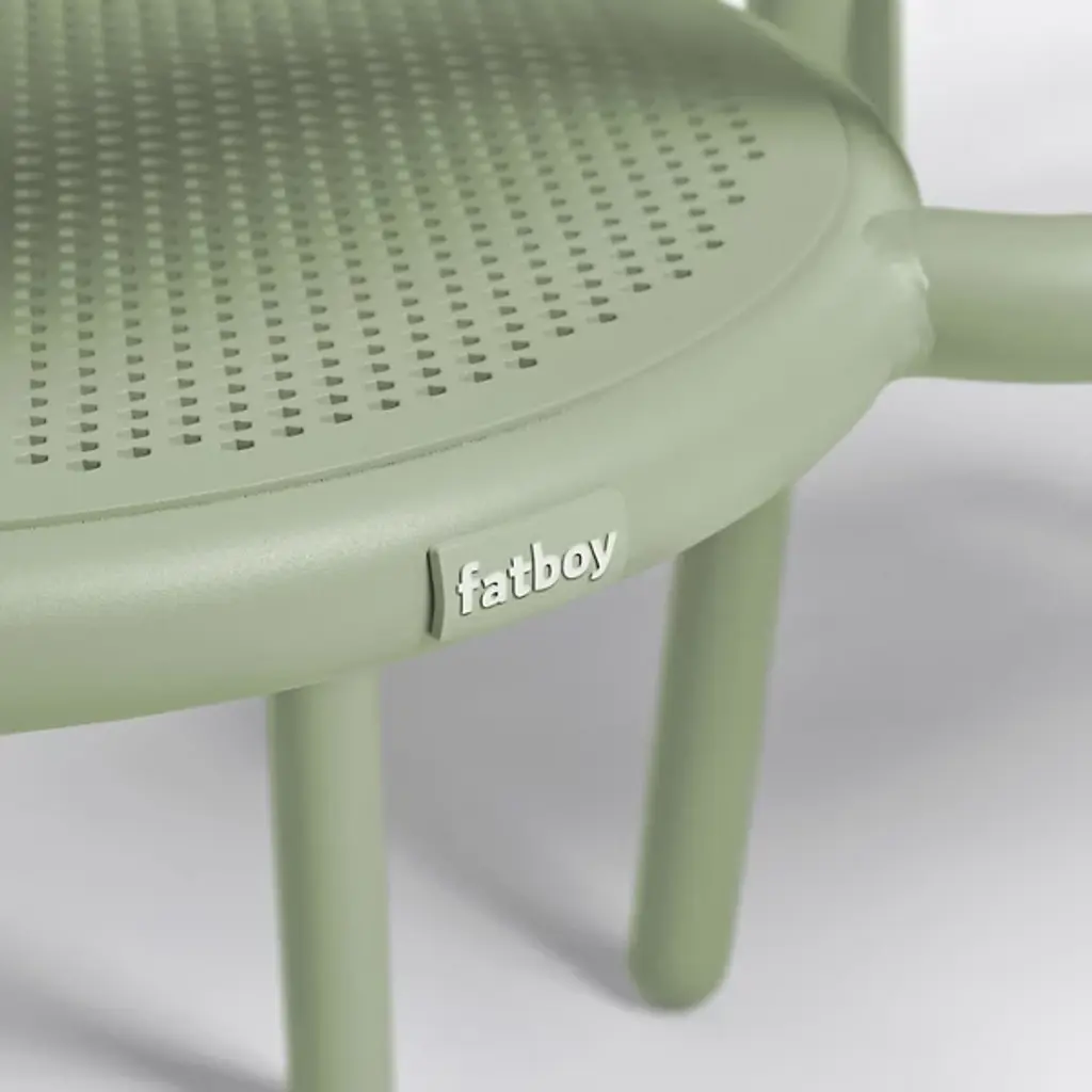 Fresh aesthetics with a time-honored appeal. Designer Erik Stehmann visually and physically lightens up the curve filled figure of the classic bistro chair in the Toni Outdoor Armchair from Fatboy. It's a lightweight powder-coated aluminum piece that proves easy to move and stack. From its rounded legs to its sweeping armrest, clean contours draw the overall refine silhouette. Cut out from its bistro inspiration, a circular seat and backrest provide breathable comfort in their hexagonal patterning. The rugged piece stands up to mother nature, either rain or shine.