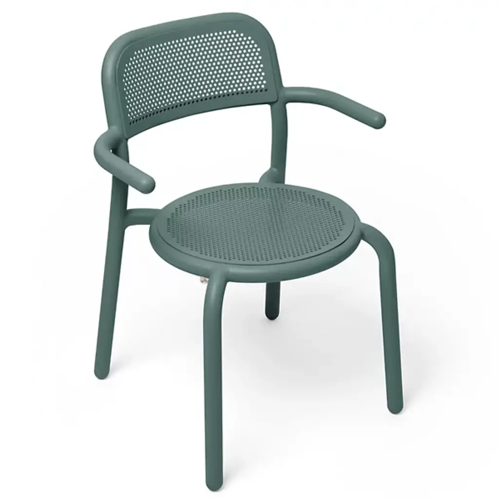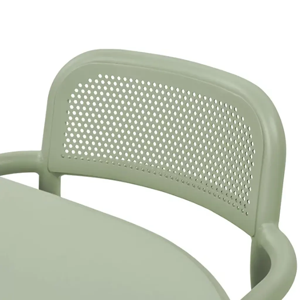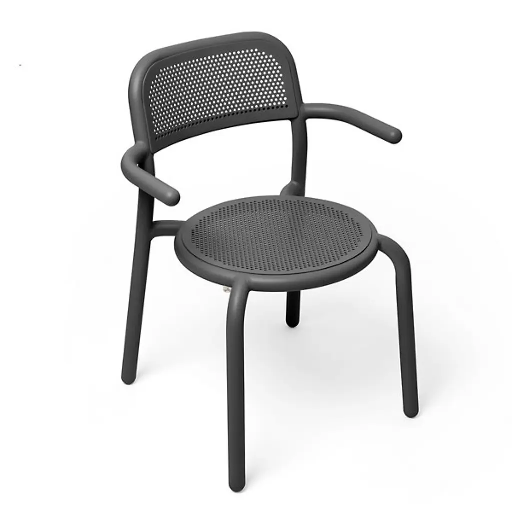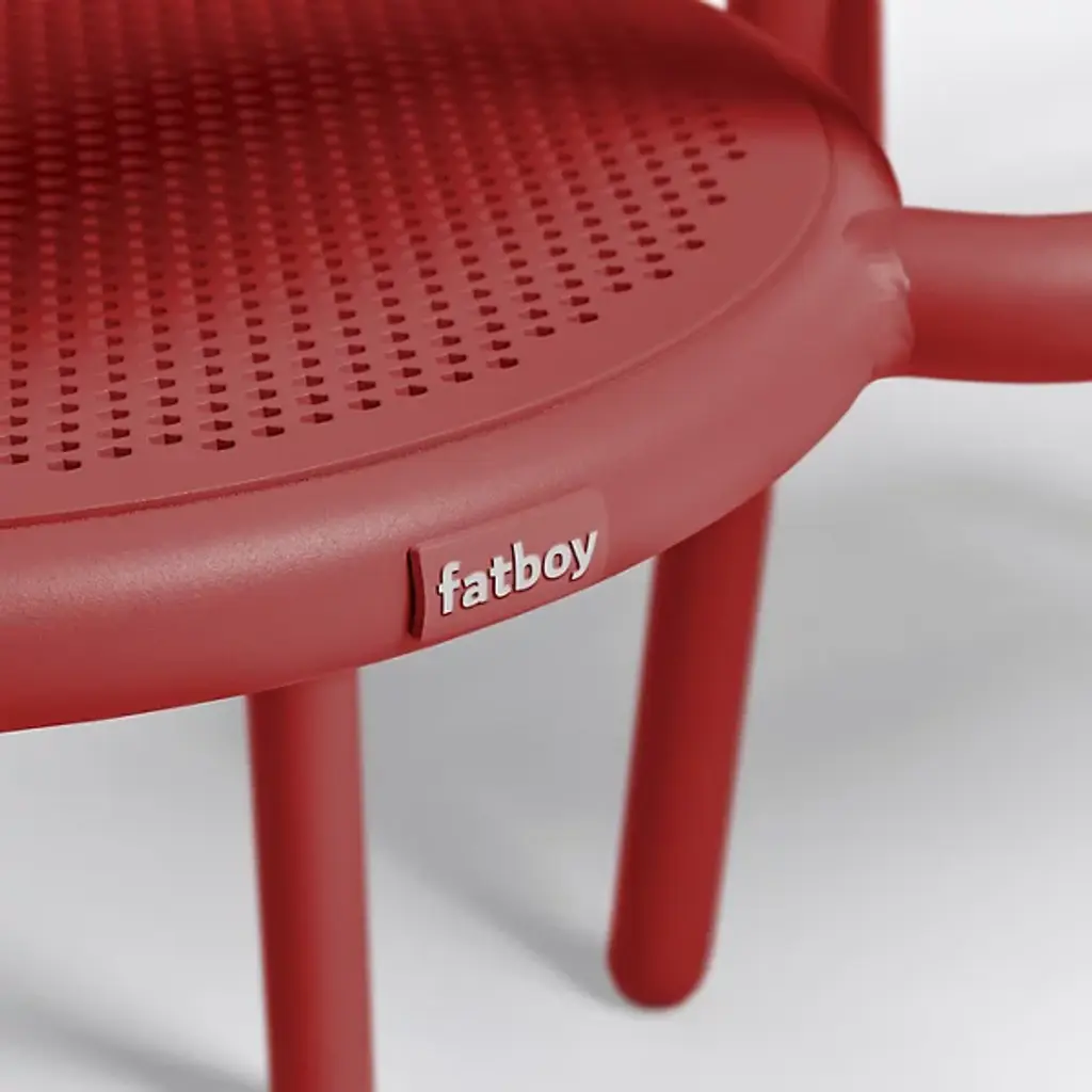 Fresh aesthetics with a time-honored appeal. Designer Erik Stehmann visually and physically lightens up the curve filled figure of the classic bistro chair in the Toni Outdoor Armchair from Fatboy. It's a lightweight powder-coated aluminum piece that proves easy to move and stack. From its rounded legs to its sweeping armrest, clean contours draw the overall refine silhouette. Cut out from its bistro inspiration, a circular seat and backrest provide breathable comfort in their hexagonal patterning. The rugged piece stands up to mother nature, either rain or shine.
