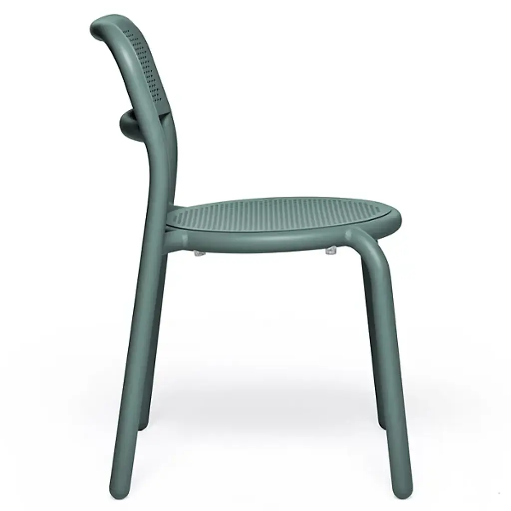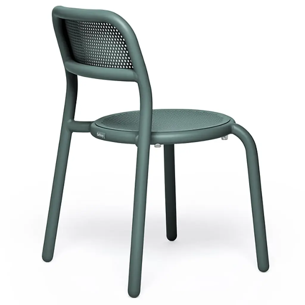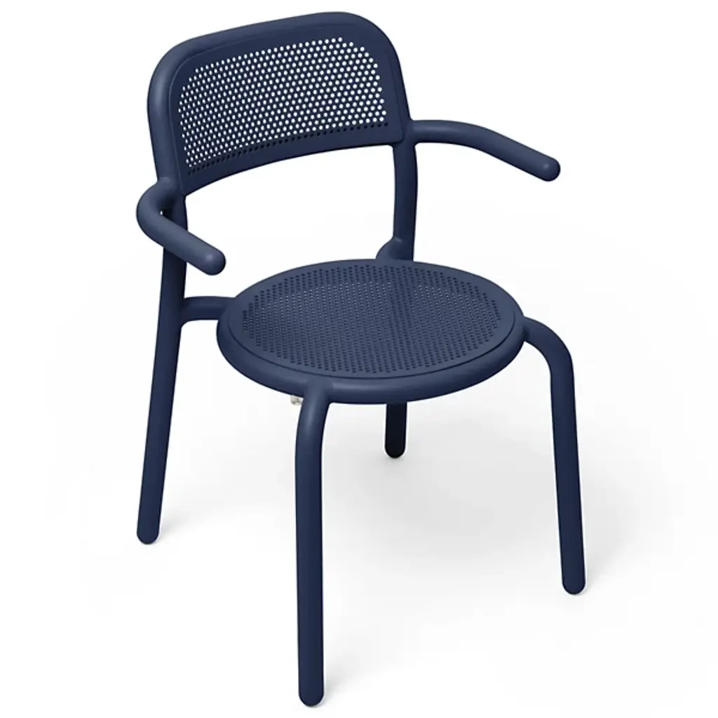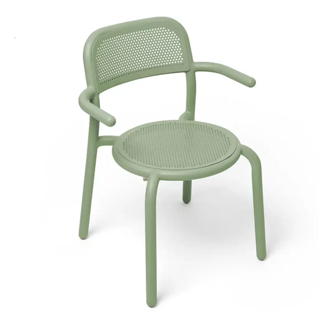 Fresh aesthetics with a time-honored appeal. Designer Erik Stehmann visually and physically lightens up the curve filled figure of the classic bistro chair in the Toni Outdoor Armchair from Fatboy. It's a lightweight powder-coated aluminum piece that proves easy to move and stack. From its rounded legs to its sweeping armrest, clean contours draw the overall refine silhouette. Cut out from its bistro inspiration, a circular seat and backrest provide breathable comfort in their hexagonal patterning. The rugged piece stands up to mother nature, either rain or shine.