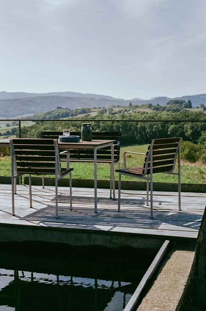 Designed by frequent HAY collaborator Erwan Bouroullec, the Traverse Armchair (2025) brings a graceful yet robust beauty to outdoor entertaining. Its contoured aluminum frame supports heat-treated ash wood slats designed to beautifully patina over time. Inspired by the public benches of 19th-century Paris, the refined yet utilitarian armchair is ready to entertain in any setting - from urban courtyards to country gardens. Made in China.
