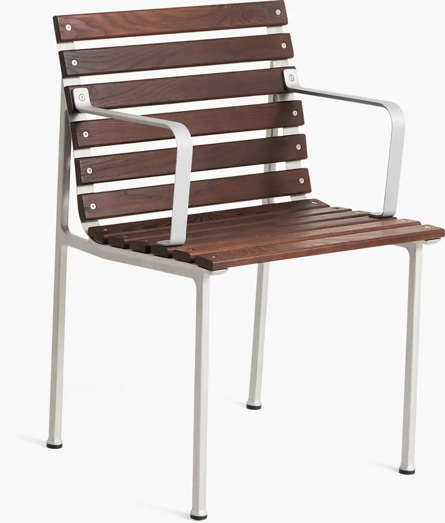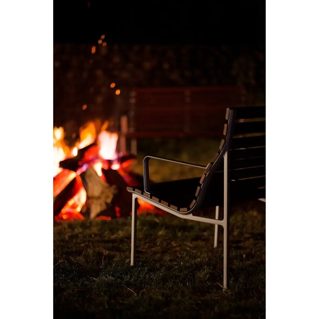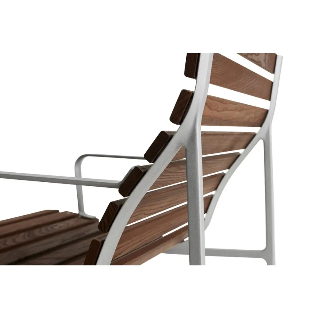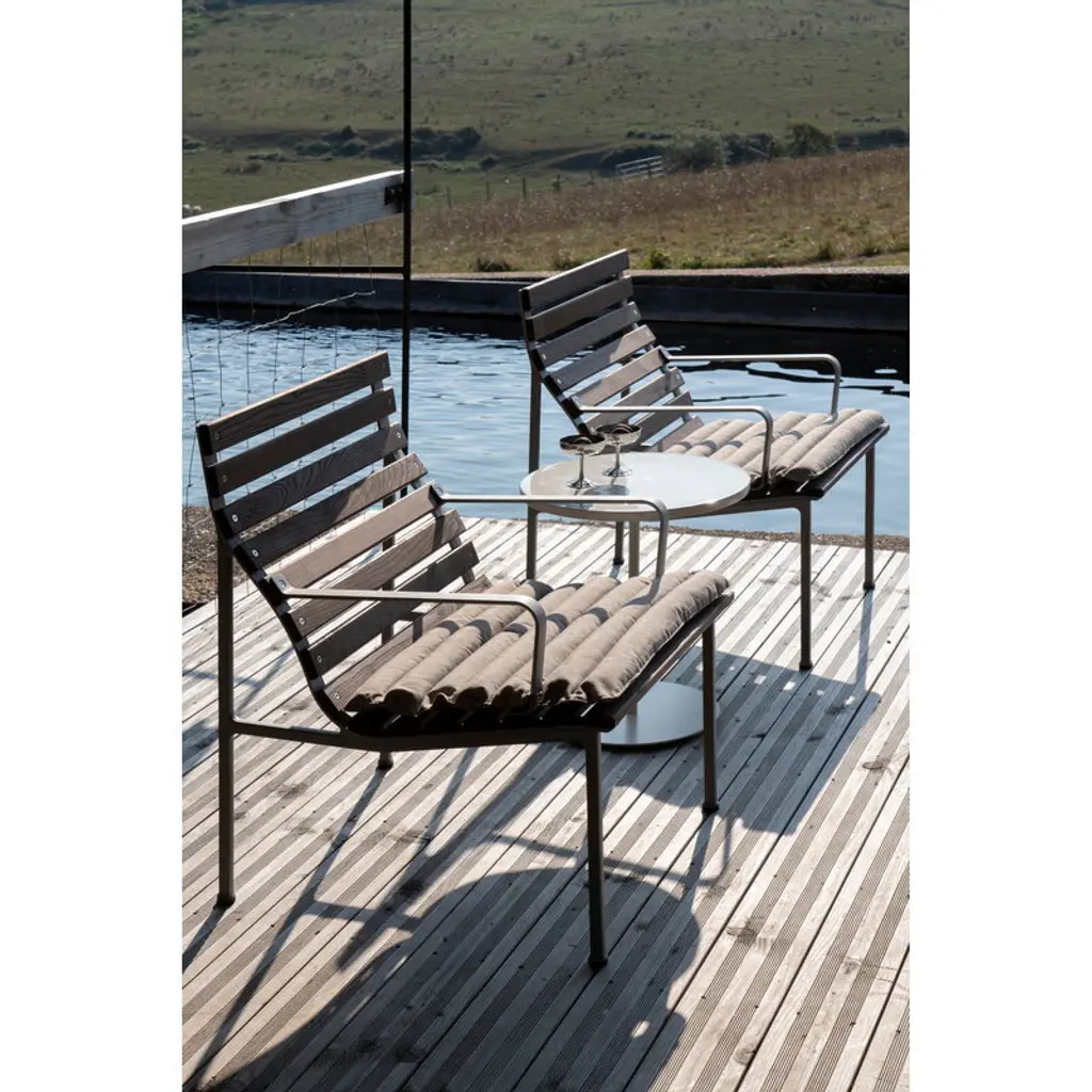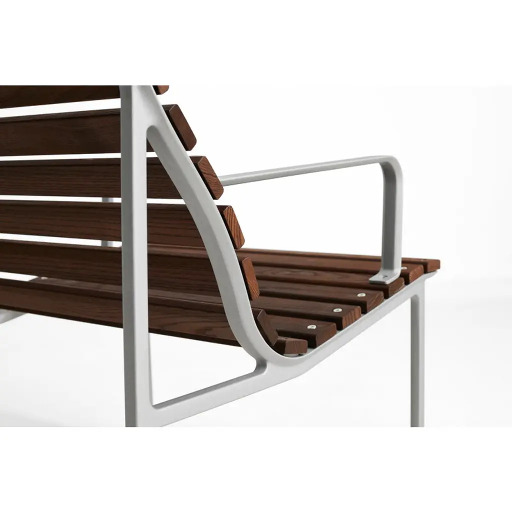 HAY's Traverse lounge armchair brings together soft, flowing shapes and the rich texture of heat-treated ash, making it a natural fit for any outdoor space. Created by French designer Erwan Bouroullec, this outdoor armchair adapts effortlessly to its surroundings, whether nestled in a lush garden or placed on a sleek urban balcony. Over time, the heat-treated ash develops a beautiful silver-gray patina, blending even more seamlessly into its surroundings. For added comfort, you can pair the Traverse armchair with a separately sold seat cushion. HAY's Traverse patio furniture is crafted from two strong, weather-resistant materials: a lightweight lacquered aluminum frame and solid heat-treated ash. This chemical-free treatment, achieved with steam and heat, enhances the wood's moisture resistance and strengthens it all the way to the core. The process gives the naturally light ash a dark surface, which gradually ages into a soft gray hue under exposure to UV light. To minimize packaging size, the furniture is delivered in parts.
