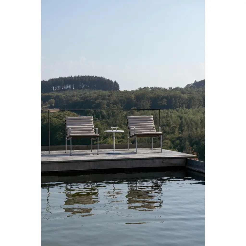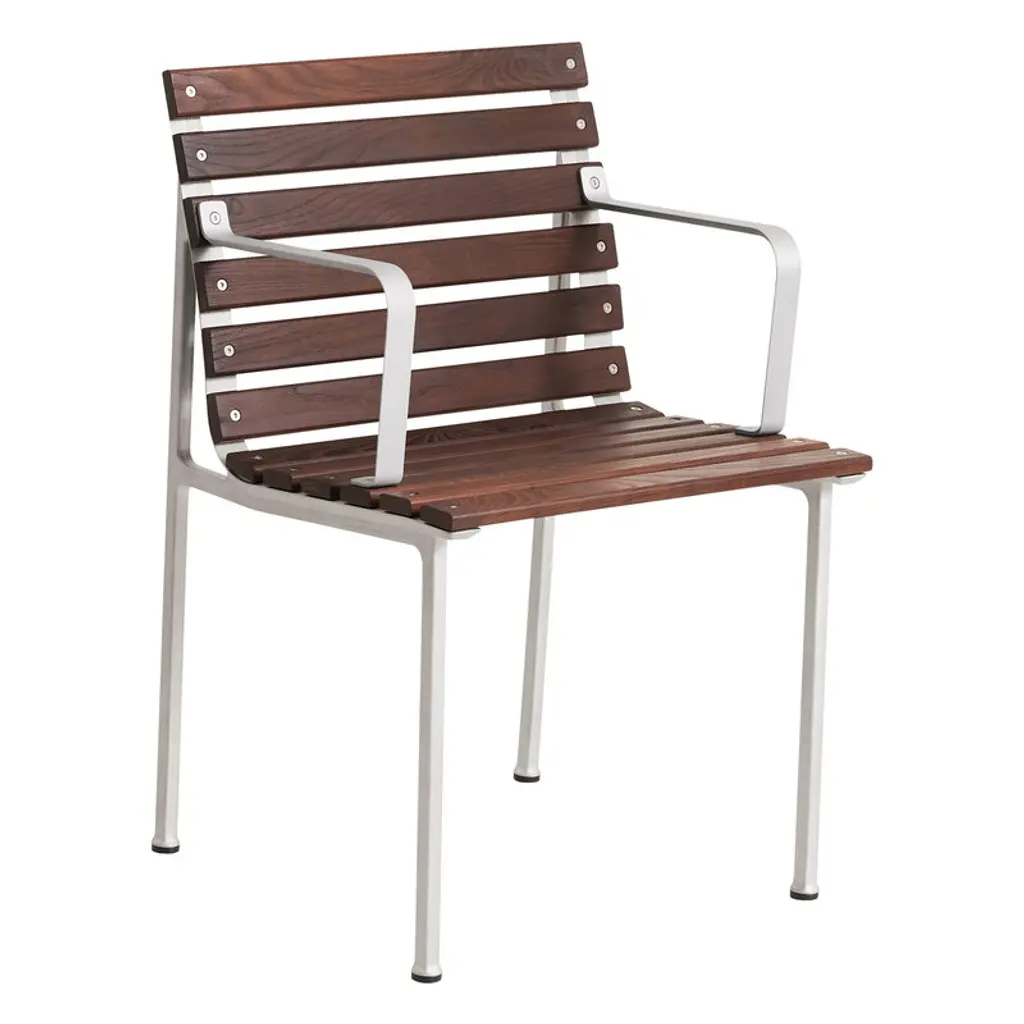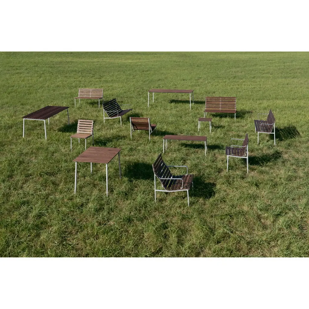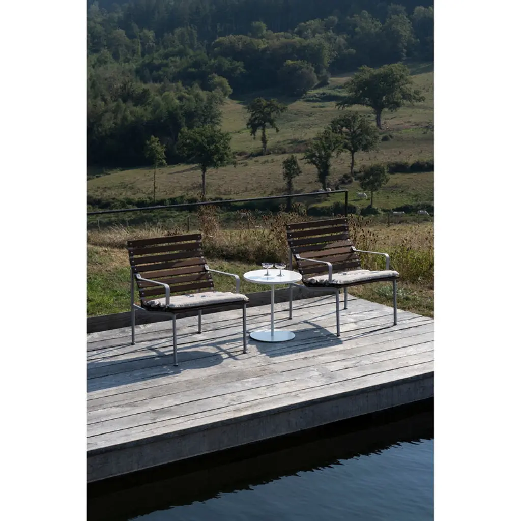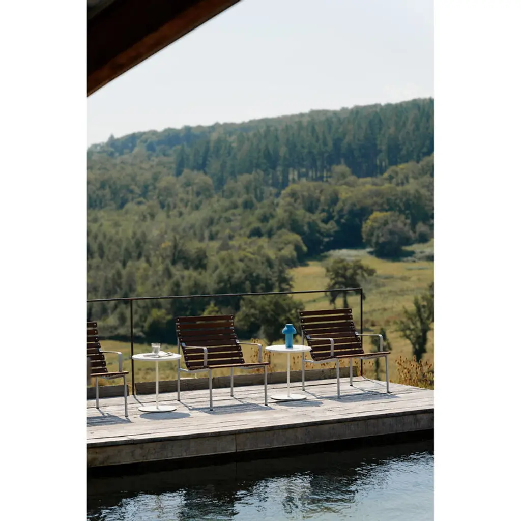 HAY's Traverse lounge armchair brings together soft, flowing shapes and the rich texture of heat-treated ash, making it a natural fit for any outdoor space. Created by French designer Erwan Bouroullec, this outdoor armchair adapts effortlessly to its surroundings, whether nestled in a lush garden or placed on a sleek urban balcony. Over time, the heat-treated ash develops a beautiful silver-gray patina, blending even more seamlessly into its surroundings. For added comfort, you can pair the Traverse armchair with a separately sold seat cushion. HAY's Traverse patio furniture is crafted from two strong, weather-resistant materials: a lightweight lacquered aluminum frame and solid heat-treated ash. This chemical-free treatment, achieved with steam and heat, enhances the wood's moisture resistance and strengthens it all the way to the core. The process gives the naturally light ash a dark surface, which gradually ages into a soft gray hue under exposure to UV light. To minimize packaging size, the furniture is delivered in parts.