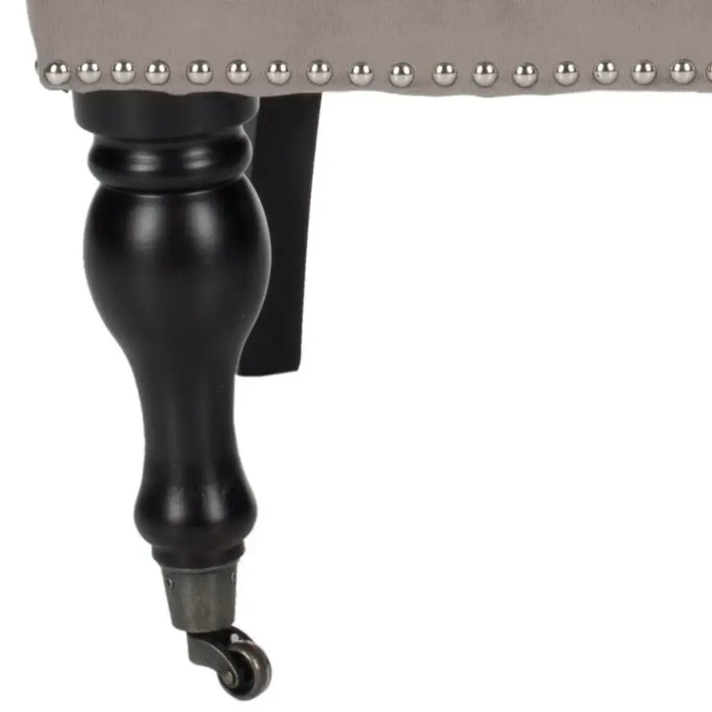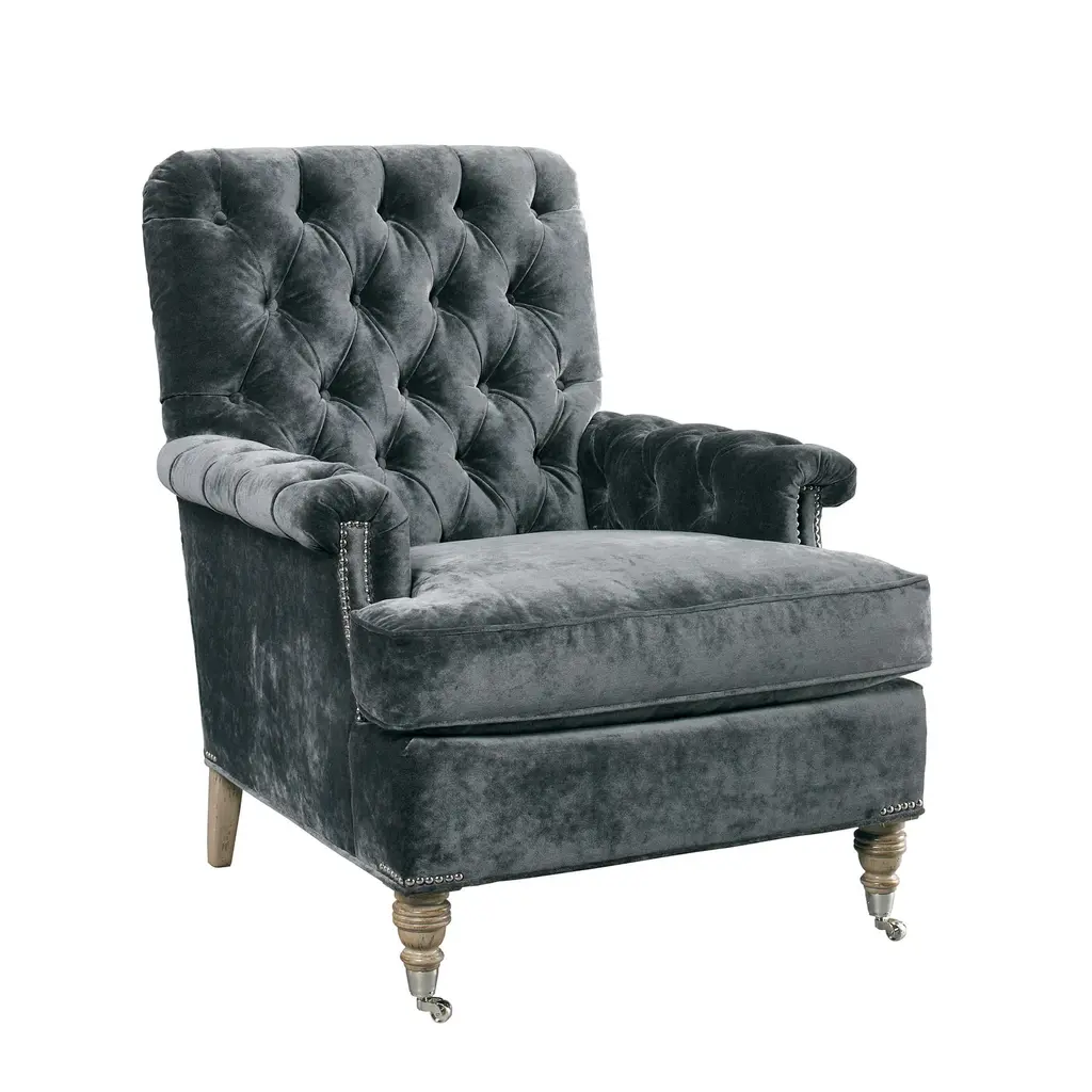 Charin every designer detail, the petite armchair recalls richly upholstered parlor and boudoir chairs from a gentler era.is updated with cotton velvet upholstery in mushroom taupe, and features silver nailhead trim, sloped arms and birch wood spindle legs with java finish. Replete with traditional details, The Chair comes with front casters for easy mobility. To prevent overall soiling, frequent vacuum light brushing is recommended. Cushions and pillows should be turned on a weekly basis. Down-filled cushions should be brushed rather than vacuumed. Spot clean, using a mild water-free solvent or dry cleaning product. Only a professional cleaner should undertake a complete overall cleaning. The use of steam or water-based cleaners may cause excessive shrinking or staining.