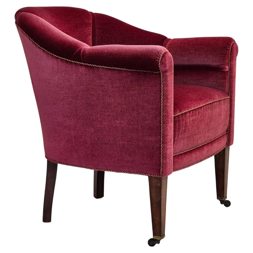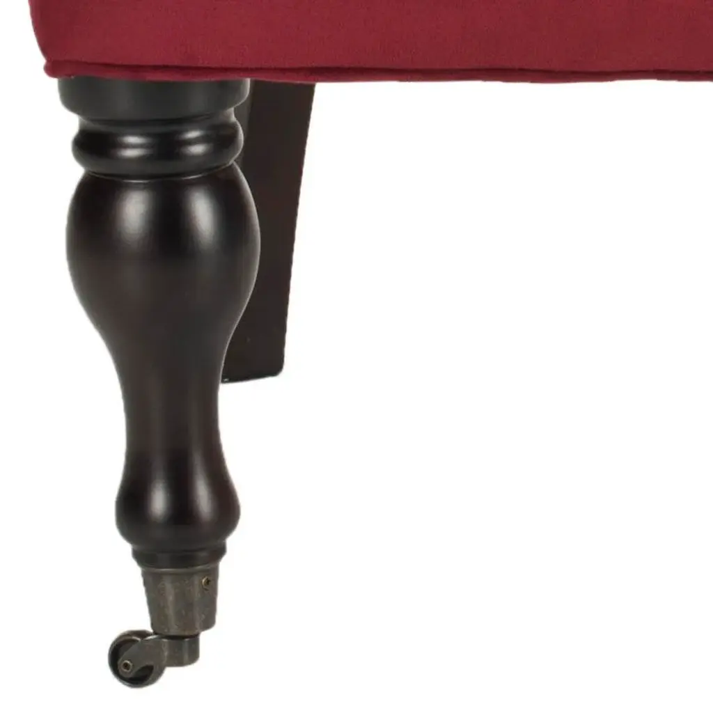 Charin every designer detail, the petite armchair recalls richly upholstered parlor and boudoir chairs from a gentler bygone era. Replete with traditional details,is updated with biscuit tufted cotton velvet upholstery in striking red, and features sloped arms. Birch wood spindle legs are finished in dark java and come with front casters for easy mobility. To prevent overall soiling, frequent vacuum light brushing is recommended. Cushions and pillows should be turned on a weekly basis. Down-filled cushions should be brushed rather than vacuumed. Spot clean, using a mild water-free solvent or dry cleaning product. Only a professional cleaner should undertake a complete overall cleaning. The use of steam or water-based cleaners may cause excessive shrinking or staining.