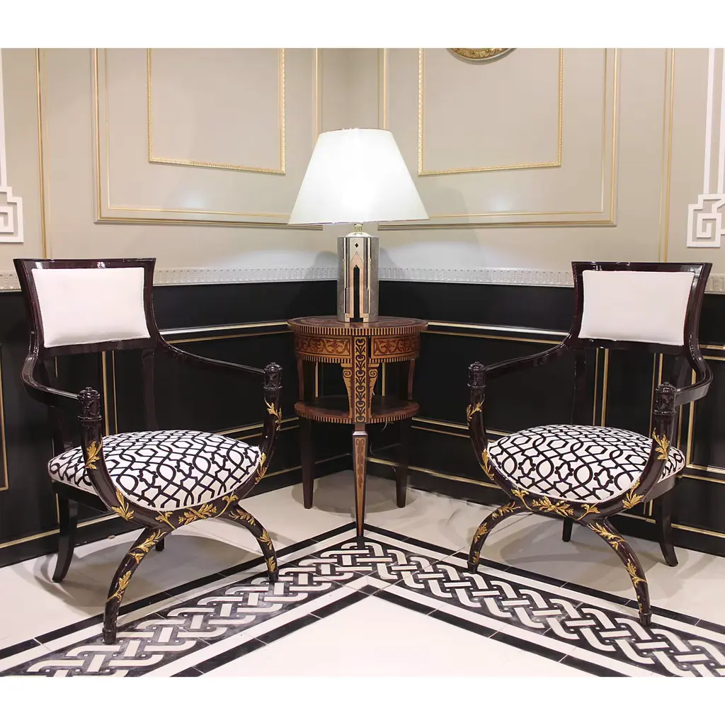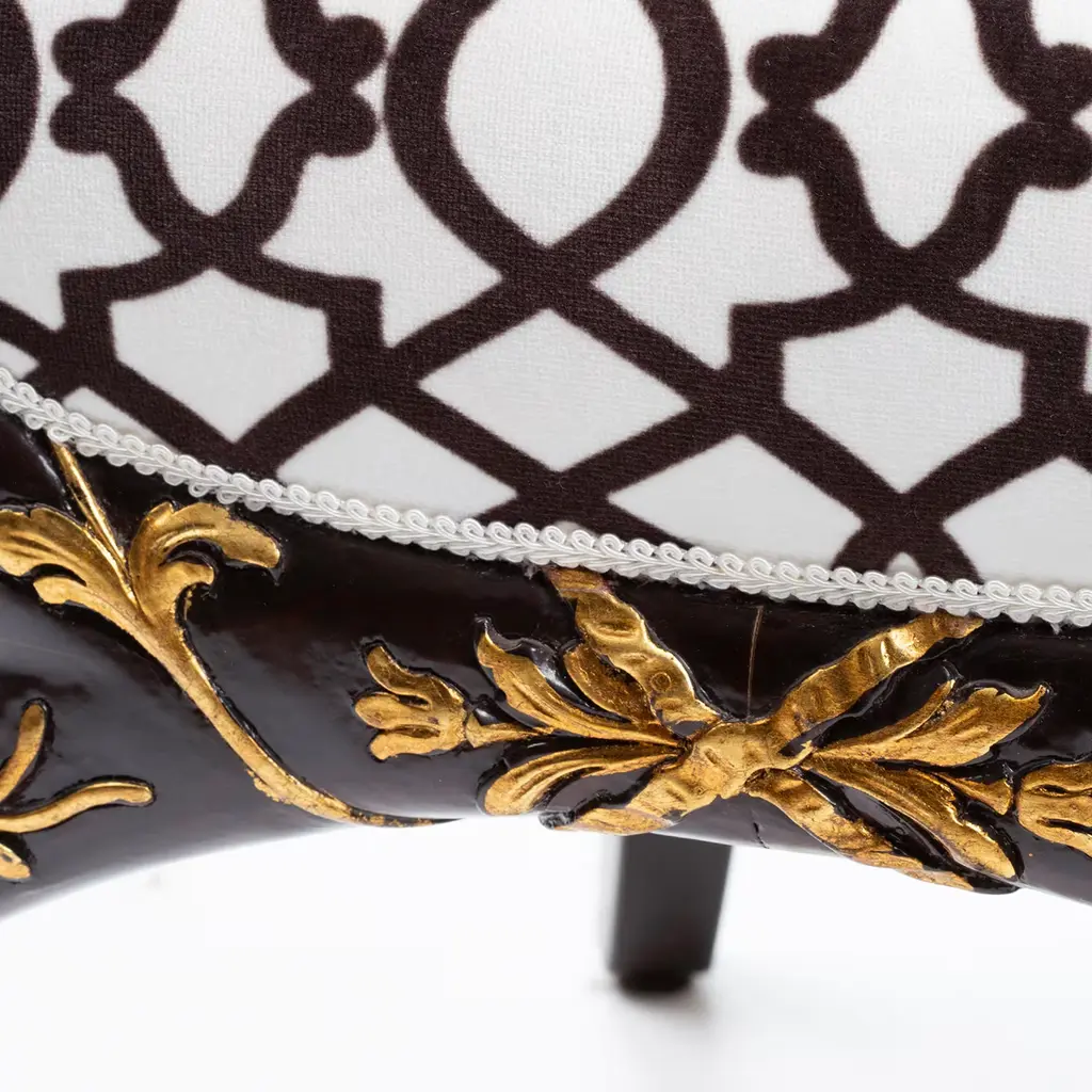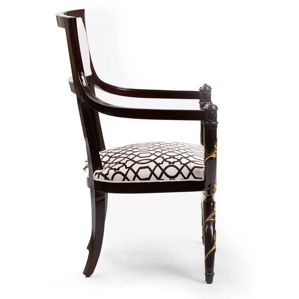 This elegant empire style armchair is inspired by the glamour of the 30s. Its sinuous structure is in mahogany, finely adorned with carved decorations highlighted with gold leaf. The cushions are covered in precious velvet and the seat features an exquisite printed geometrical pattern in black and white to add a touch of modern allure to this timeless piece.