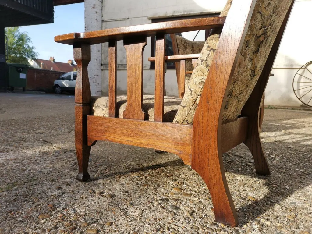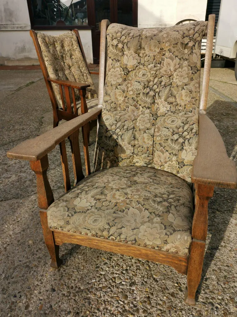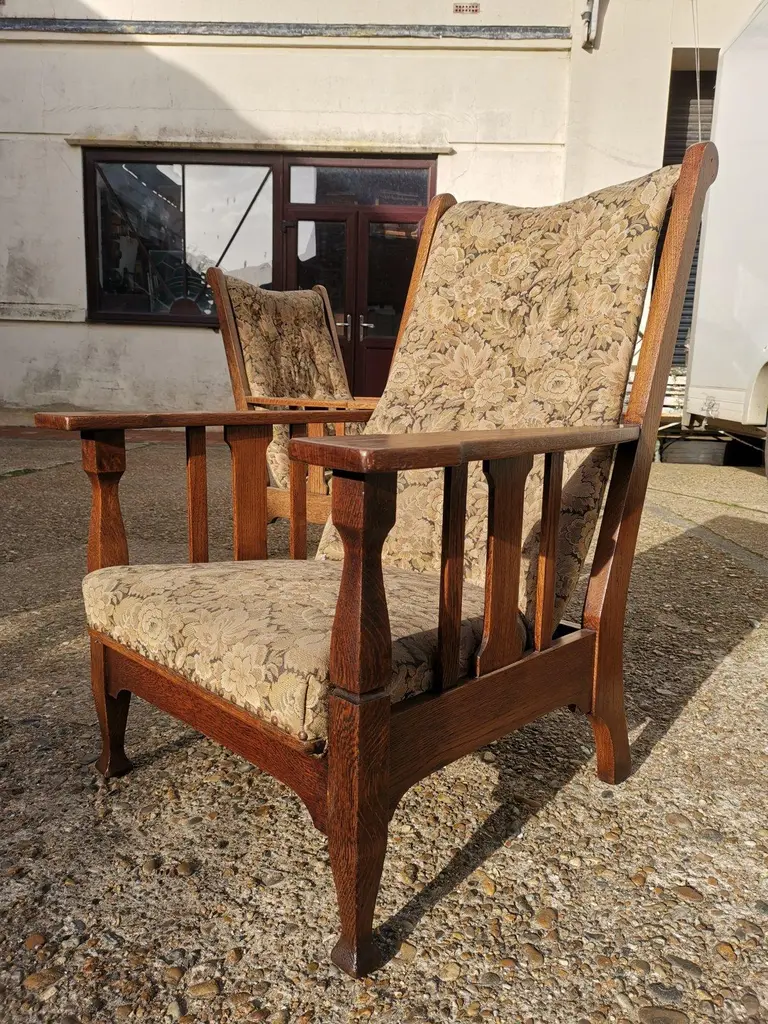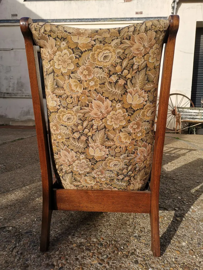 Harris Lebus. A Pair of English Arts and Crafts oak reclining armchairs with floral upholstery and large flat extended arms, ideal for a mug of tea or coffee to rest on.Although they are a matched pair and have been together forever I have priced them individually and will sell them separately.