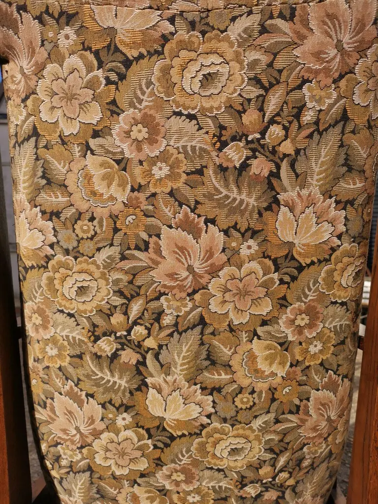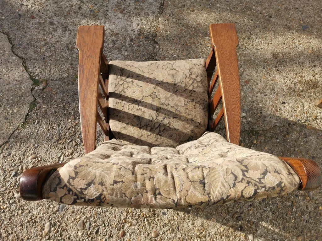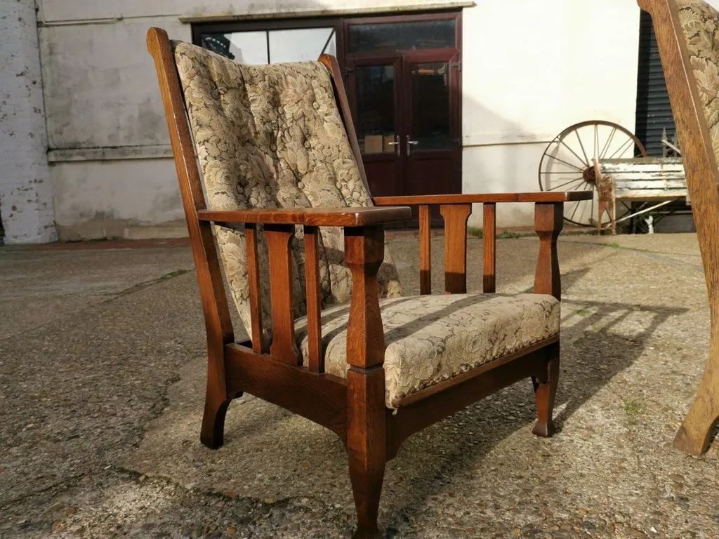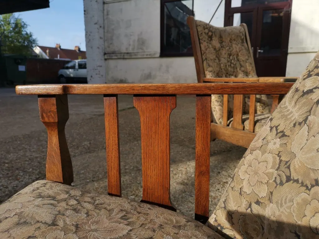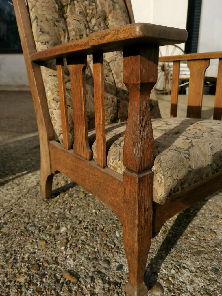 Harris Lebus. A Pair of English Arts and Crafts oak reclining armchairs with floral upholstery and large flat extended arms, ideal for a mug of tea or coffee to rest on.Although they are a matched pair and have been together forever I have priced them individually and will sell them separately.