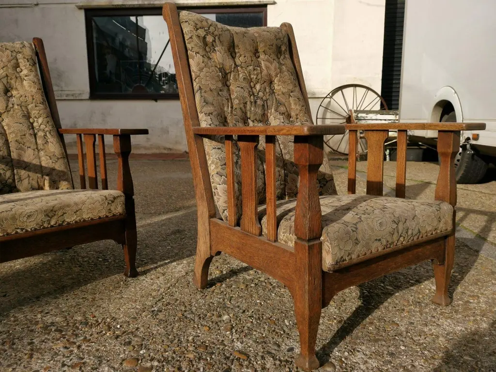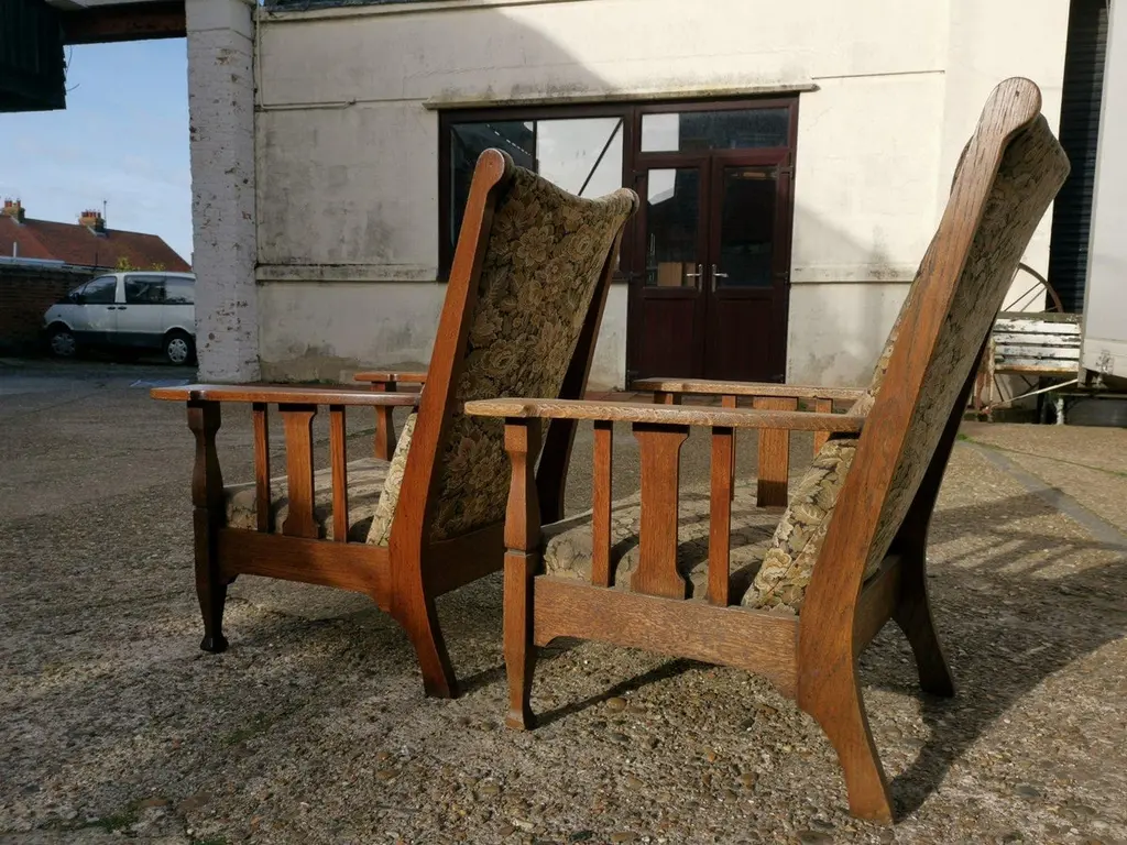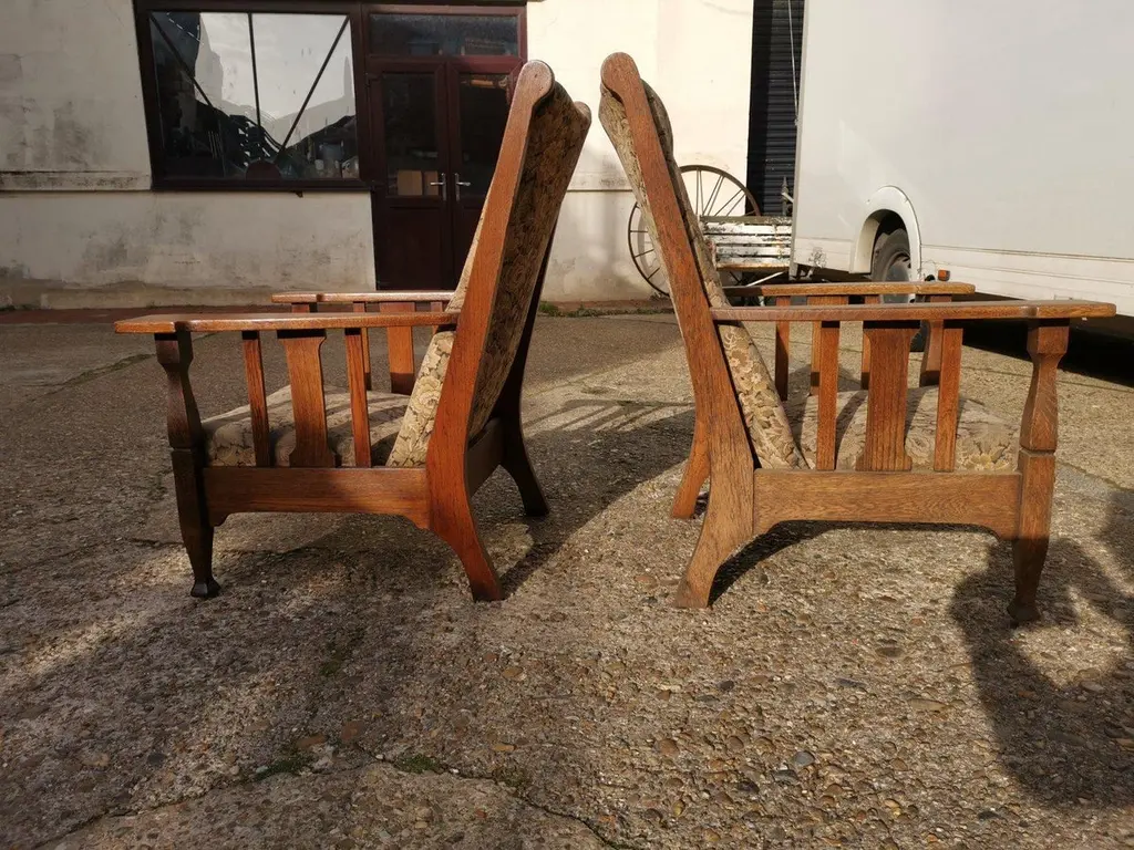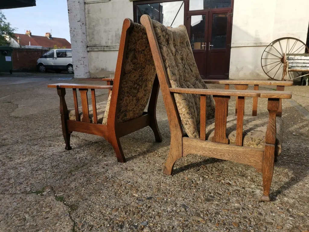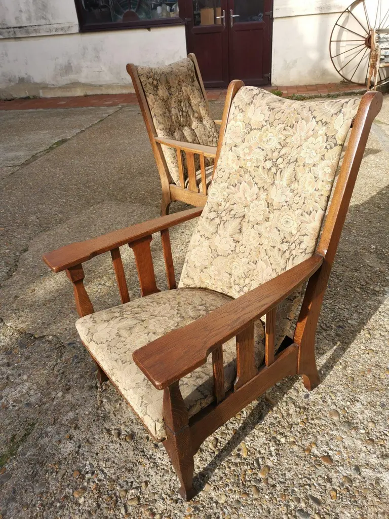 Two English Arts & Crafts Oak Reclining Armchairs With Large Flat Extended Arms