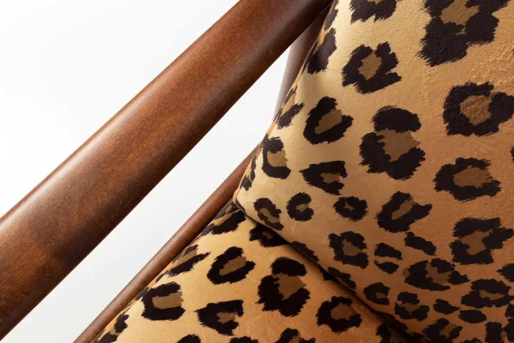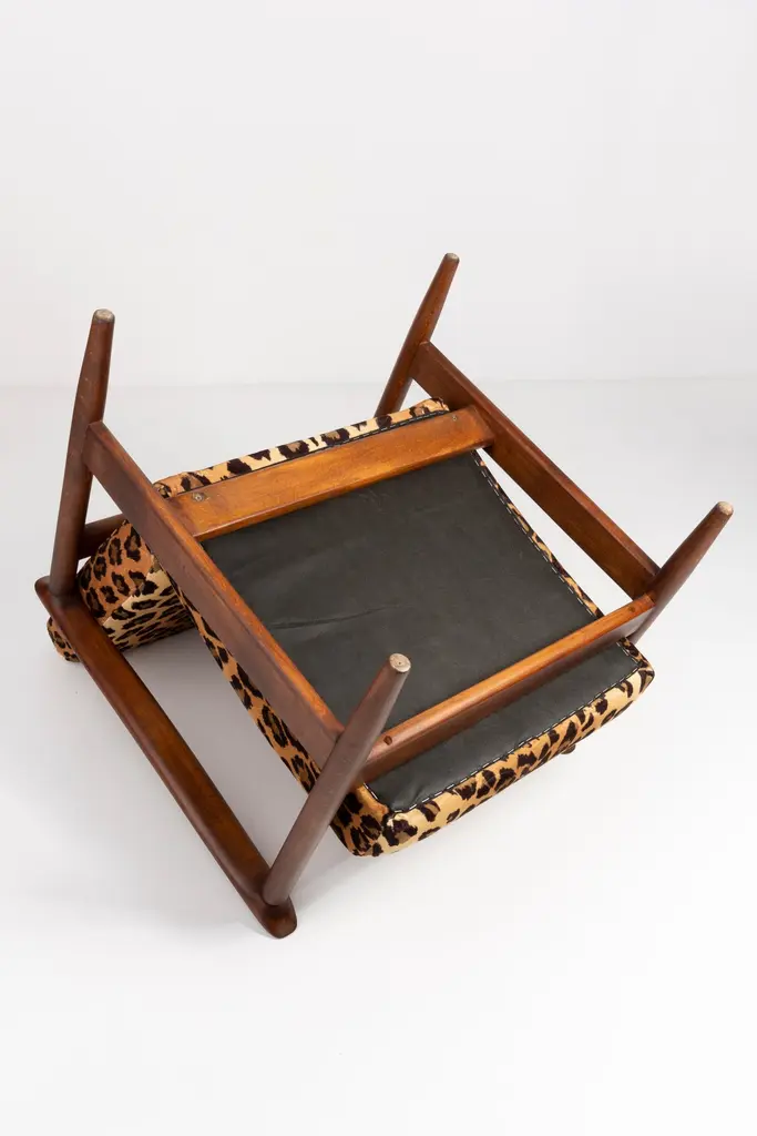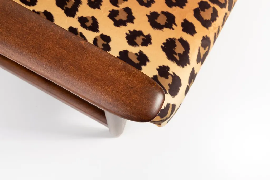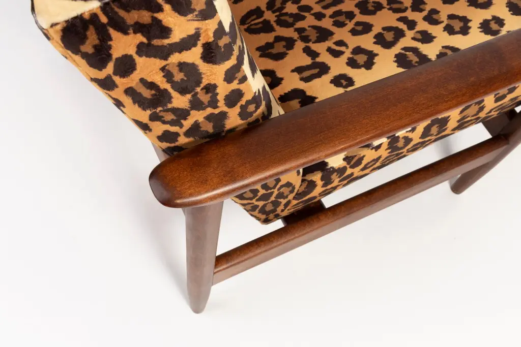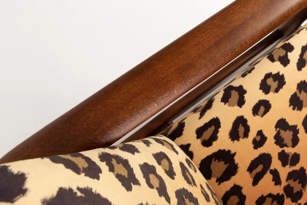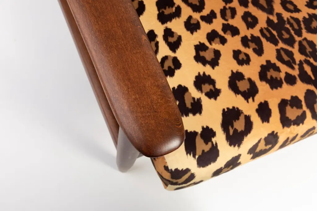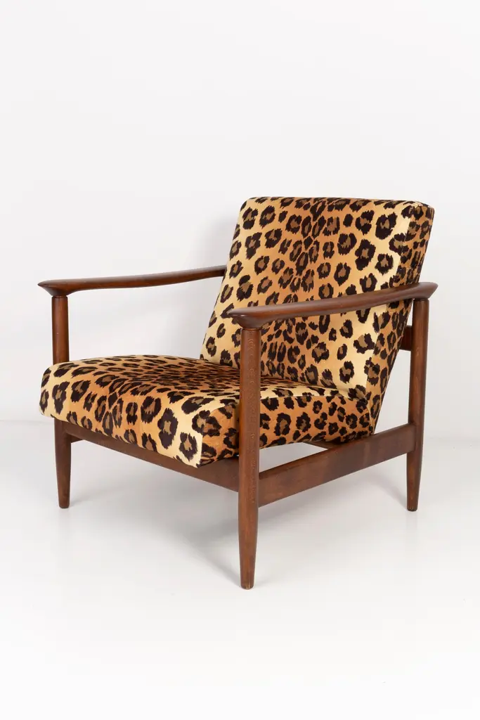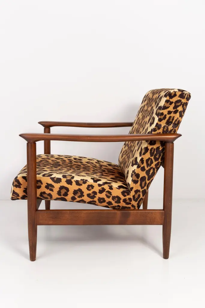 A pair of armchairs GFM-142 leopard armchairs, designed by Edmund Homa, a polish architect, designer of Industrial Design and interior architecture, professor at the Academy of Fine Arts in Gdansk.The armchairs were made in the 1960s in the Gosciecinska furniture factory. They are made from solid beech wood. The GFM-142 armchair is regarded one of the best polish armchair design from the previous age. The armchairs have been thoroughly renovated. The tension belts have been changed, new upholstery foams, leopard velvet upholstery it's Italian fabric of the highest quality.