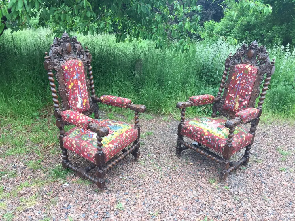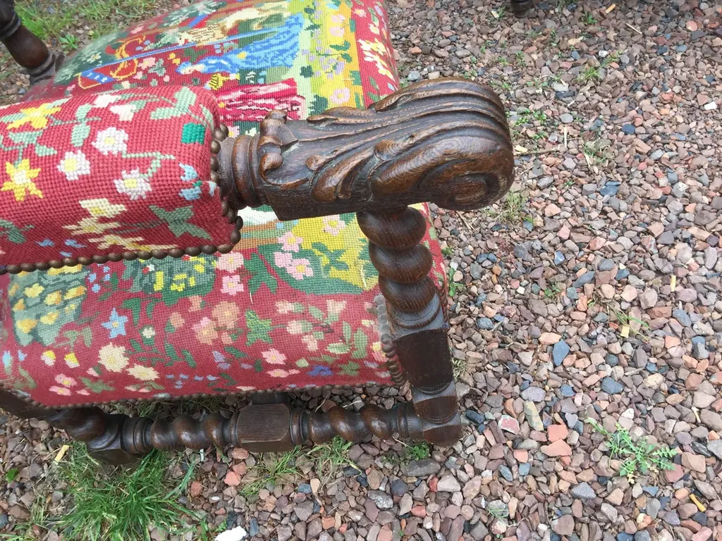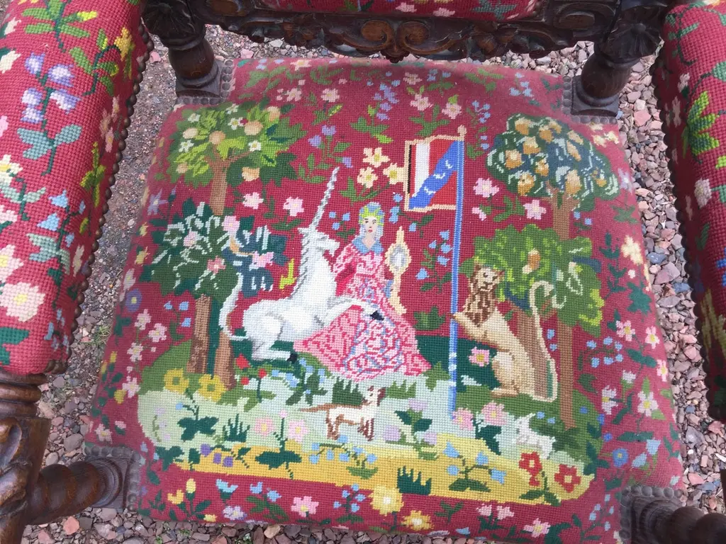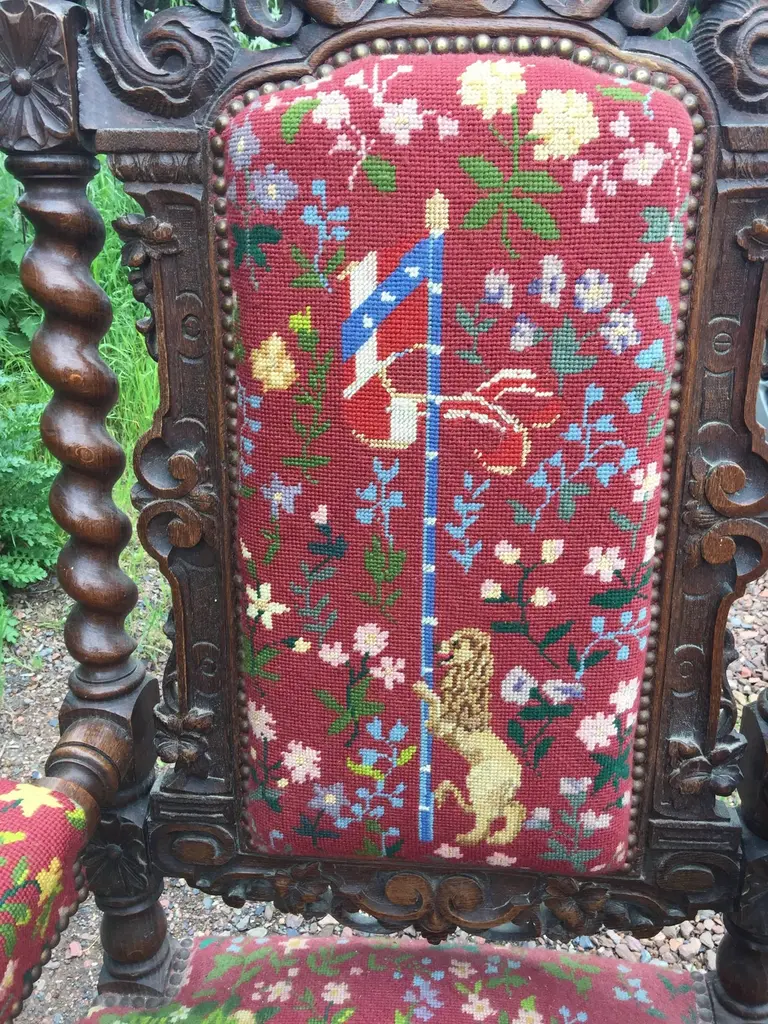 two Louis XIII style oak armchairs, circa 1900Different tapestry on each armchair.