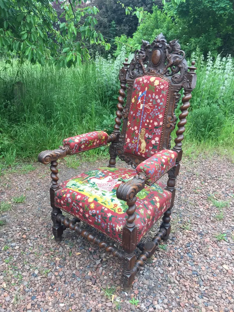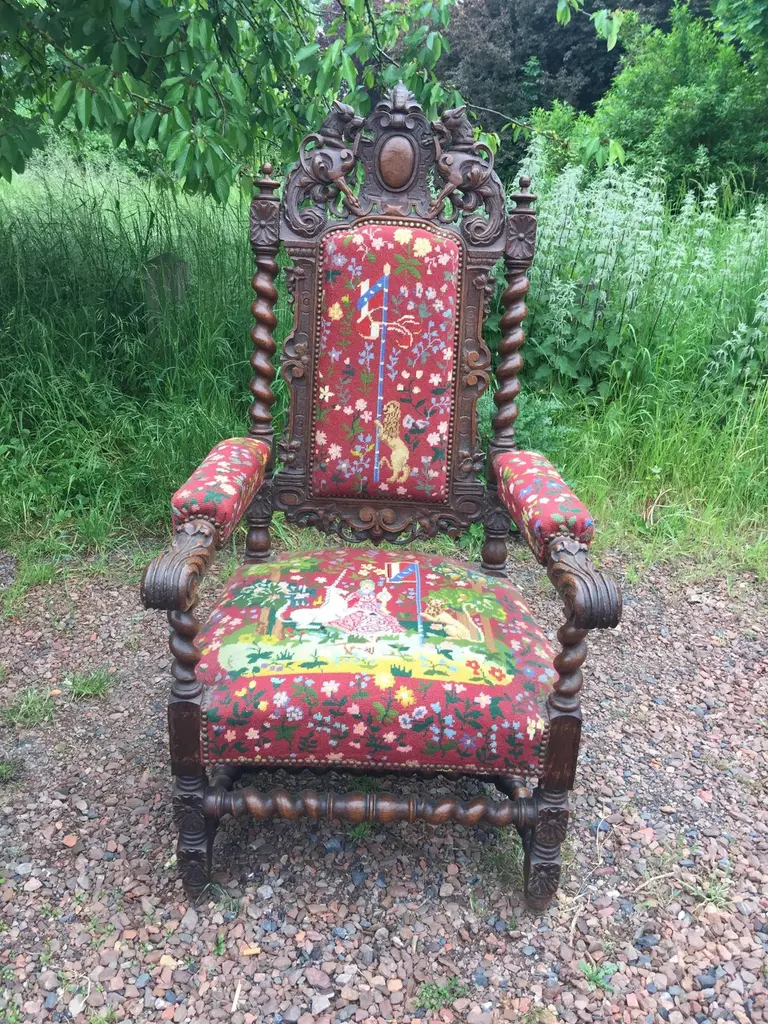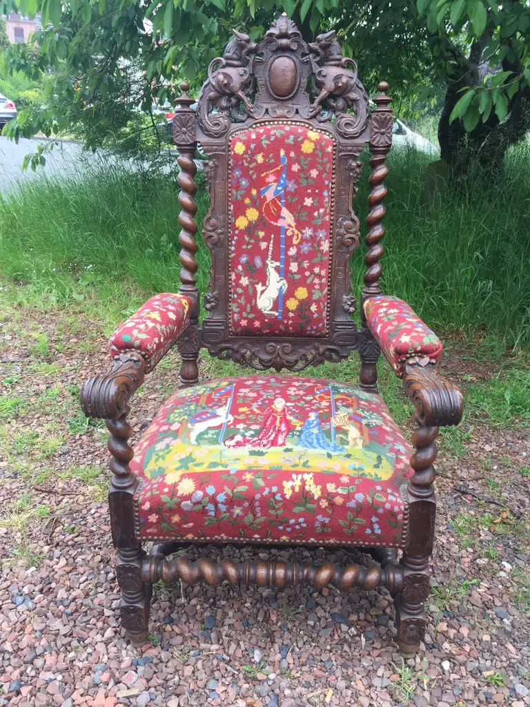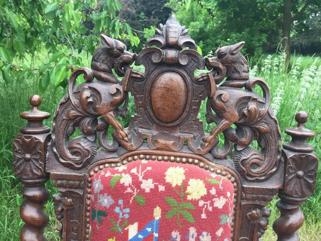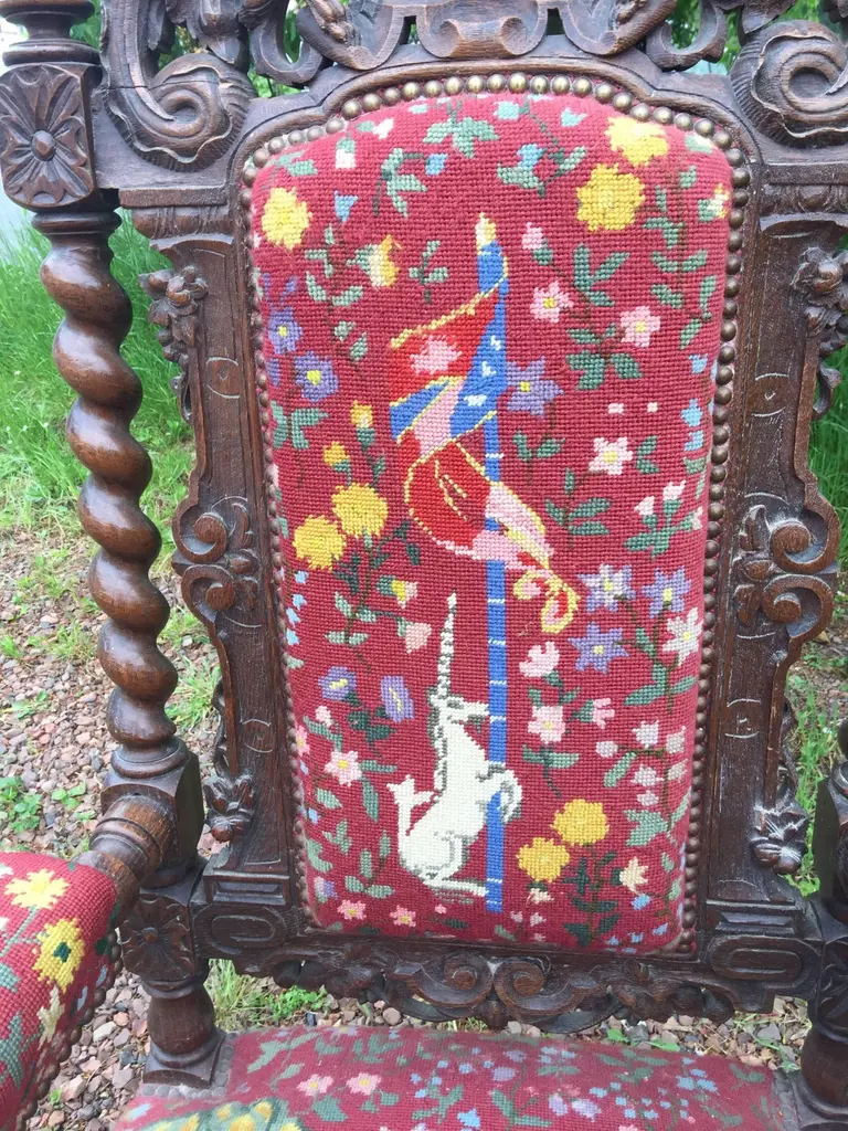 two Louis XIII style oak armchairs, circa 1900Different tapestry on each armchair.