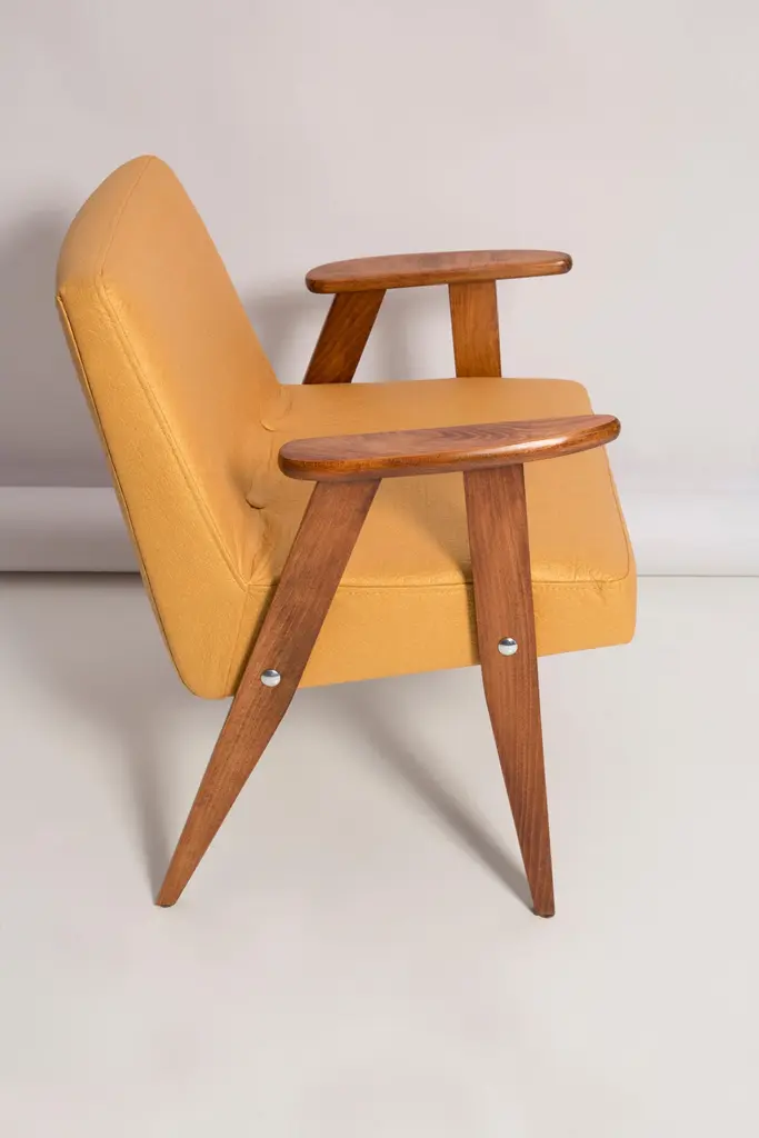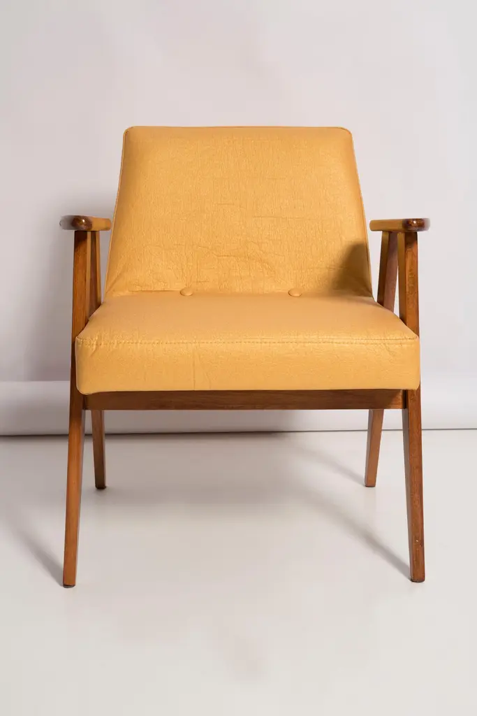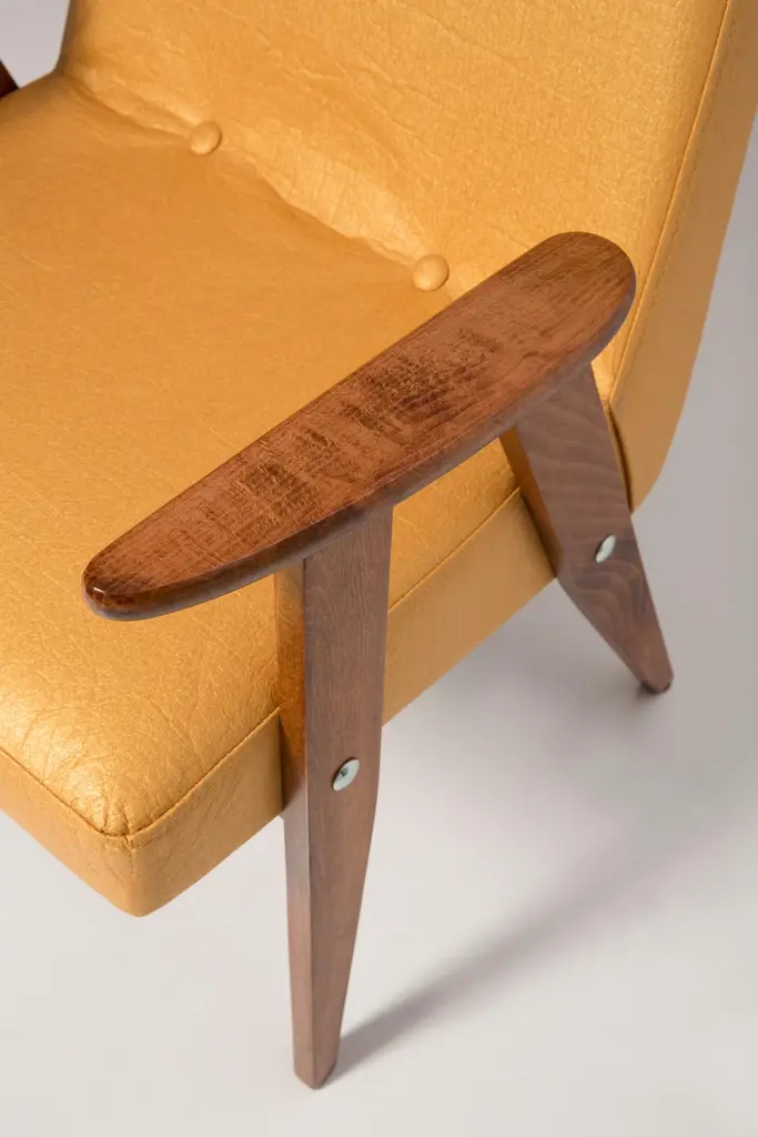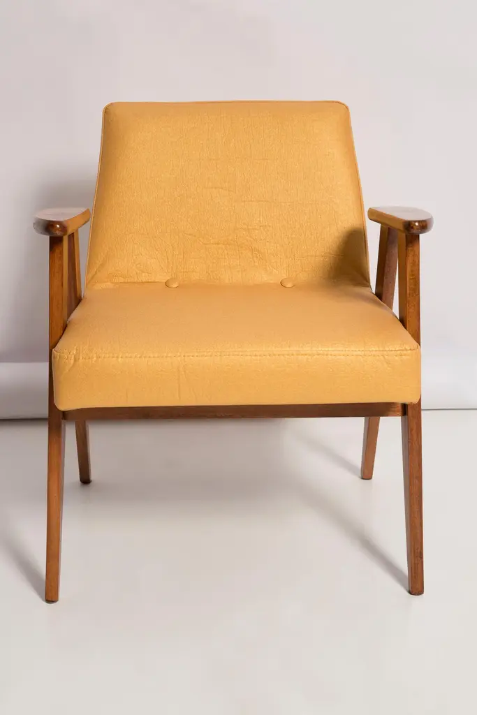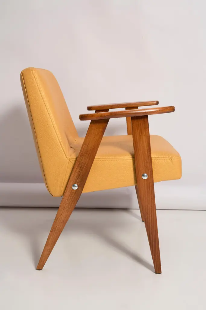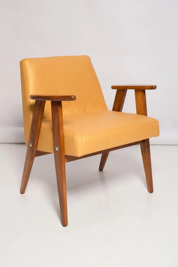The 366 armchair is an icon of the polish design of the PRL period.The famous armchair was designed in 1962 by the Polish interior designer and furniture designer Jozef Marian Chierowski. Produced in the Lower Silesian Furniture Factory in Swiebodzice.The chair has a simple, modernist form. It consists of an upholstered seat combined with a wooden backrest. The organic shape is typical of the 1960s style.The chair is very ergonomic and comfortable, as the furniture designs of that time were largely focused on the user. Due to its small size, the furniture fits perfectly into the interiors of contemporary apartments, perfectly meeting the needs of customers.Piñatex which we used for renovation is made of ?bre from the waste leaves of the pineapple plant. These leaves are a by-product from existing pineapple harvest, so the raw material requires no additional environmental resources to produce. 100% vegan! The chair is in perfect condition after a professional renovation. We can prepare this set also in another wood and pinatex color.Here available set of two.