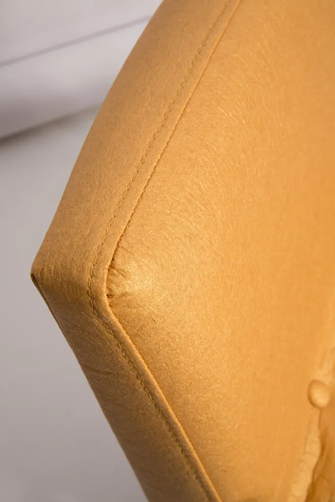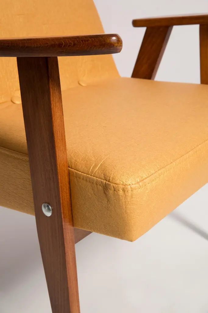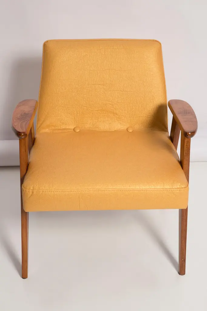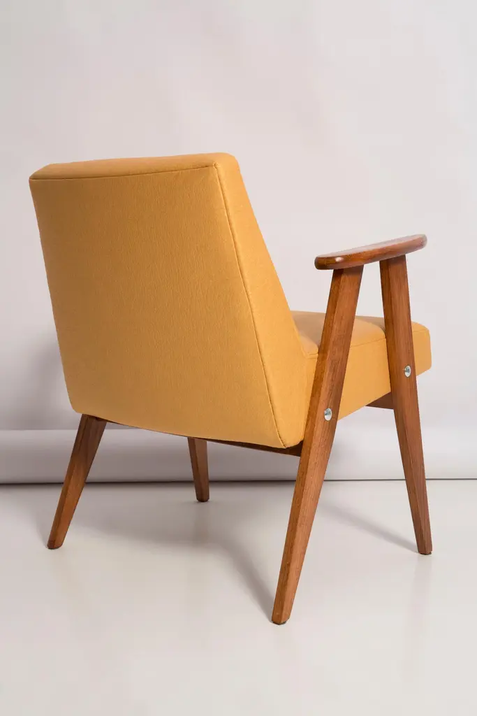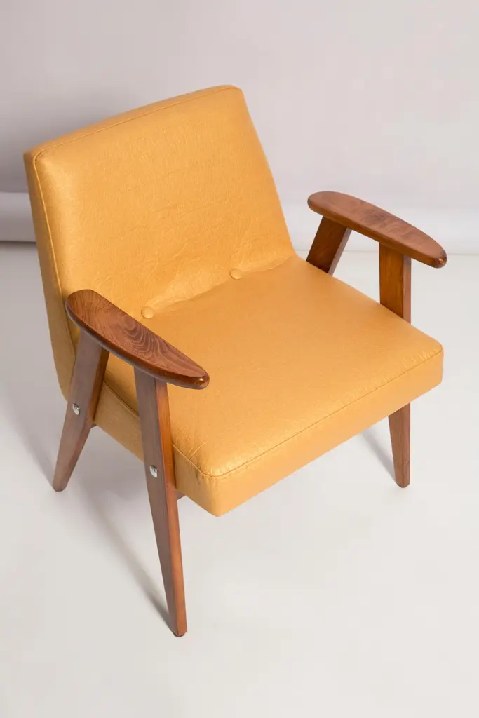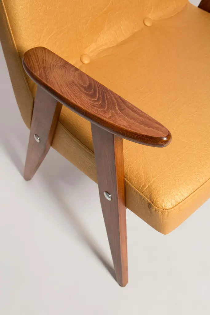 The 366 armchair is an icon of the polish design of the PRL period.The famous armchair was designed in 1962 by the Polish interior designer and furniture designer Jozef Marian Chierowski. Produced in the Lower Silesian Furniture Factory in Swiebodzice.The chair has a simple, modernist form. It consists of an upholstered seat combined with a wooden backrest. The organic shape is typical of the 1960s style.The chair is very ergonomic and comfortable, as the furniture designs of that time were largely focused on the user. Due to its small size, the furniture fits perfectly into the interiors of contemporary apartments, perfectly meeting the needs of customers.Piñatex which we used for renovation is made of ?bre from the waste leaves of the pineapple plant. These leaves are a by-product from existing pineapple harvest, so the raw material requires no additional environmental resources to produce. 100% vegan! The chair is in perfect condition after a professional renovation. We can prepare this set also in another wood and pinatex color.Here available set of two.