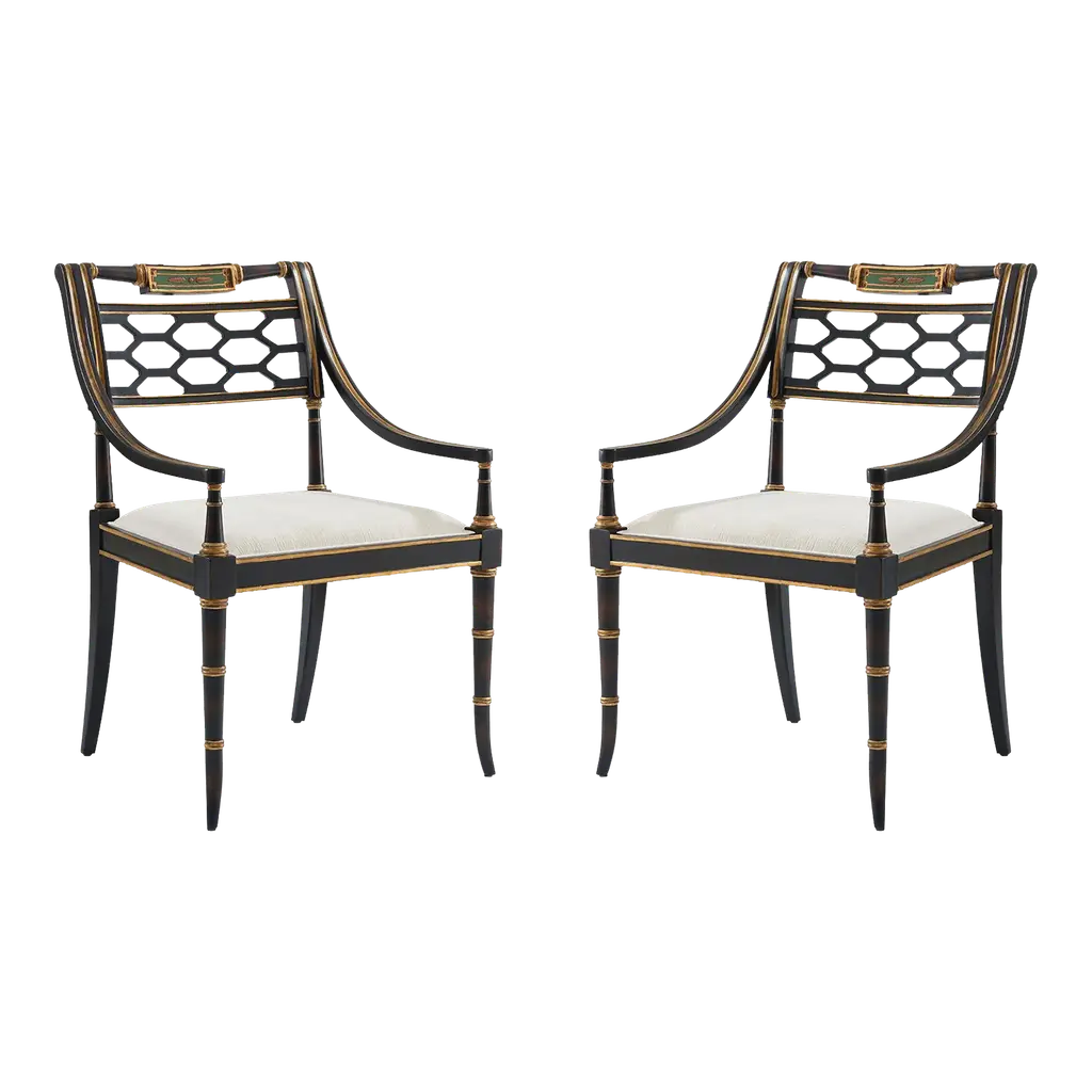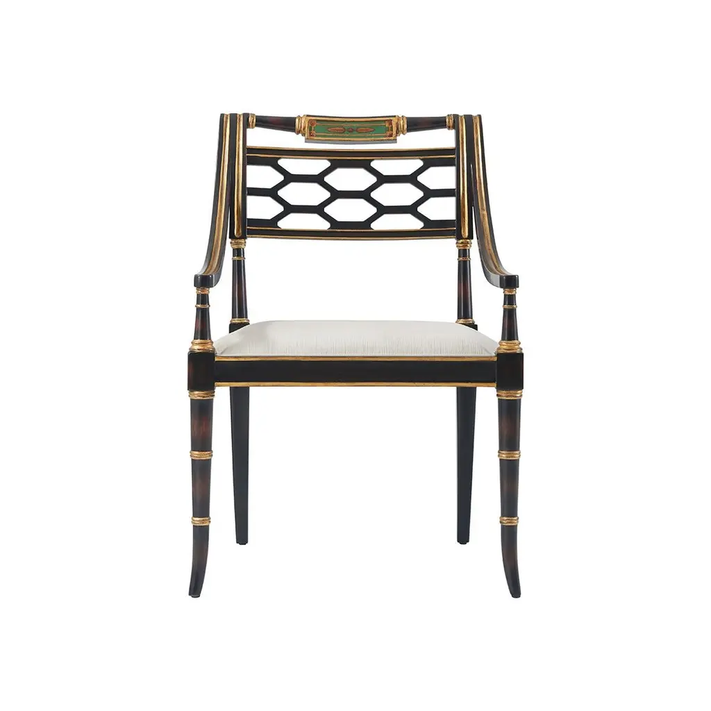 Classic English style ebonized and parcel-gilt occasional chair, the reeded, turned and bar top rail above a pierced trellis back, the upholstered drop-in seat between down swept channeled arms, on splayed ring turned legs. Dimensions: 25" W x 24.75" D x 36.75" HSeat - 19.75"Arm - 24"Shown in Alpaca - UP5329A Fabric