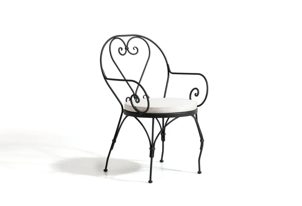 Hand forged and inspired by the Umbrian-Tuscan tradition of the late 1900s, Aurora is a classic, tra- ditional collection that, thanks to its forms, ma- nages to create a romantic, refined atmosphere. What makes it stand out is the powder-coated wrought iron frame, which encapsulates its per- fect combination of elegance and durability.The succession of soft, round forms is also mirrored in the upholstered furniture, which appears welcoming and comfortable. The cushions are removable and not integrated into the structure, to ensure proper care and maintenance.Timeless beauty and romantic lines, the Aurora collection is rich and complete; it of- fers all the elements necessary to furnish the outdoors in a timeless style.AVAILABLE WITH AND WITHOUT ARM REST
