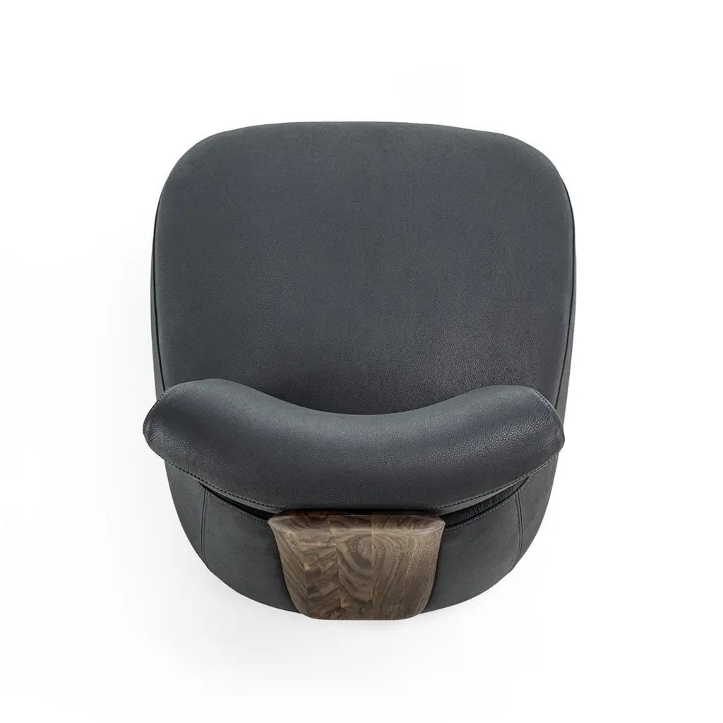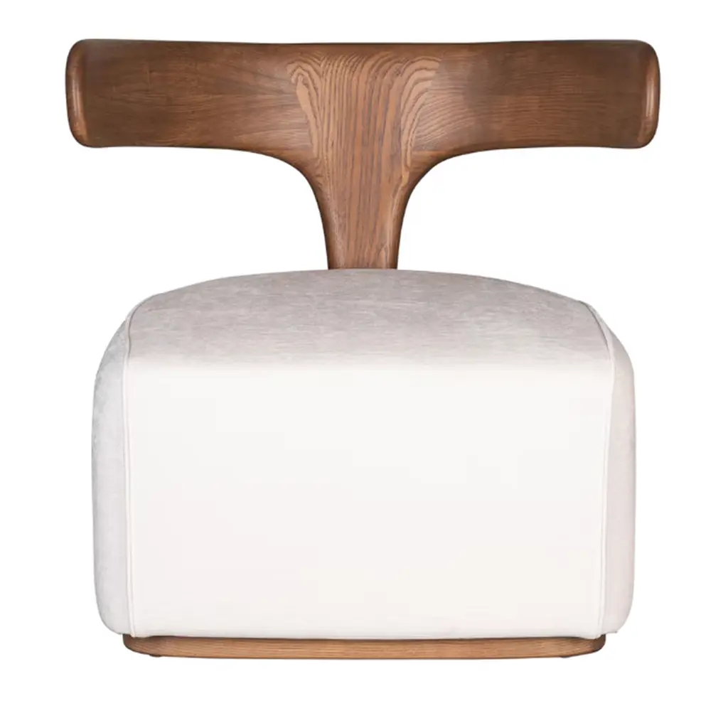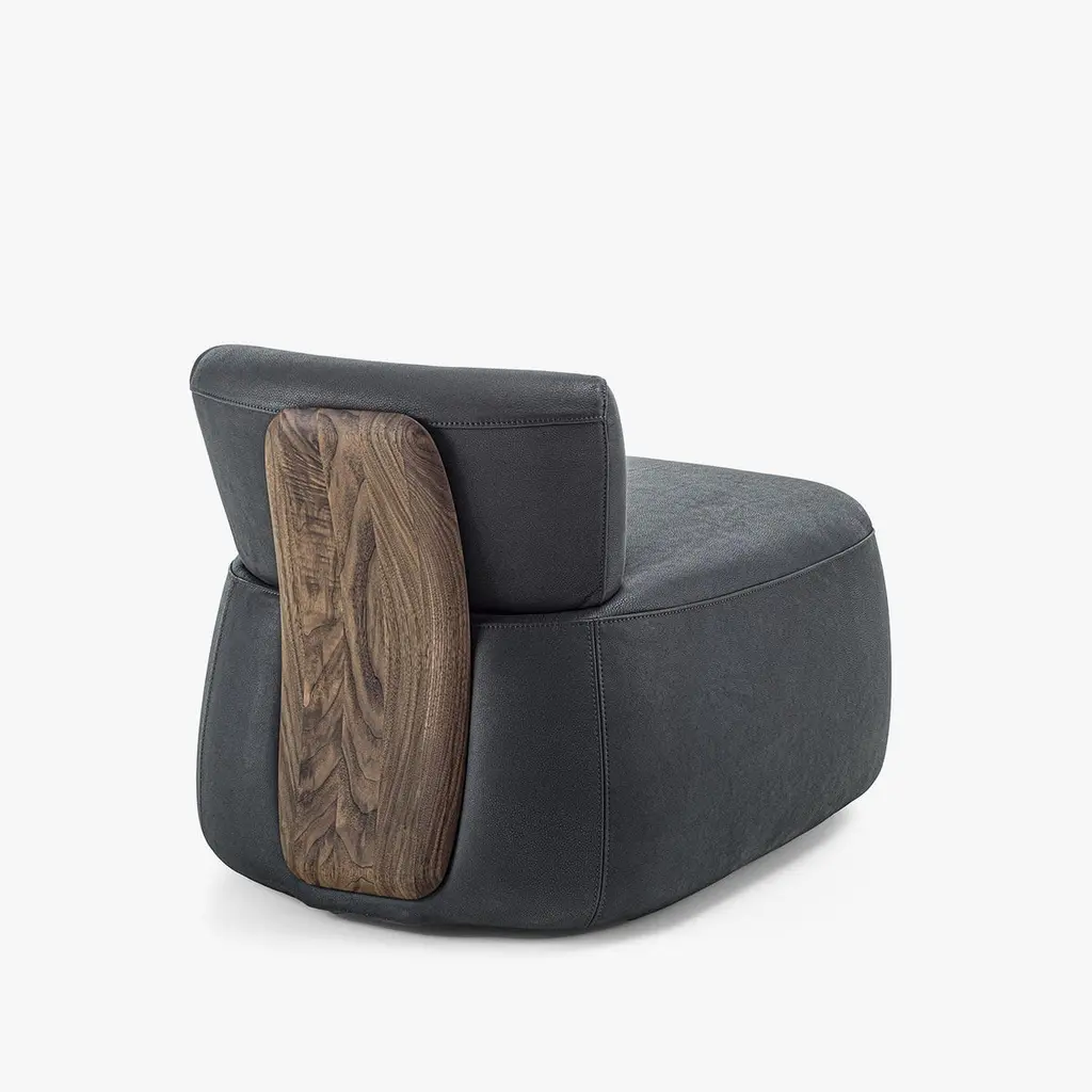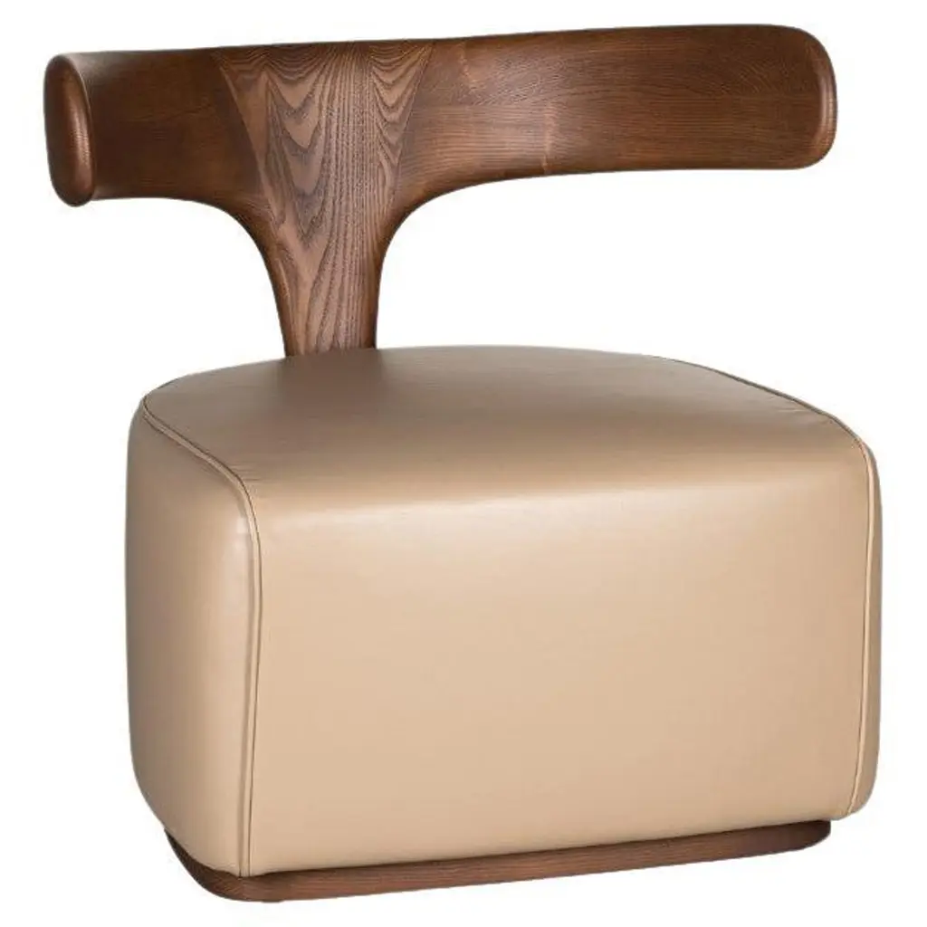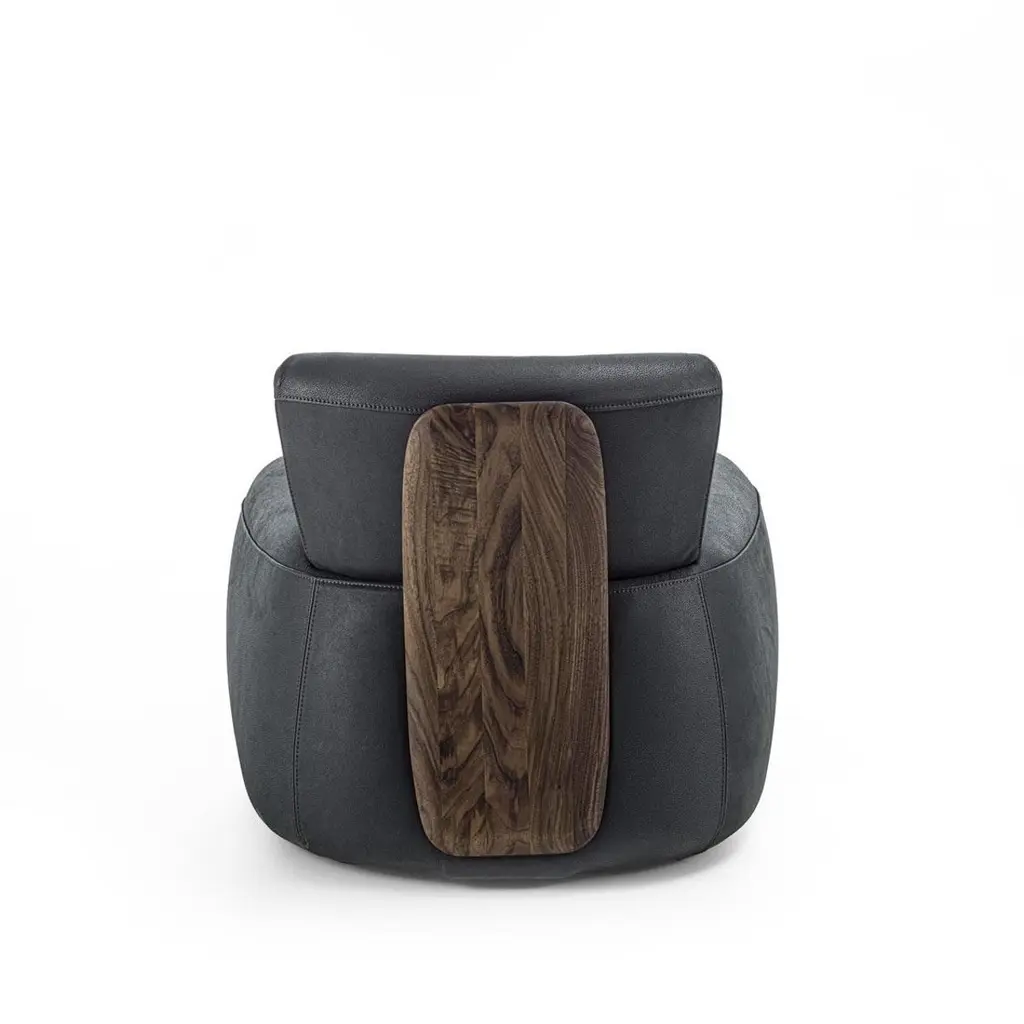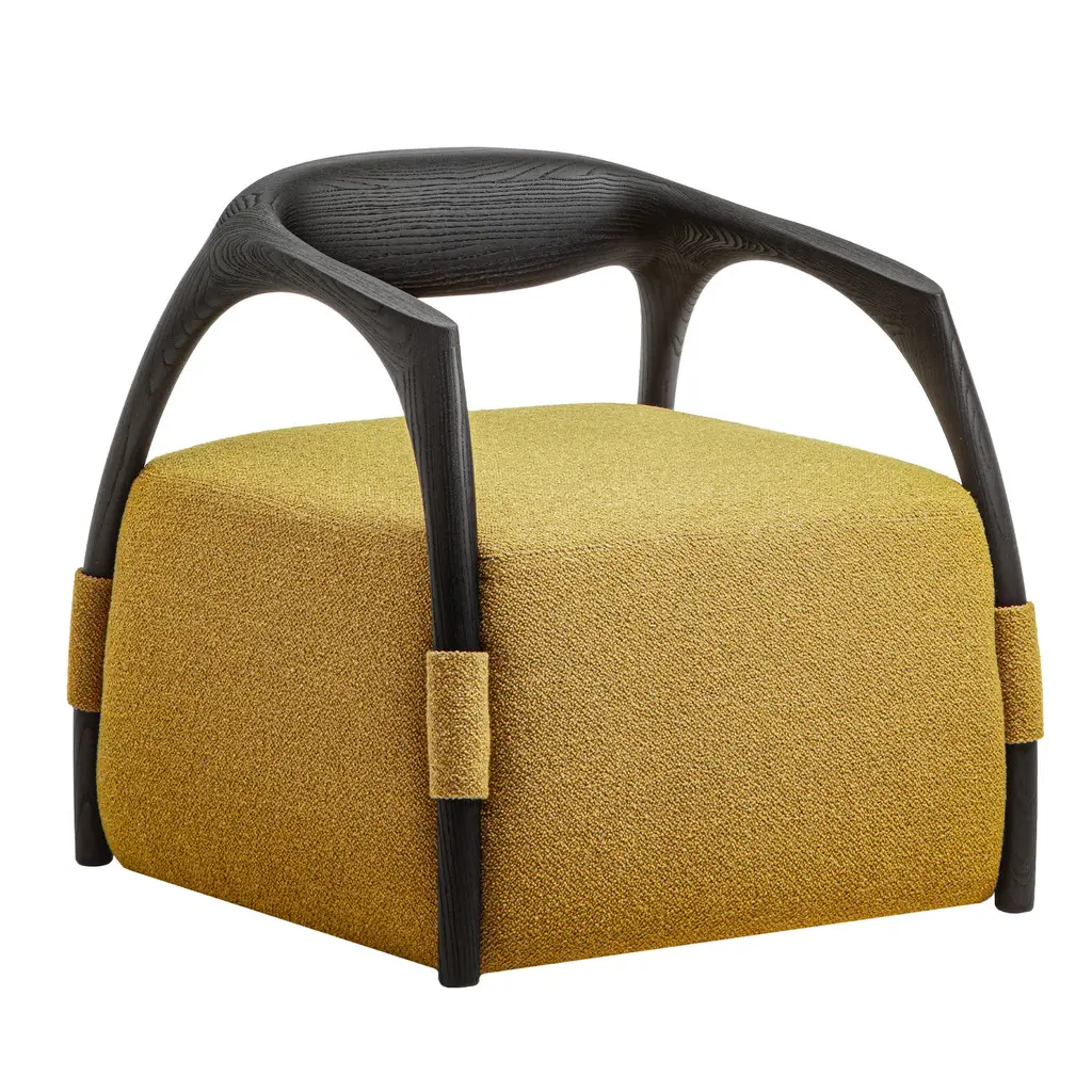 A solid wood backrest, both structural and decorative, distinguishes this upholstered armchair. Its solid, flowing wooden frame connects to the upholstered seat, creating a visual and functional relationship between the two padded volumes. The design explores the contrast between the soft upholstery and the strong wood material.Please contact us if you have any questions about customization and pricing. We will be glad to check with the factory’s technical team if sizes, finishes, and colors can be customized. We do our best to expedite production and to ship and deliver product within the listed lead time, however current lead times might be longer due to global shipping backlog and delays. These delays are out of our control and cannot be a reason to cancel an order.Our pricing includes all costs for international shipping to the U.S., as well as duties and customs clearance fees. Please be aware that local delivery within the U.S. is not included. We offer white glove, front door, and warehouse delivery options. For shipments outside the U.S., kindly reach out to us for a detailed quote.