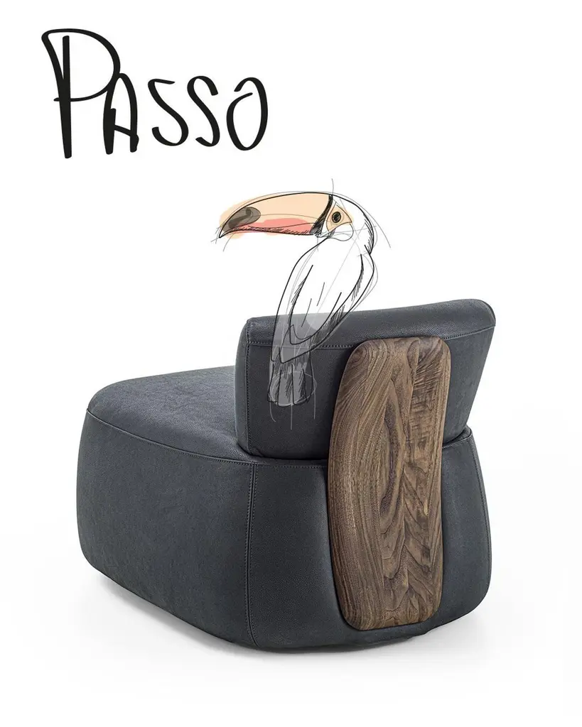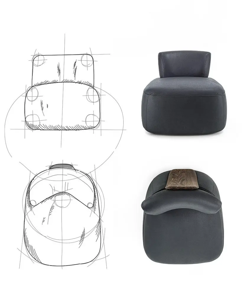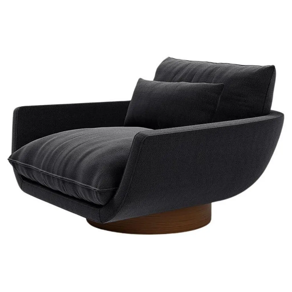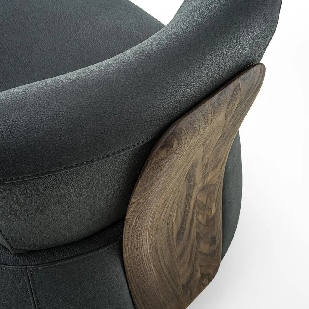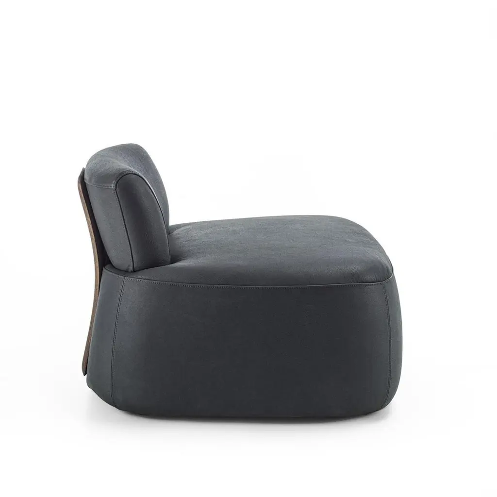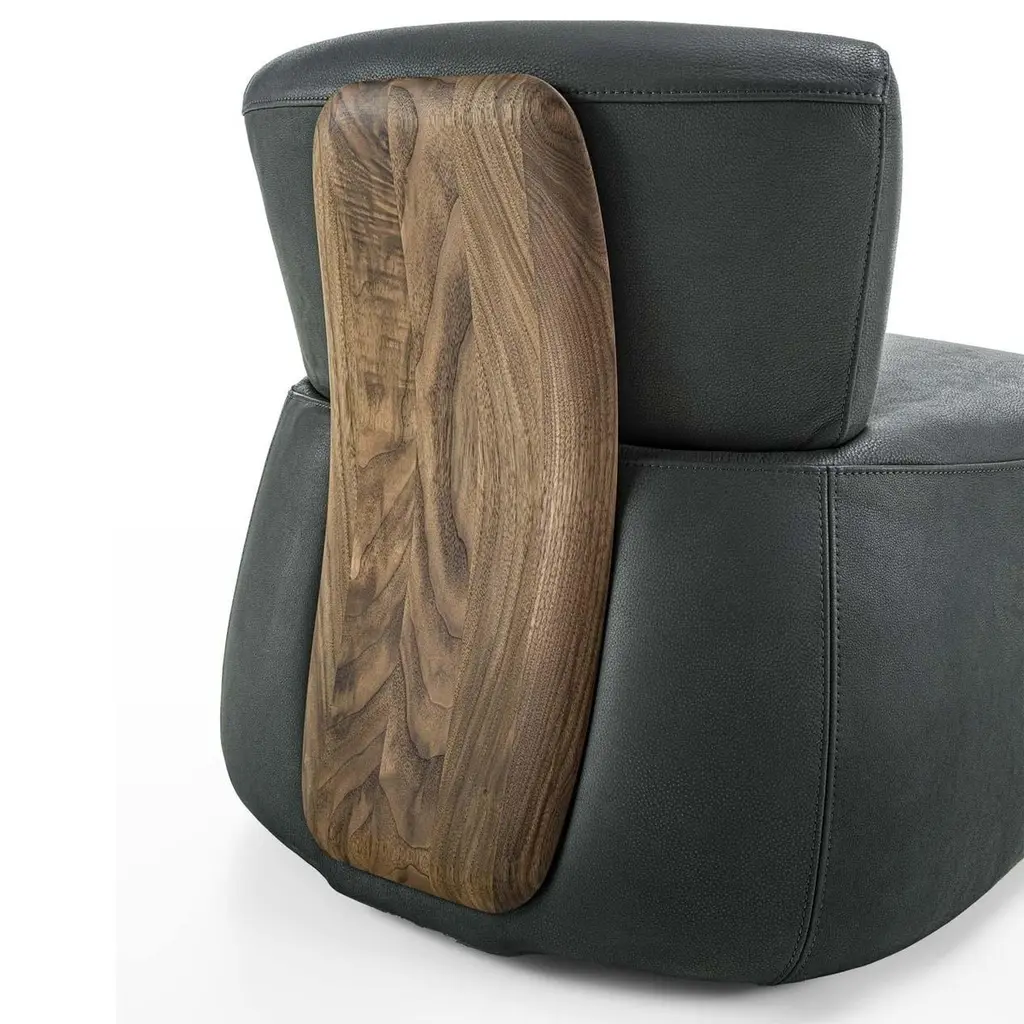 A solid wood backrest, both structural and decorative, distinguishes this upholstered armchair. Its solid, flowing wooden frame connects to the upholstered seat, creating a visual and functional relationship between the two padded volumes. The design explores the contrast between the soft upholstery and the strong wood material.Please contact us if you have any questions about customization and pricing. We will be glad to check with the factory’s technical team if sizes, finishes, and colors can be customized. We do our best to expedite production and to ship and deliver product within the listed lead time, however current lead times might be longer due to global shipping backlog and delays. These delays are out of our control and cannot be a reason to cancel an order.Our pricing includes all costs for international shipping to the U.S., as well as duties and customs clearance fees. Please be aware that local delivery within the U.S. is not included. We offer white glove, front door, and warehouse delivery options. For shipments outside the U.S., kindly reach out to us for a detailed quote.