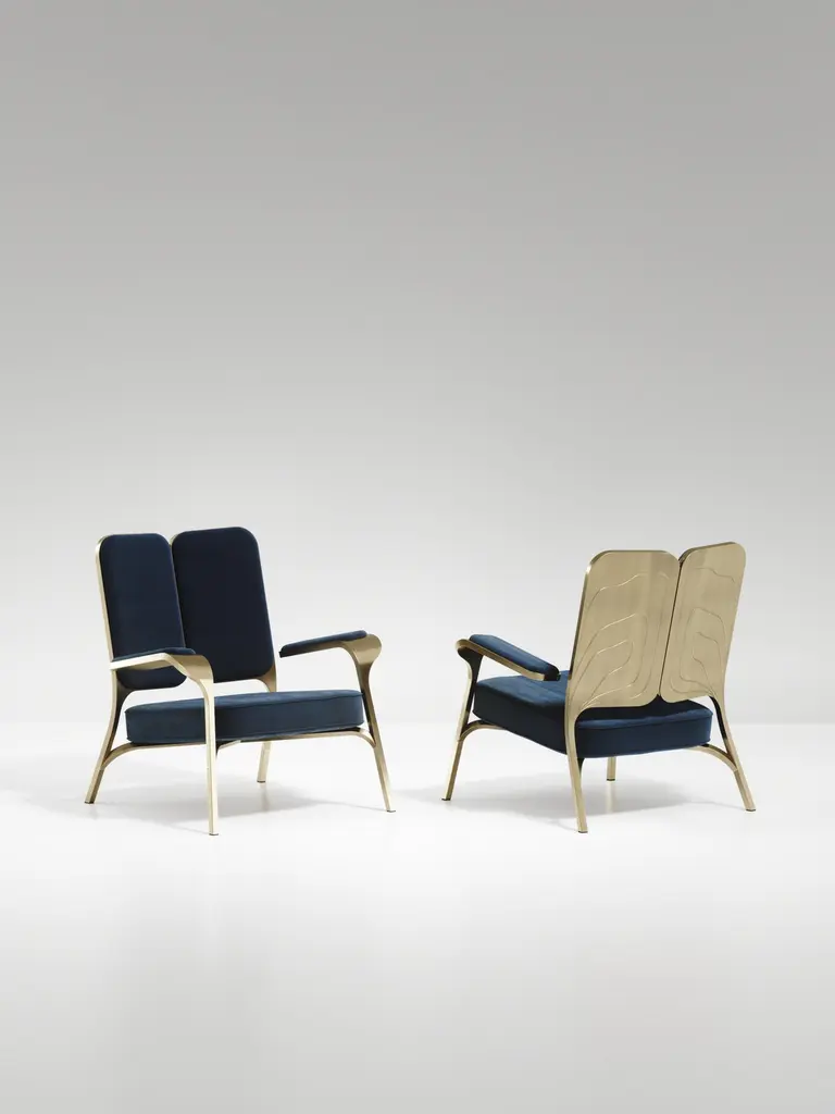 The Paris based label has distinguished themselves since their launch, with their iconic use of shagreen mixed with brass and other exotic materials. All furniture is handcrafted by skilled artisans, ultimately making each piece unique, designed in Paris and produced in the Philippines.The Set of 2 Gingko armchairs by R & Y Augousti are elegant and whimsical pieces. The cream linen upholstered pieces provide comfort while exuding a playful aesthetic in its abstract nod to a butterfly with the form of its backrest and intricate engraving details. Custom finishing/sizing available on requestThe dimensions of this piece are :Armchair- 76 cm x 73 cm x 36.5 cm (seat height) / 80 cm (backrest height)All R & Y Augousti pieces are handmade by artisans, ultimately making each piece unique.Wipe clean with soft dry cloth.Acclaimed design duo Ria & Yiouri Augousti have established themselves since the 1990s as pioneers of modern-vintage style through their luxurious Art Deco inspired collections.The Paris based label has distinguished themselves since their launch, with their iconic use of shagreen mixed with brass and other exotic materials. All furniture is handcrafted by skilled artisans, ultimately making each piece unique. All shagreen-covered items should be kept out of direct sunlight, color variants may occur on the stingray and other exotic finishes, but this showcases the Parisian label's commitment to creating authentic luxurious products using natural components.