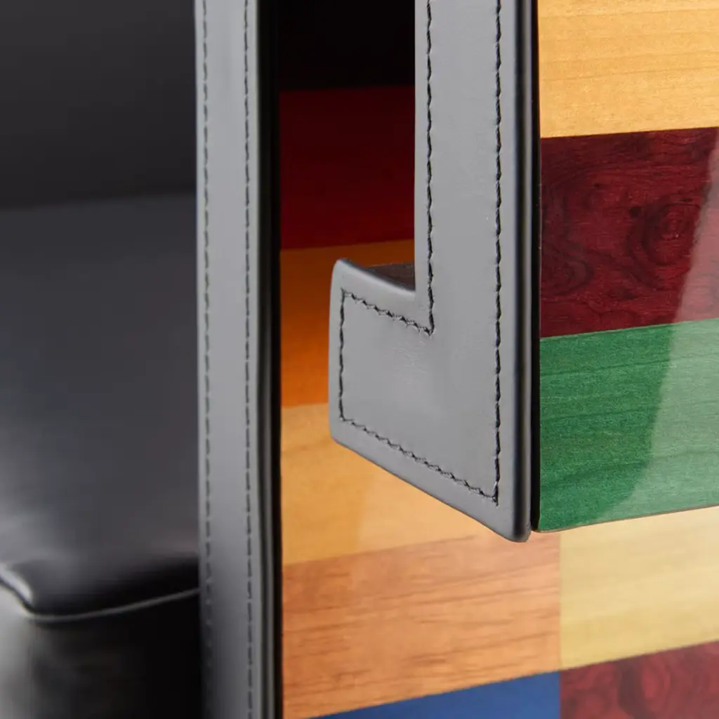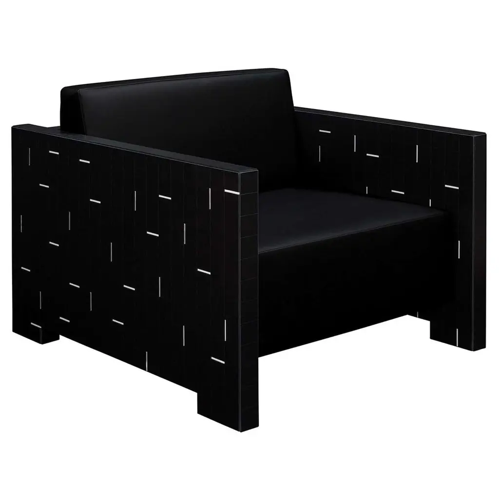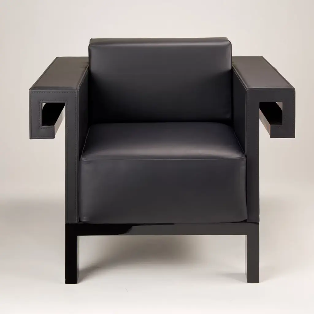 Designed to impress, this refined armchair from the Venezia Collection is where the rigor of sharp angularities meets the liveliness of polychrome inlays extending throughout the veneered back and sides. Its plush cushioned seat, backrest, and armrests have their comfort maximized by the fine black leather upholstery minutely sewn by hand. Consult the Concierge for customization options.