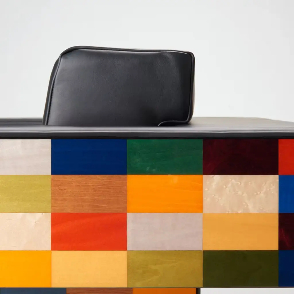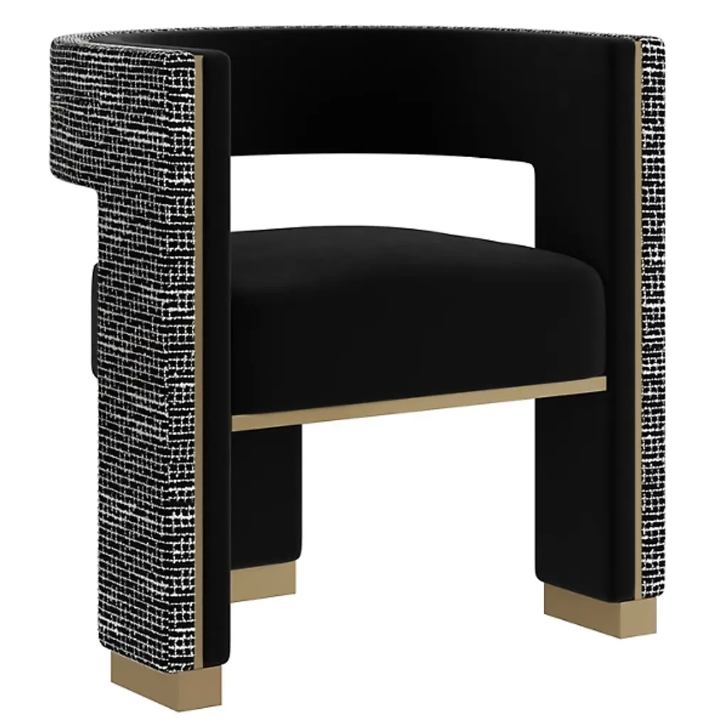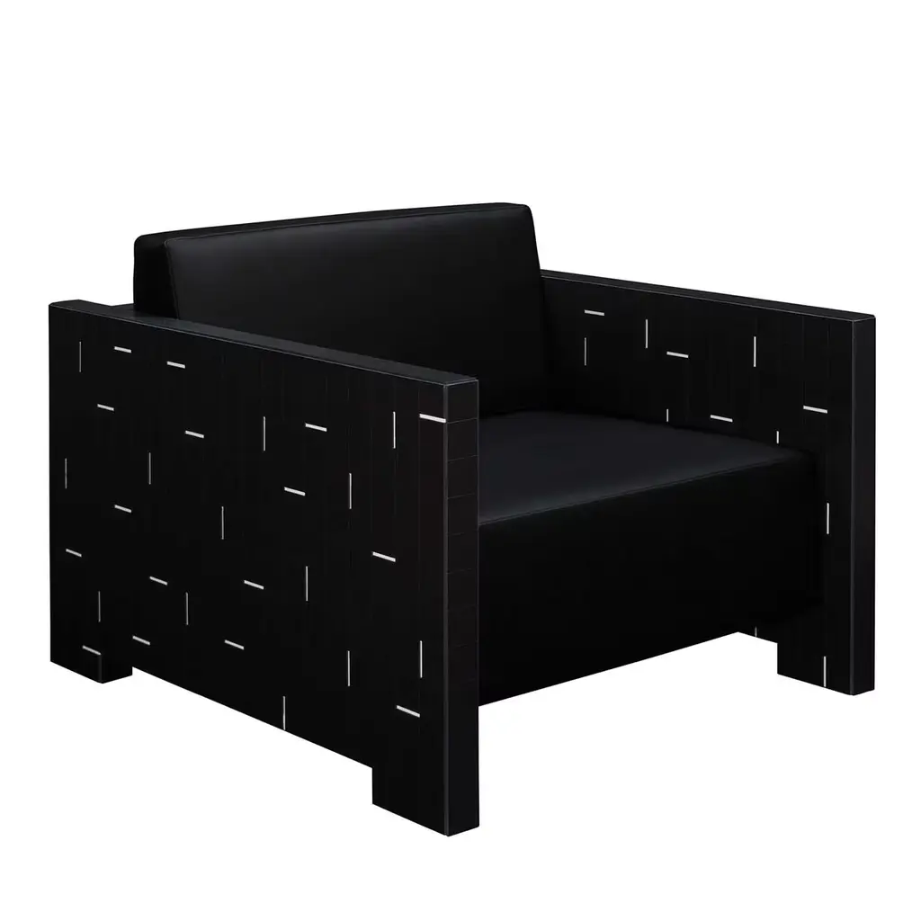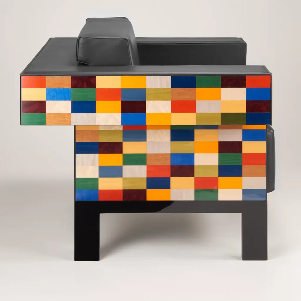 Designed to impress, this refined armchair from the Venezia Collection is where the rigor of sharp angularities meets the liveliness of polychrome inlays extending throughout the veneered back and sides. Its plush cushioned seat, backrest, and armrests have their comfort maximized by the fine black leather upholstery minutely sewn by hand. Consult the Concierge for customization options.