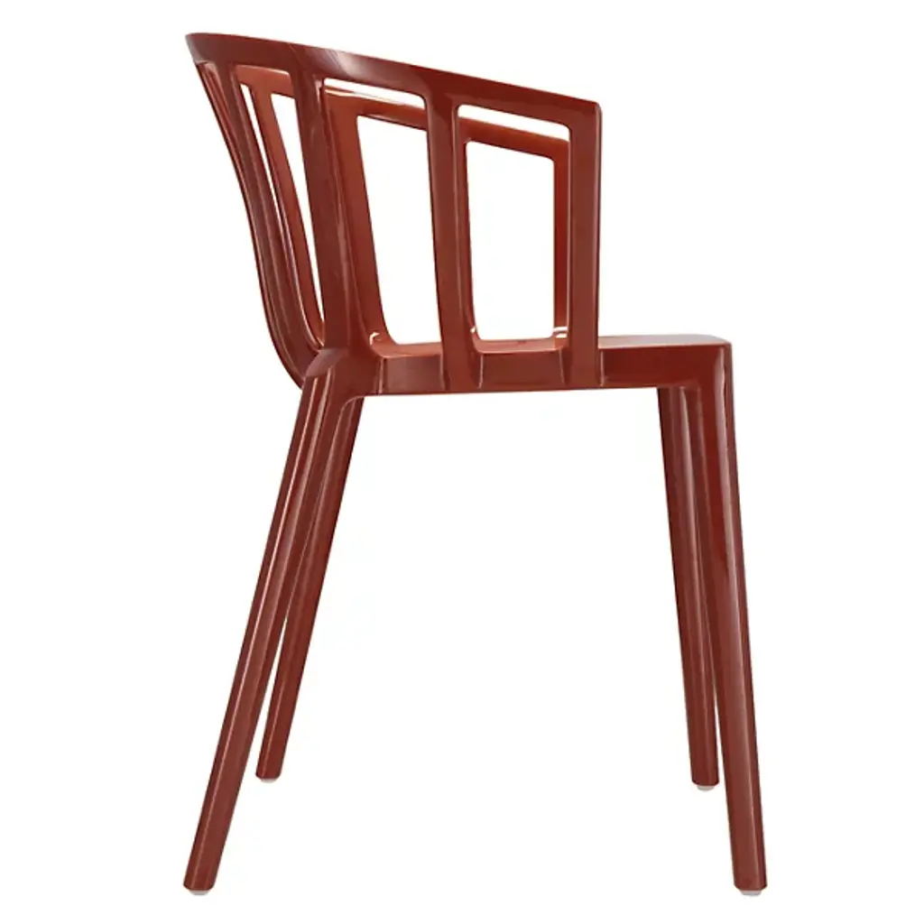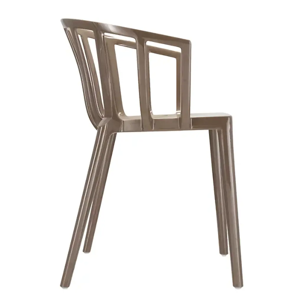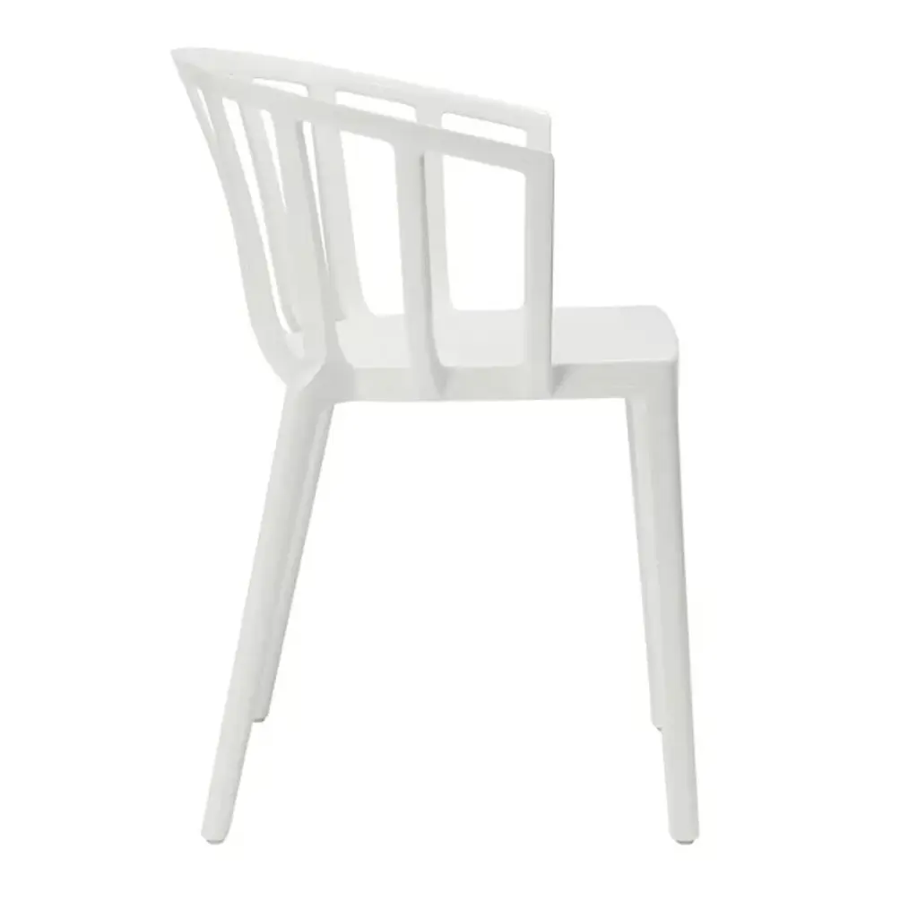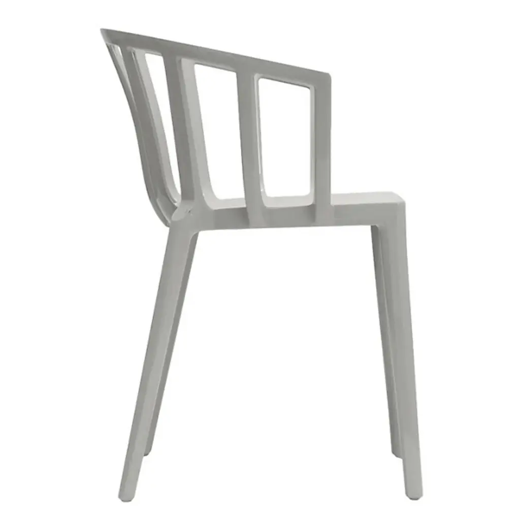 The Venice Armchair by Kartell is a tribute to the city of Venice, bringing classic lines and comfort to a range of spaces. Created by French industrial architect and designer, Philippe Starck, this elegant armchair was inspired by a bar in Venice he used to frequent, where he learned that the secret to seating many people at a table was small armchairs lower than all the others. Simple legs support a smooth seat and softly rounded, low back that slopes to provide armrests, creating continuous lines and an inviting silhouette that pairs perfectly with indoor and outdoor seating arrangements.