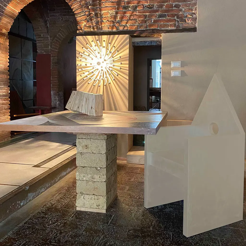 Flaunting a sophisticated gray-beige chromatic blend, this acclaimed Vescovina armchair is an iconic postmodern piece designed by Lanfranco Benvenuti in 1985 and revived in a new limited edition and numbered series Showcasing a bishop's chair-inspired silhouette, it is entirely handcrafted in fine wood and exquisitely hand-decorated. Available in several complementing hues, it is a true collector's item for an elegant contemporary interior.