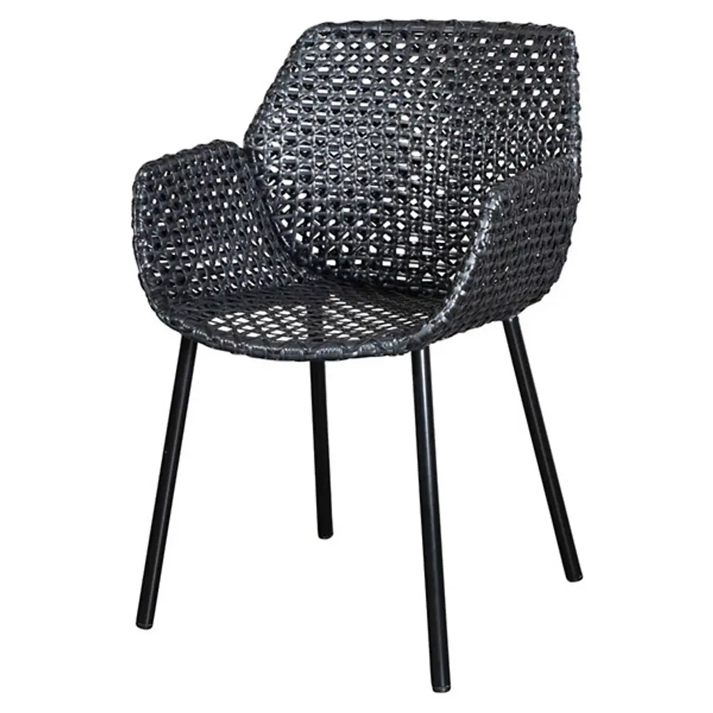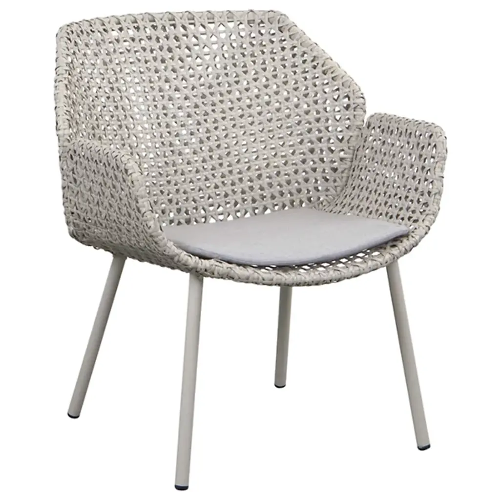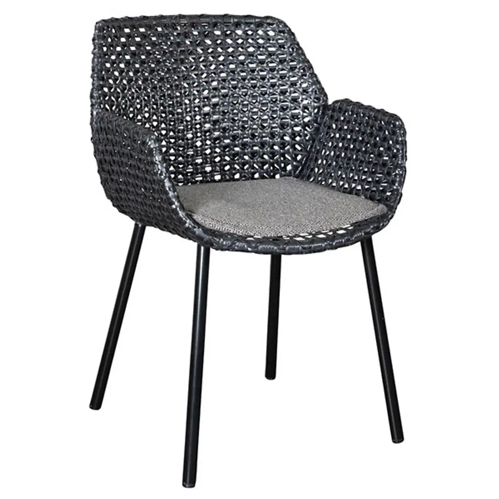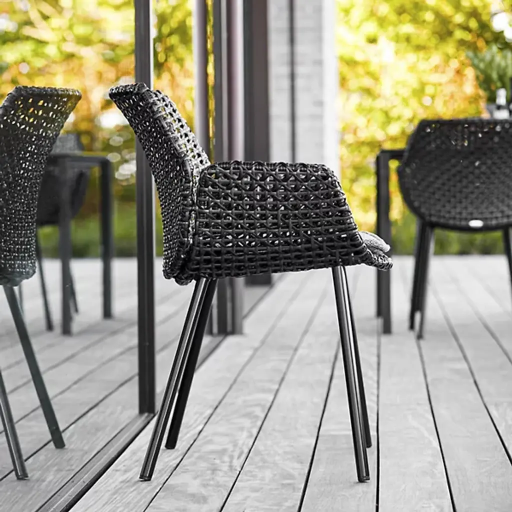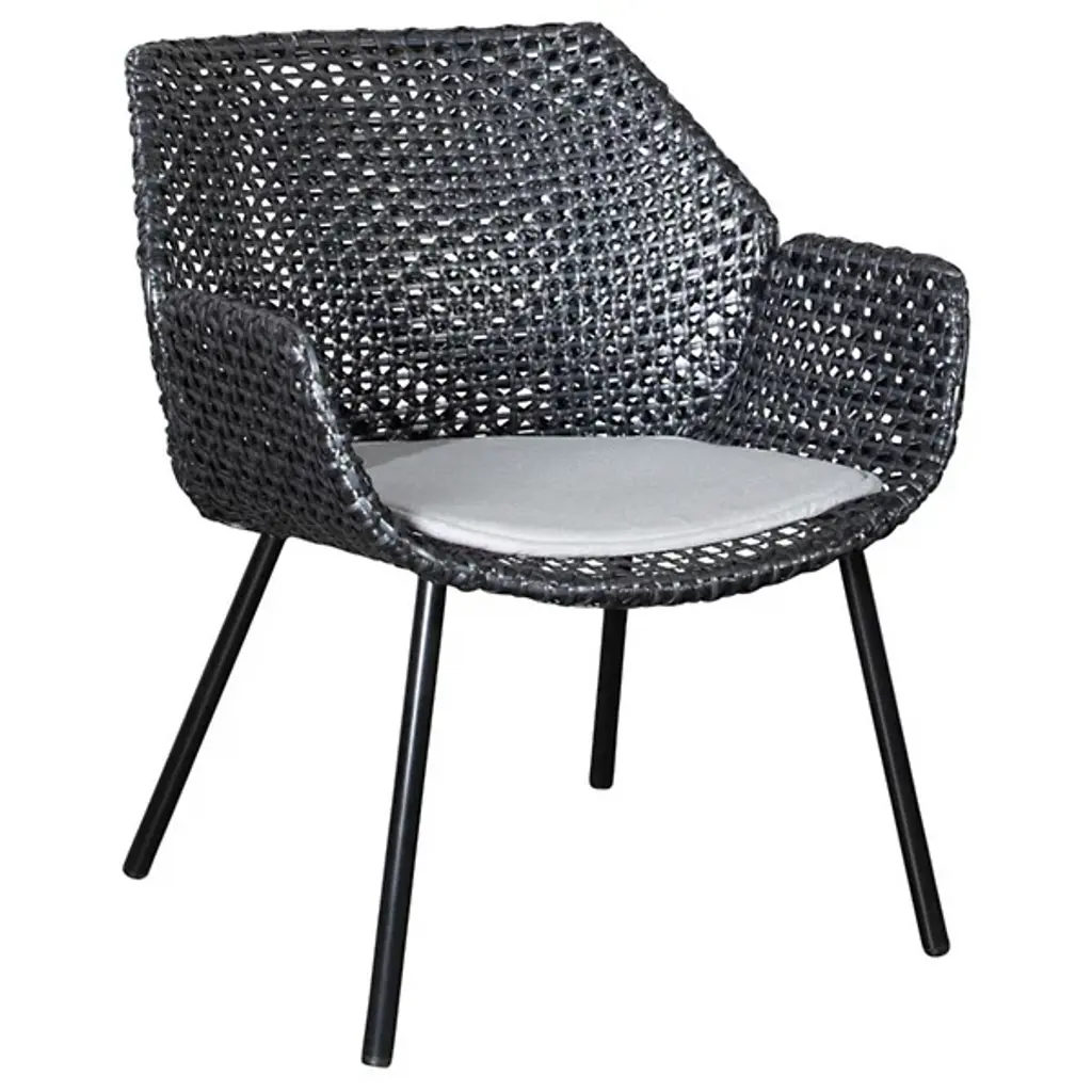 The Vibe Outdoor Armchair with Cushion from Cane-line adds handwoven charm to a contemporary creation. Designed by Welling/Ludvik, this chair shows off a slender galvanized steel frame paired with an intricate Cane-line weave made from durable polypropylene. Designed for year-round use, its gently curved, shell-like seat embraces the body, offering a light and airy presence. A quick-dry cushion rests inside for added comfort, built to withstand sun, rain, and shifting seasons, balancing an engaging, tactile texture with reliable outdoor performance.