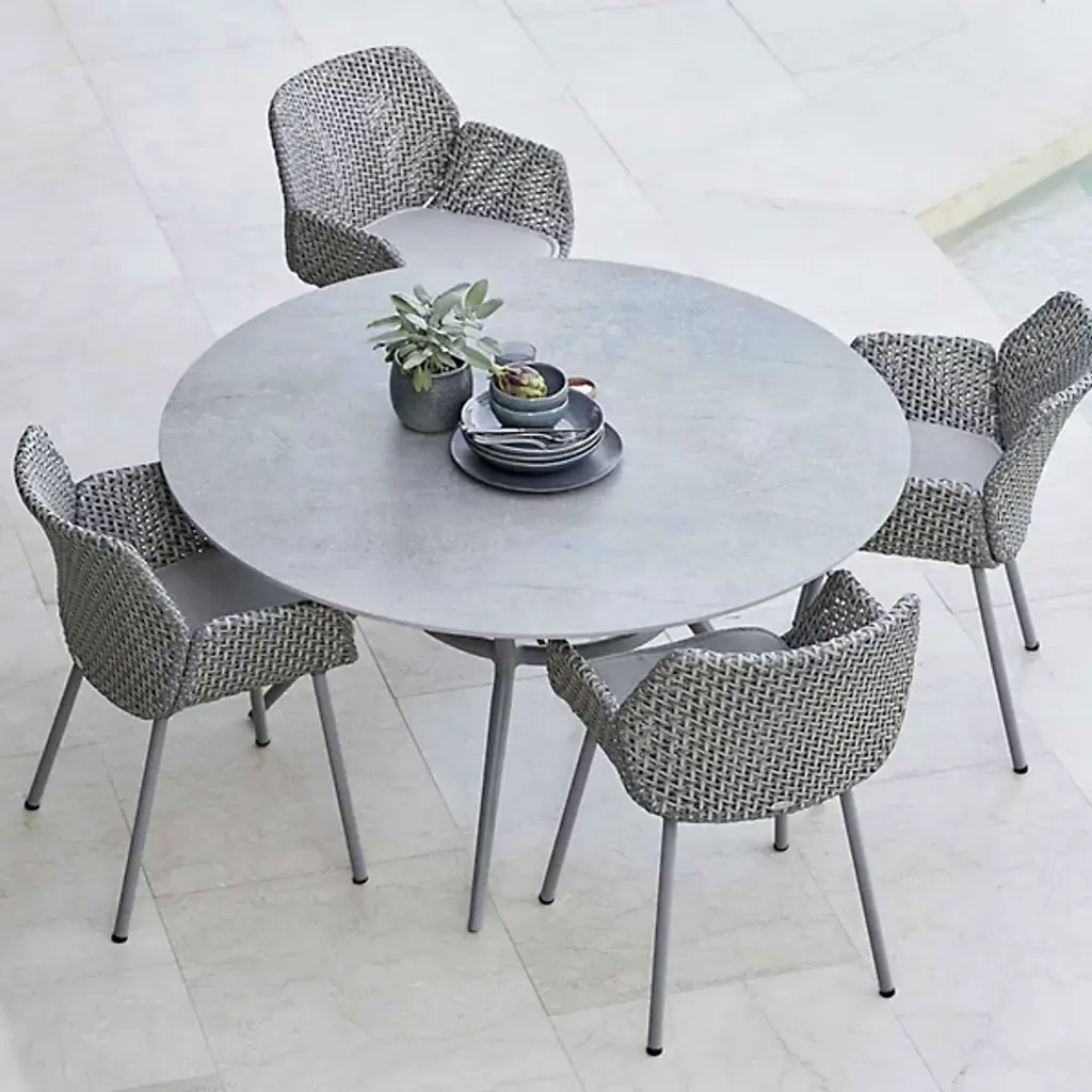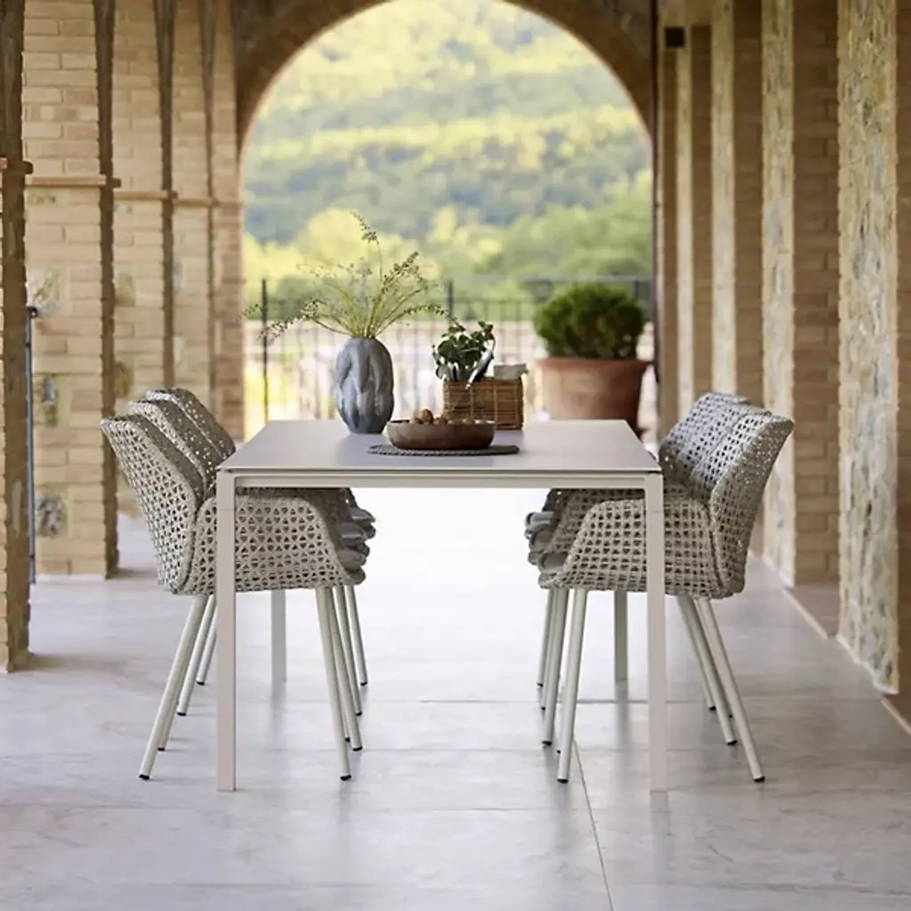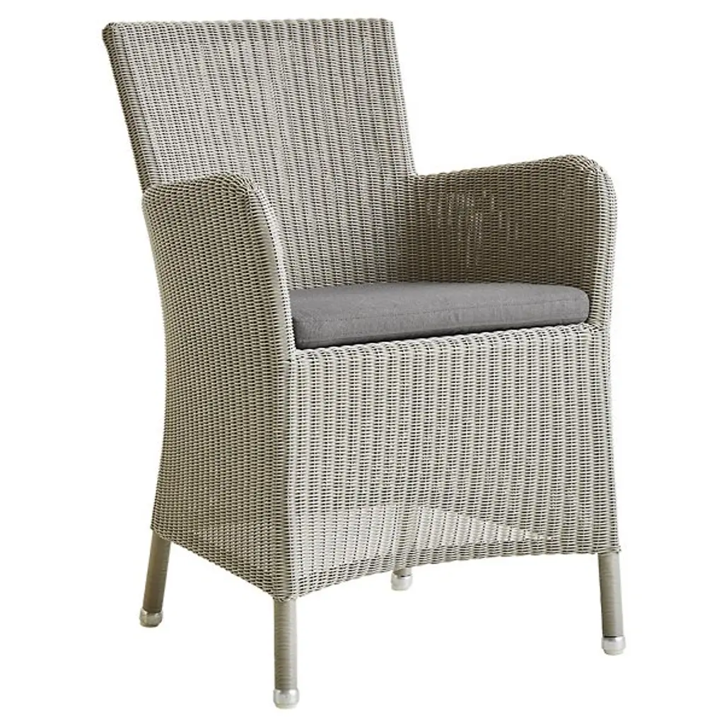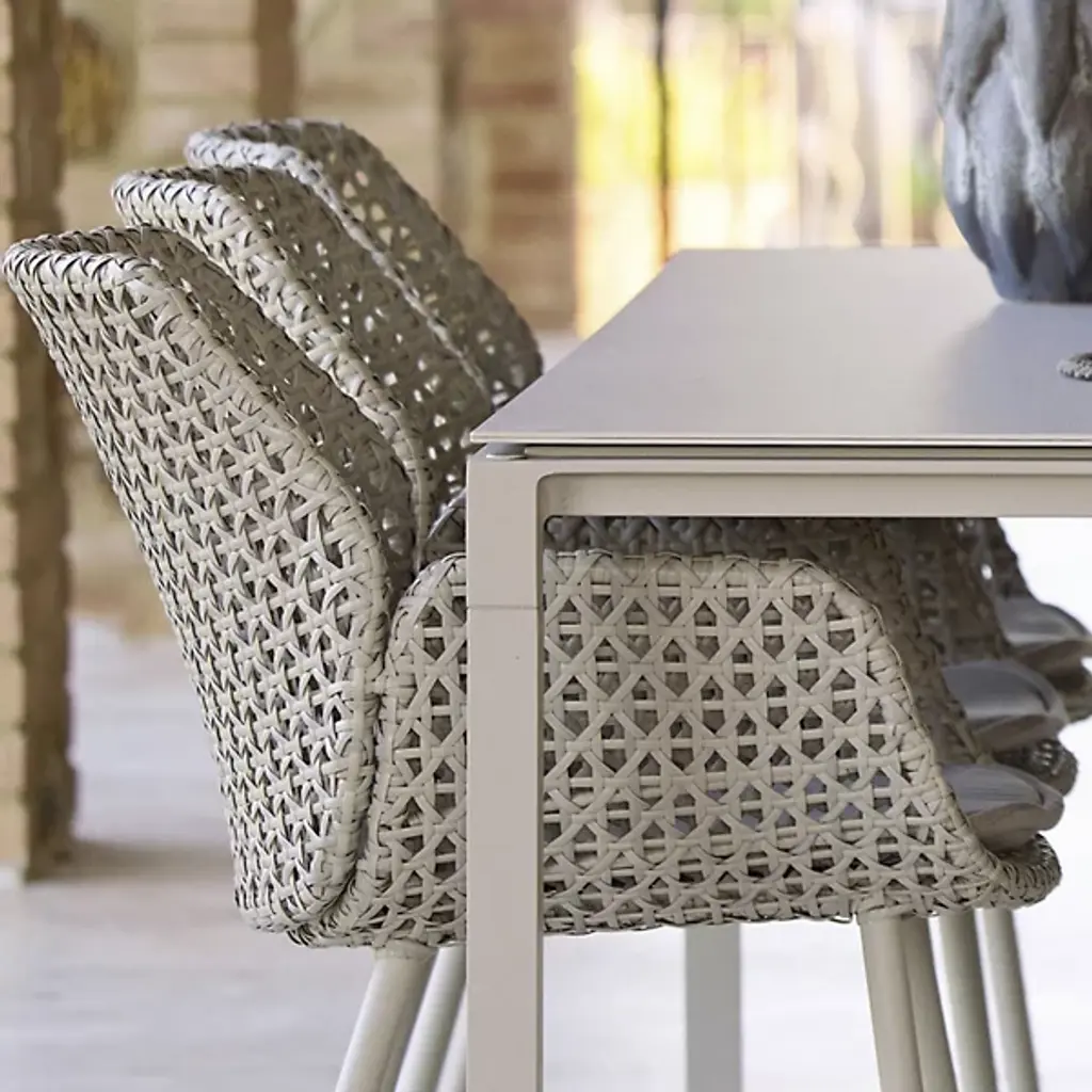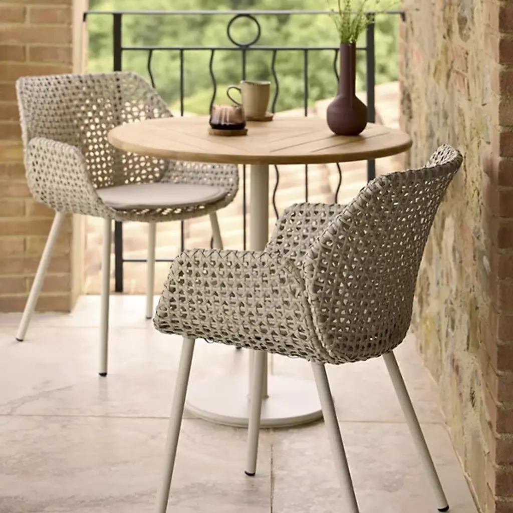 The Vibe Outdoor Armchair with Cushion from Cane-line adds handwoven charm to a contemporary creation. Designed by Welling/Ludvik, this chair shows off a slender galvanized steel frame paired with an intricate Cane-line weave made from durable polypropylene. Designed for year-round use, its gently curved, shell-like seat embraces the body, offering a light and airy presence. A quick-dry cushion rests inside for added comfort, built to withstand sun, rain, and shifting seasons, balancing an engaging, tactile texture with reliable outdoor performance.