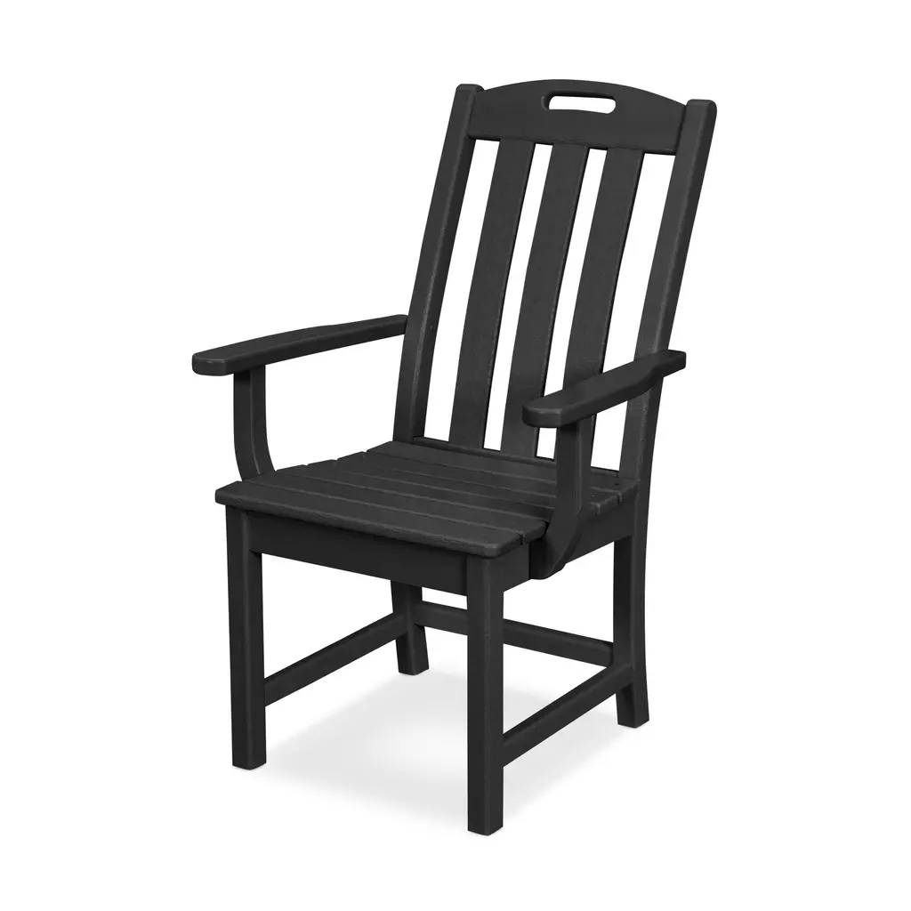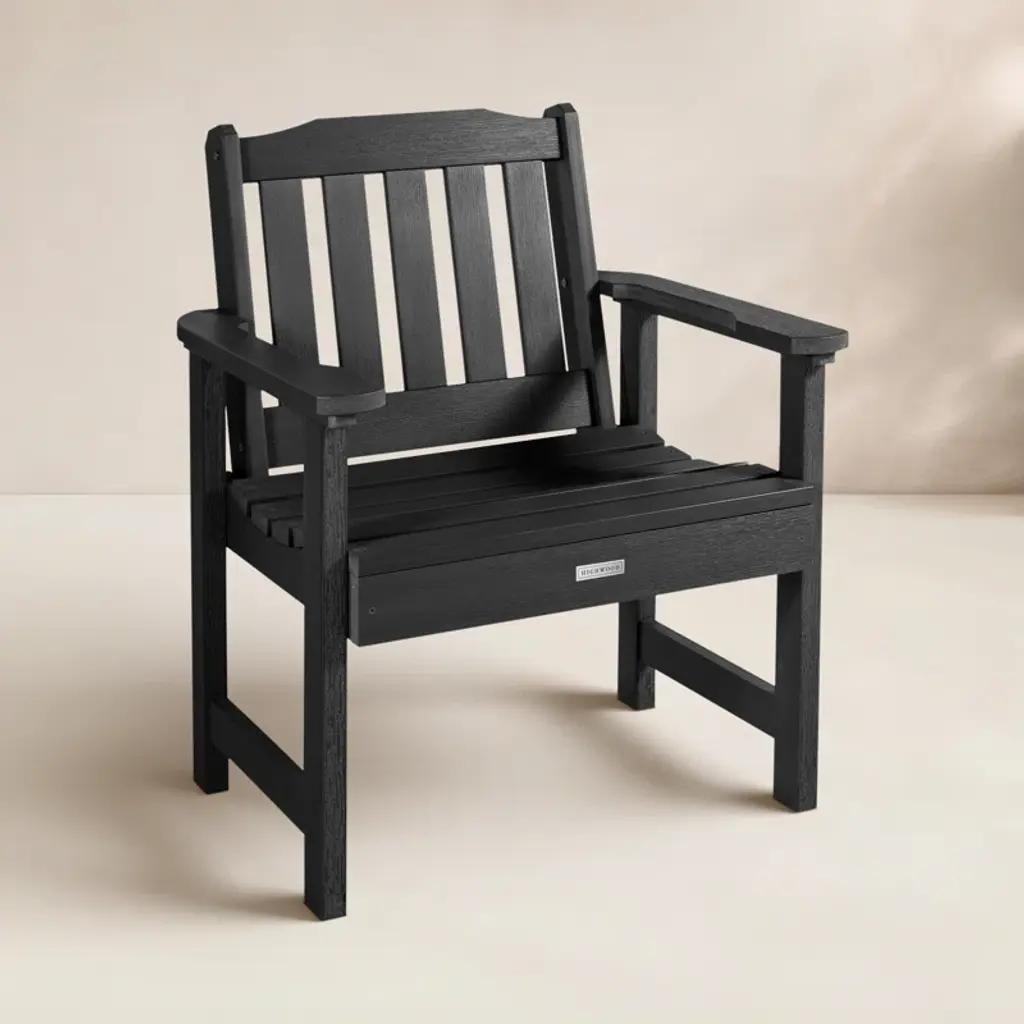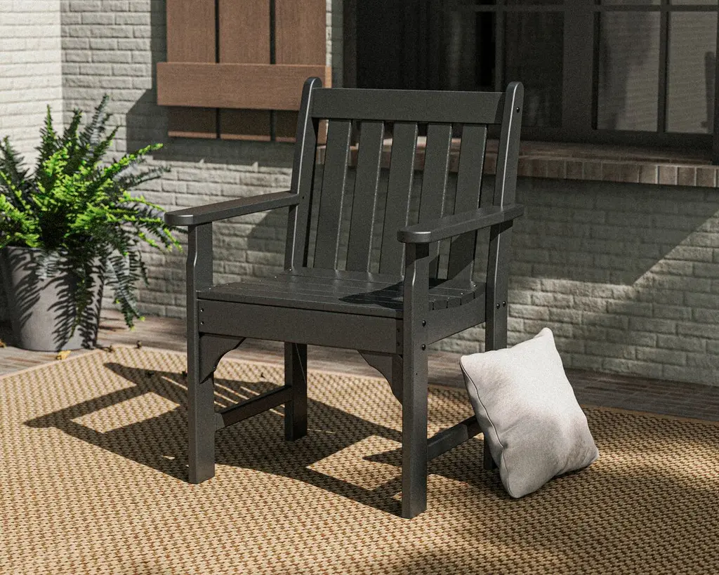 This version of the classic Adirondack chair complements the comfortable pitch and wide arms with curved rear legs and a waterfall front. It's made in the USA of eco-friendly synthetic lumber that will resist splintering, cracking, peeling, and chipping for years to come.