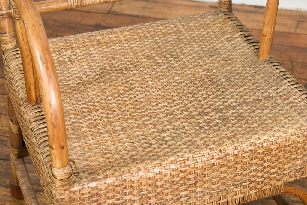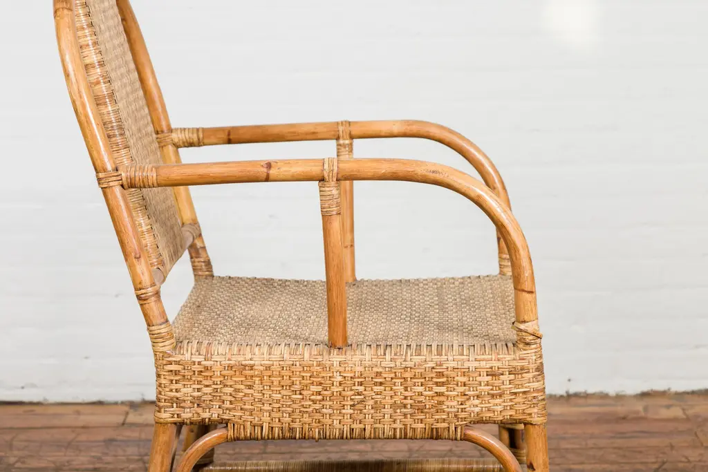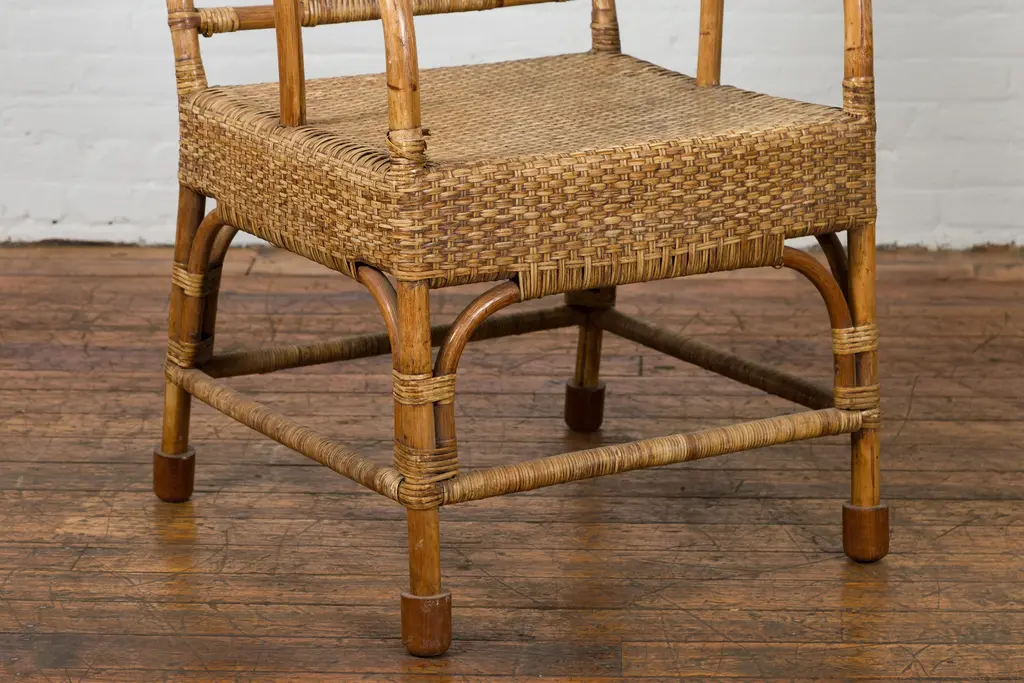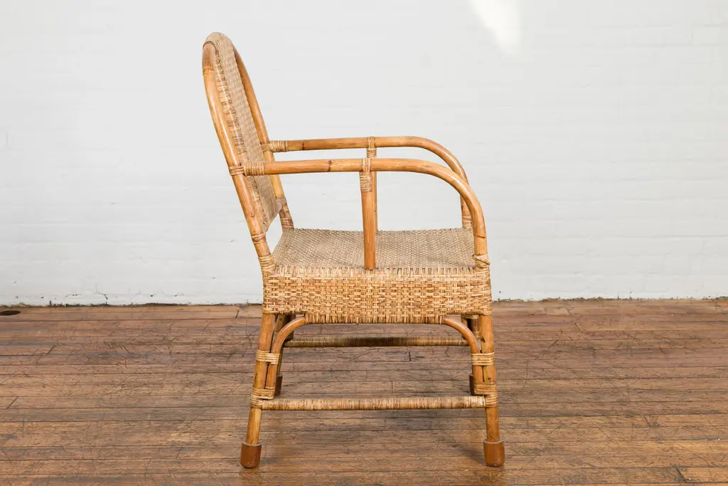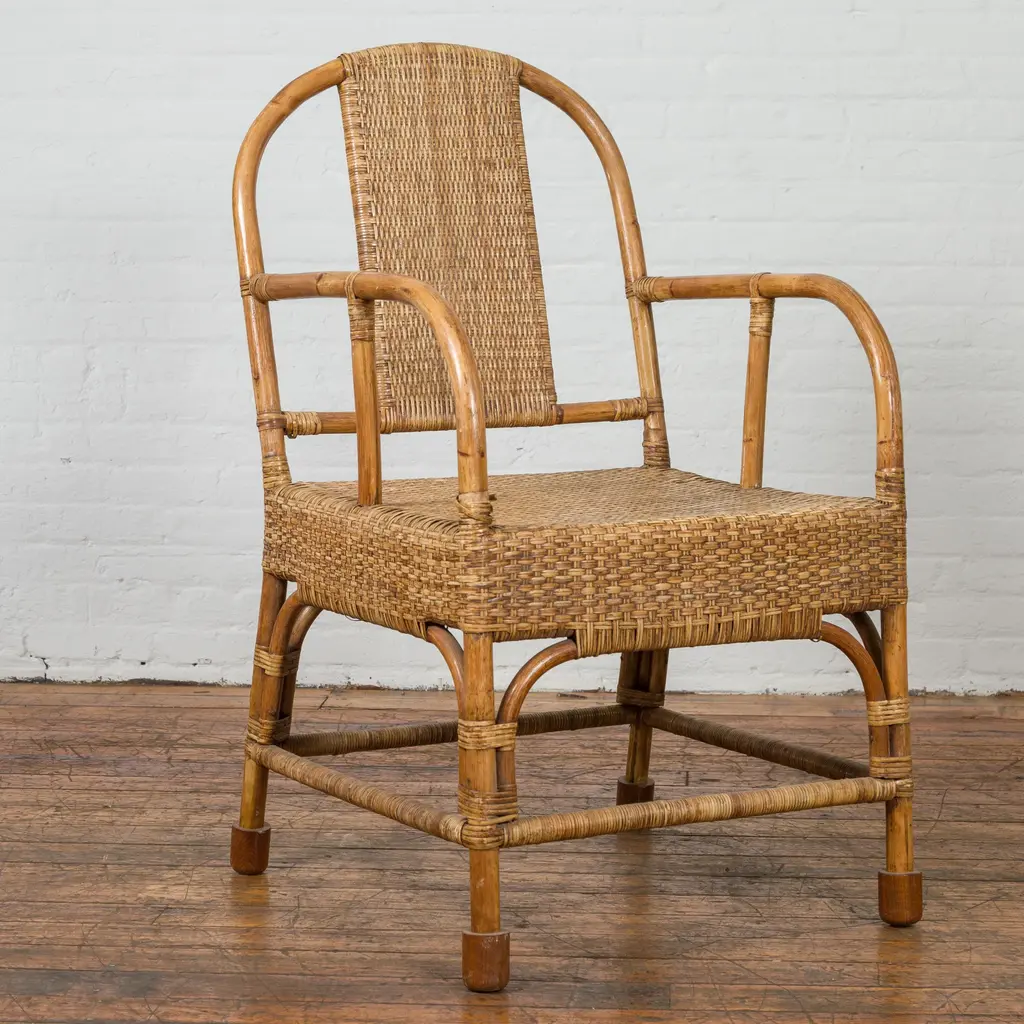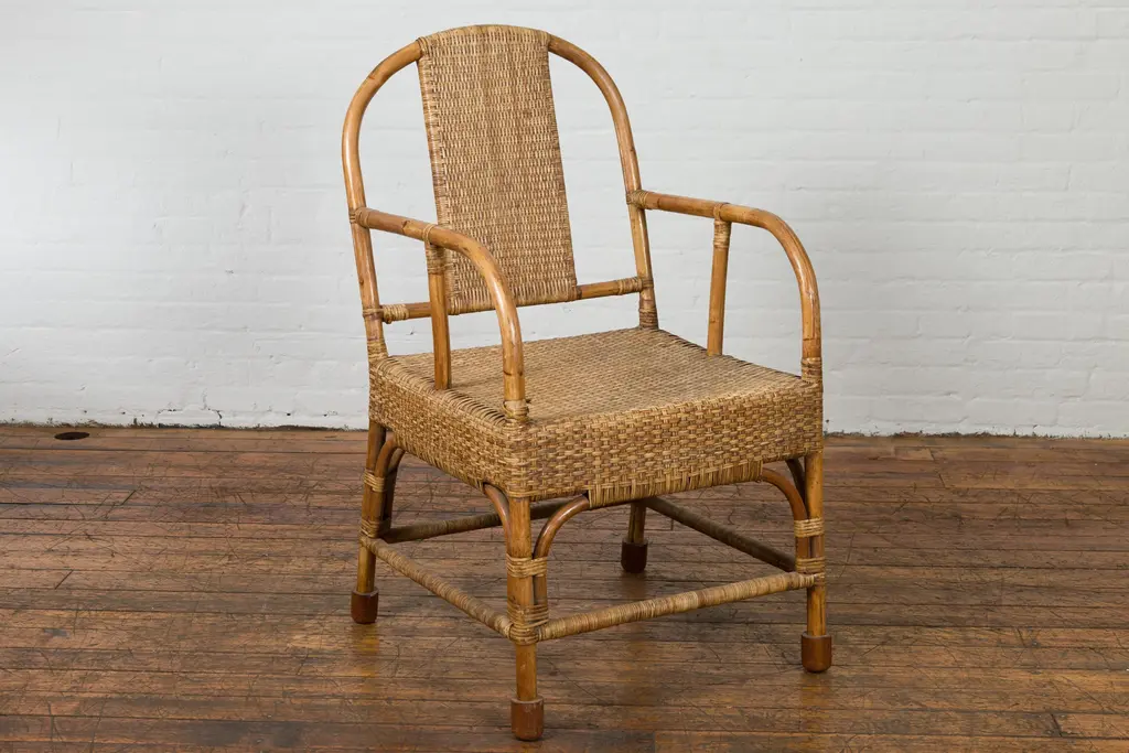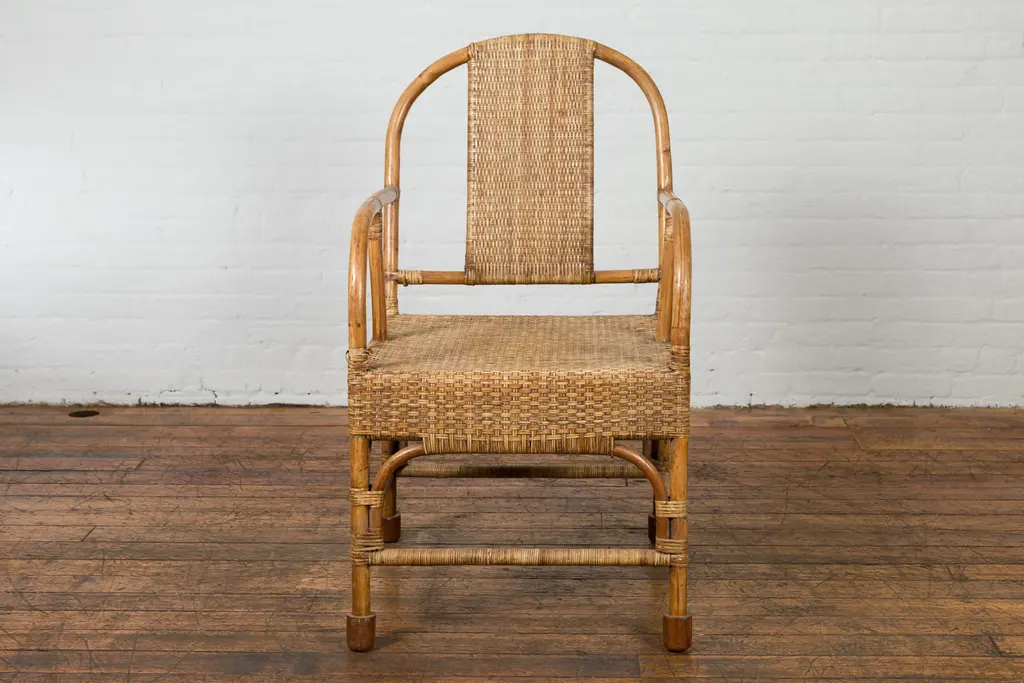 Vintage Burmese Country Style Hand-Woven Rattan Armchair With Rounded Back