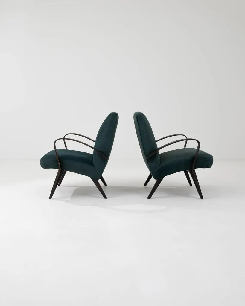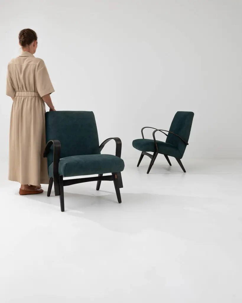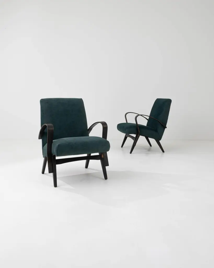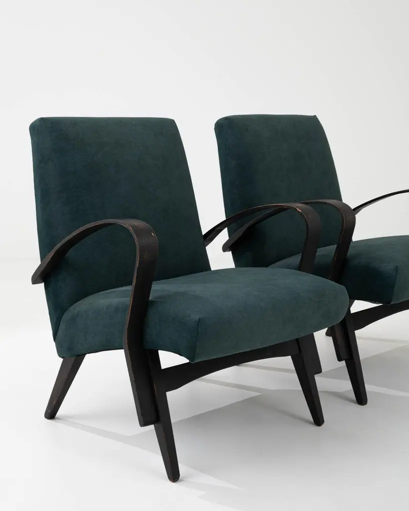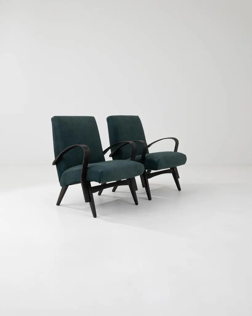 A pair of upholstered armchairs by Czech furniture manufacturer Tatra. Characterized by the clean lines that define their minimalist silhouette, these armchairs were crafted by the iconic Czech brand Tatra, and attributed to designer František Jirák who is known for his striking case pieces and wall units, and for playful compact furniture that distinguish Czech design of the mid-20th century. The arms curve upwards and downwards with dynamism, punctuated by a quick turn following the line of the angled chair leg– the geometry enhancing the bold mid-century modern spirit of the armchairs. The deep blue-green upholstery exudes a sense of tranquility, stability, and versatility, making it a sought-after addition to any contemporary or retro-inspired living space.