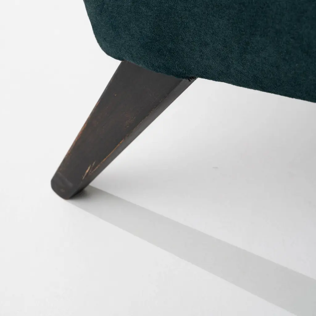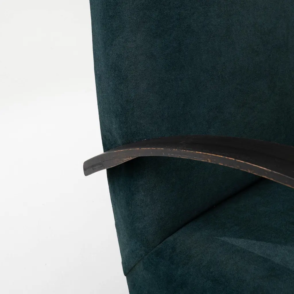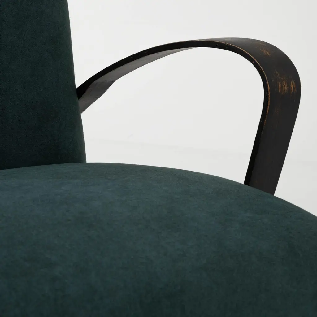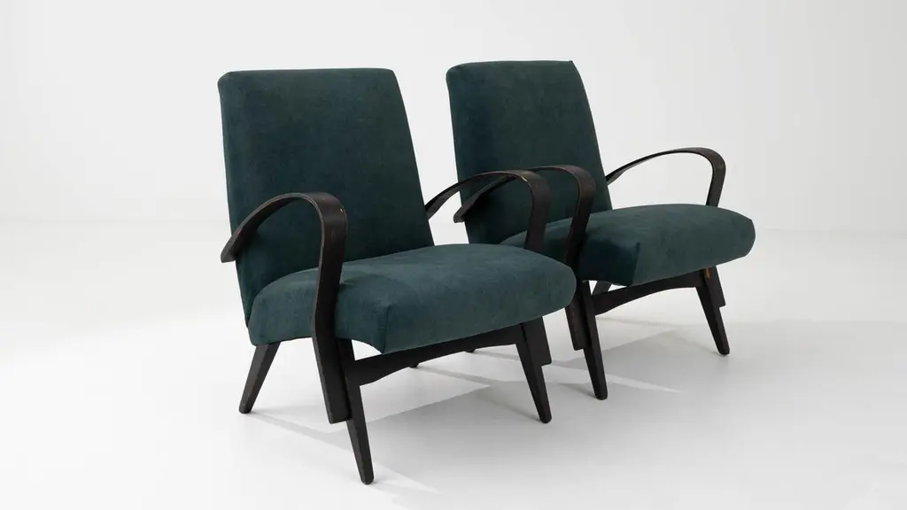 A pair of upholstered armchairs by Czech furniture manufacturer Tatra. Characterized by the clean lines that define their minimalist silhouette, these armchairs were crafted by the iconic Czech brand Tatra, and attributed to designer František Jirák who is known for his striking case pieces and wall units, and for playful compact furniture that distinguish Czech design of the mid-20th century. The arms curve upwards and downwards with dynamism, punctuated by a quick turn following the line of the angled chair leg– the geometry enhancing the bold mid-century modern spirit of the armchairs. The deep blue-green upholstery exudes a sense of tranquility, stability, and versatility, making it a sought-after addition to any contemporary or retro-inspired living space.
