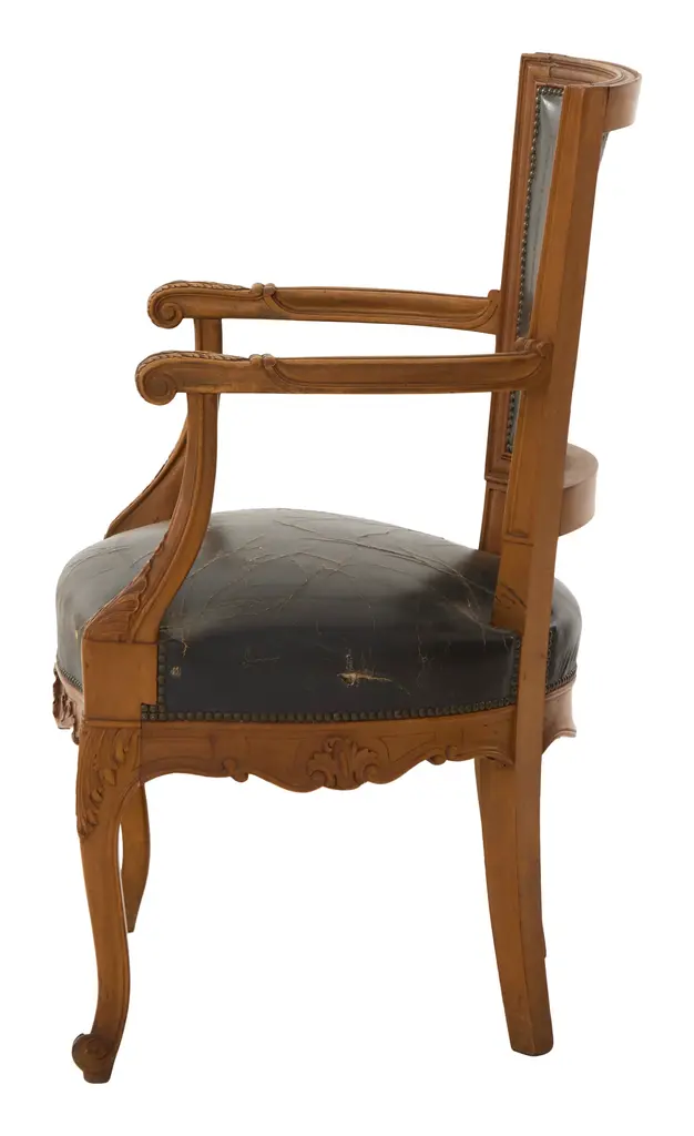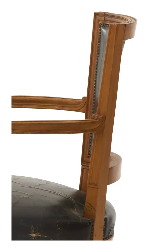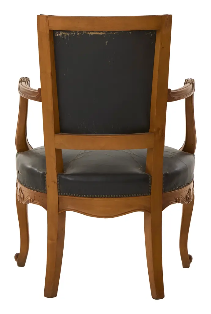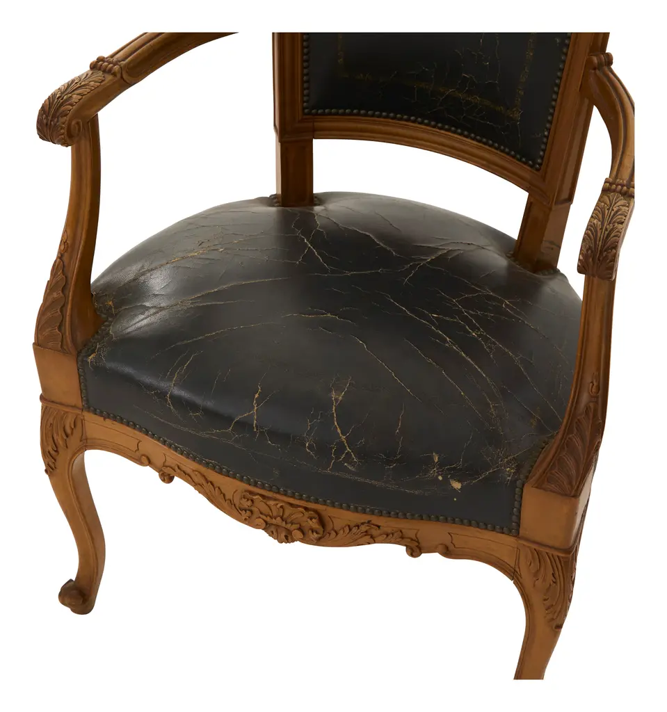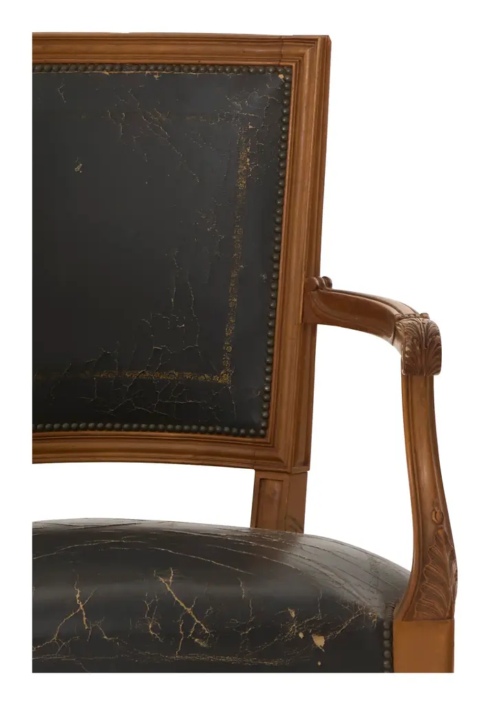 •original leather upholstery with gilt embossed detail •antique brass nailhead trim •carved wood frame •patinaed finish •20th century•belgium Dimensions•23.5"W x 20"D x 35"H•seat: 18"D x 17.5"H •up to 4 available (pending availability)
