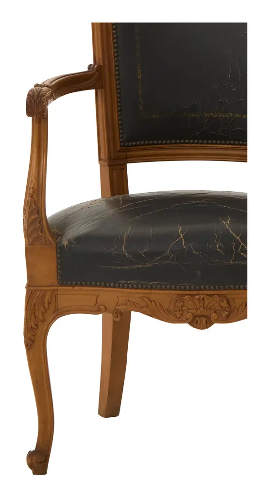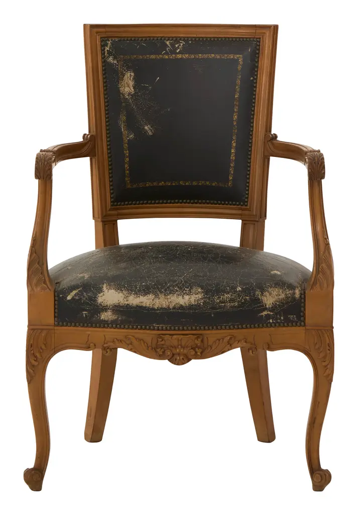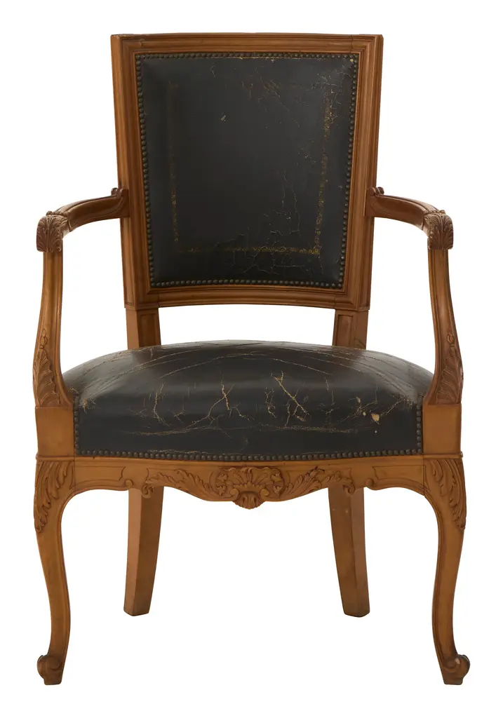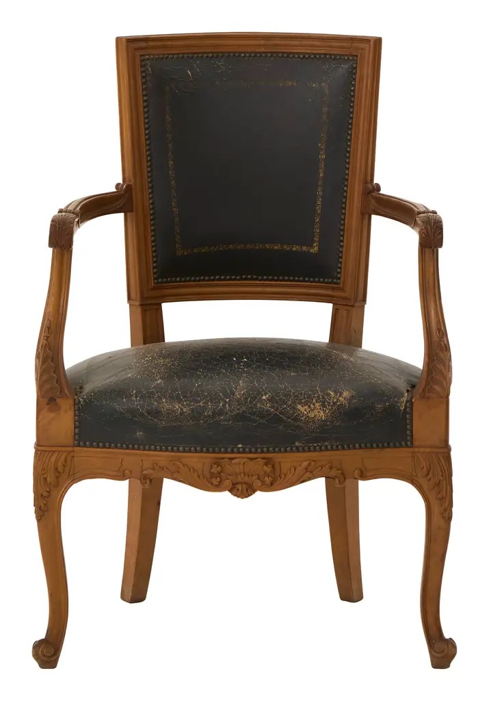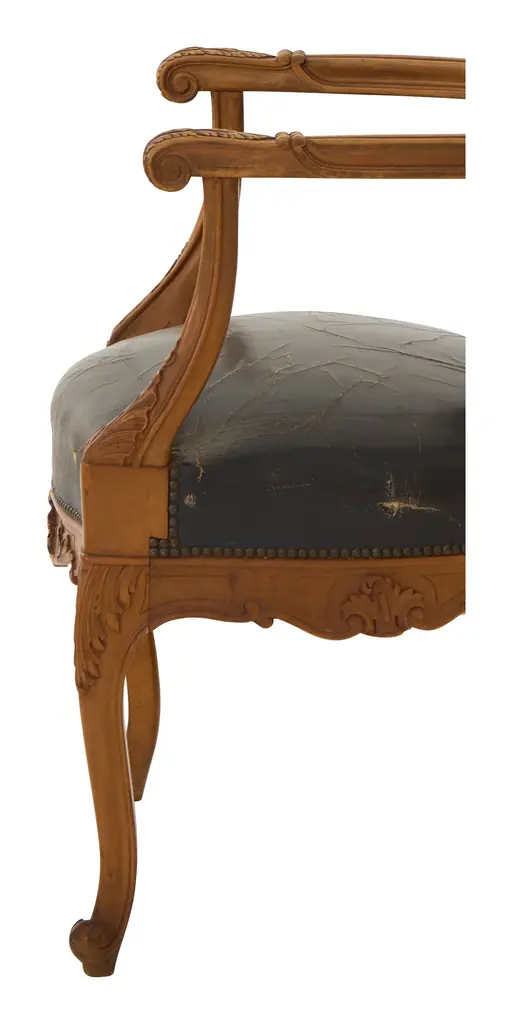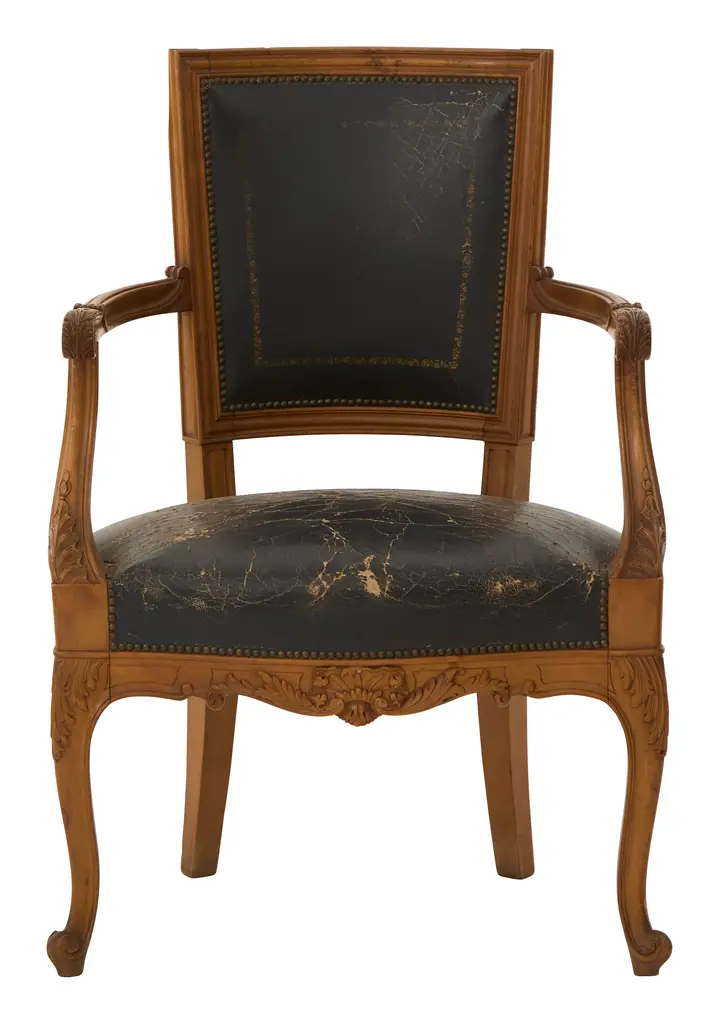 •original leather upholstery with gilt embossed detail •antique brass nailhead trim •carved wood frame •patinaed finish •20th century•belgium Dimensions•23.5"W x 20"D x 35"H•seat: 18"D x 17.5"H •up to 4 available (pending availability)