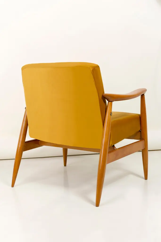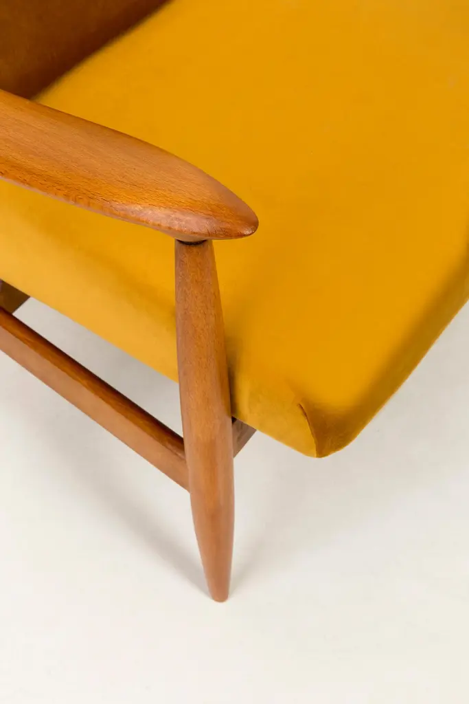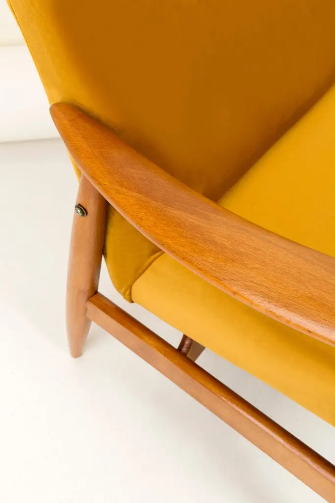 The GFM armchair is an icon of the polish design of the PRL period.The famous armchair was designed in 1962 by the Polish interior designer and furniture designer Edmund Homa. Produced in the Lower Silesian Furniture Factory in Swiebodzice.The chair has a simple, modernist form. It consists of an upholstered seat combined with a wooden backrest. The organic shape is typical of the 1960s style.The chair is very ergonomic and comfortable, as the furniture designs of that time were largely focused on the user. Due to its small size, the furniture fits perfectly into the interiors of contemporary apartments, perfectly meeting the needs of customers.The chair is in perfect condition after a professional renovation. We can prepare this armchair in another wood or fabric color.