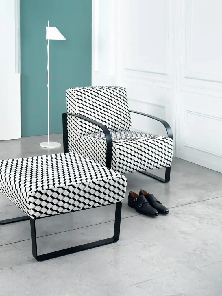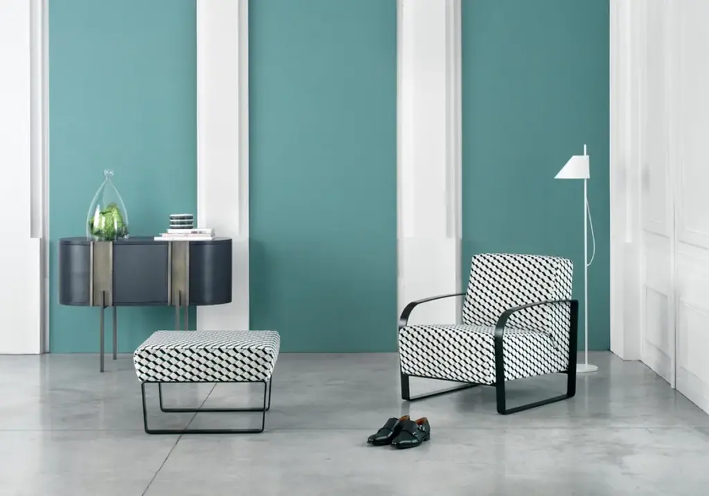 Viola in a fifties styleupholstered armchair, Viola stands out for its feature and comfort. The large wraparound backrest and the line that divides seat and backrest characterize its profile. Viola finds its natural place in contract and domestic spaces. It allows to create private classy corners thanks to its compactness and neatness.