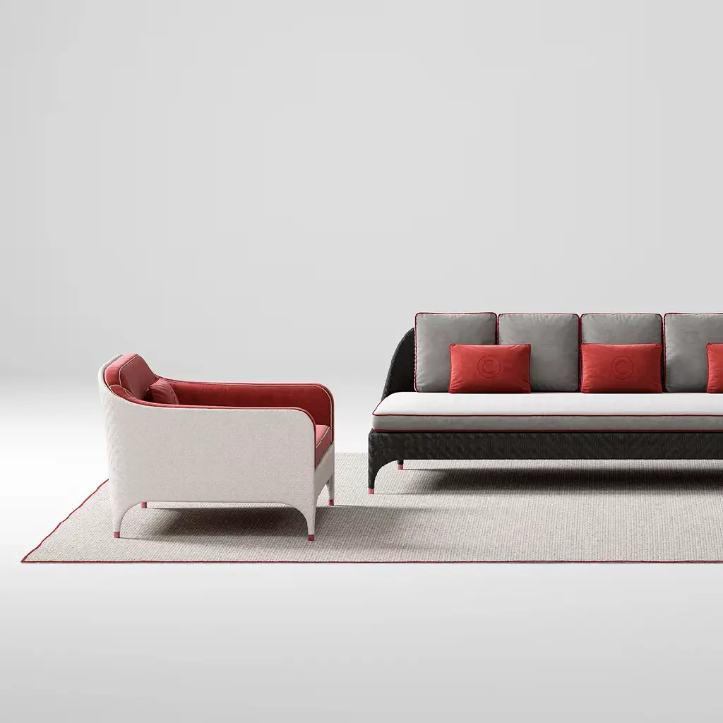 With its spacious and comfortable seating, this armchair creates the perfect lounge spot to relax outdoors by the poolside, on a terrace, patio, or garden. Finished with an elegant woven texture, the white resin-covered aluminum frame offers a luxurious seating experience, with its rounded and embracing back and armrests covered with perfectly shaped polyurethane-padded cushions of Tyvek-covered red fabric with white piping. Entirely weather and water resistant, the frame is also available in black, ivory, and red.