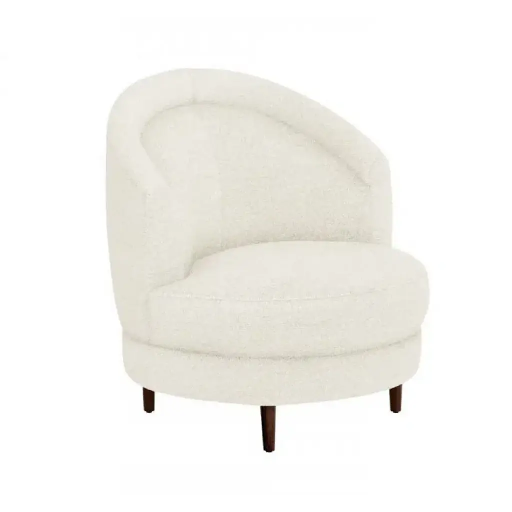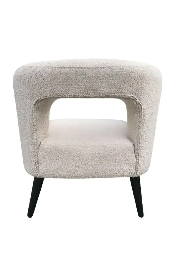 A bold, occasional chair with a striking silhouette and cut-out back. The Buco delivers minimalist elegance to any living space. The supportive foam-filled seat and back are upholstered in soft, neutral ecru chenille boucle weave atop black-coated wooden legs.