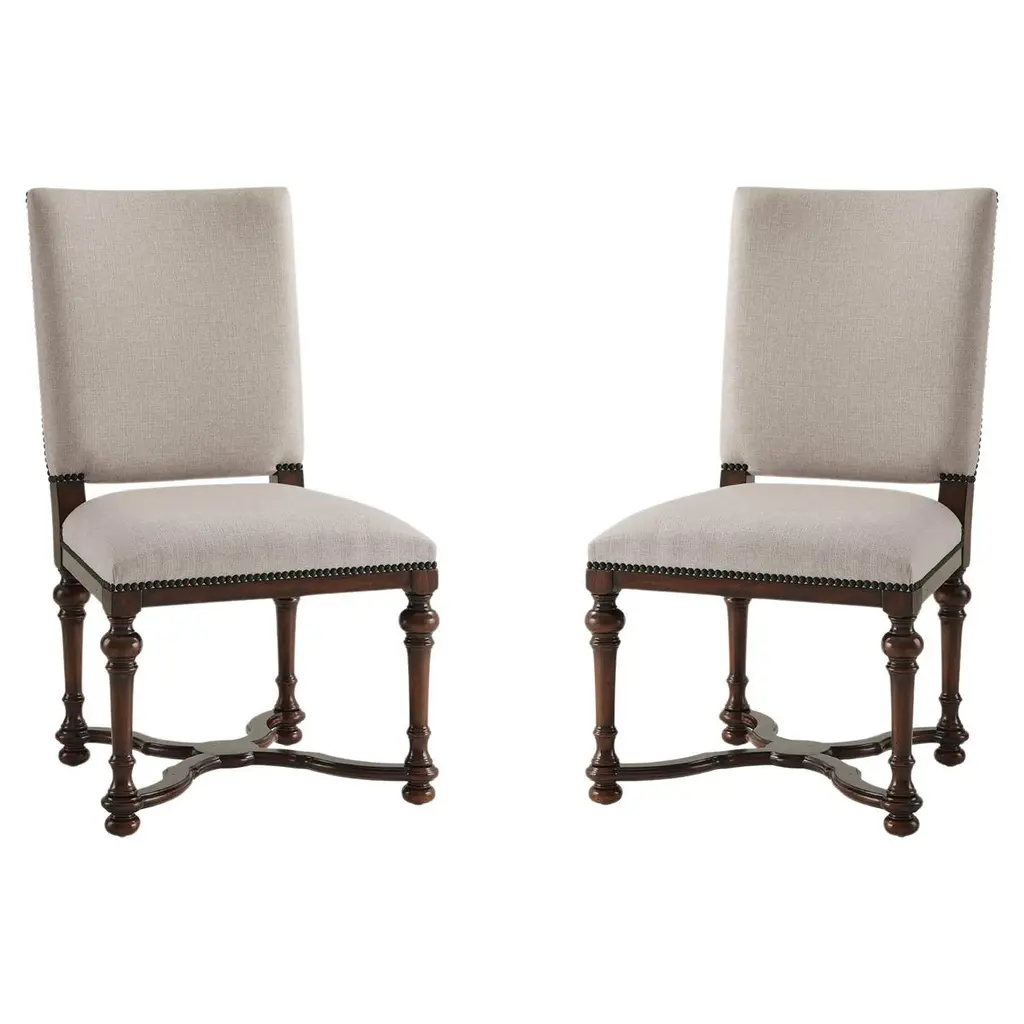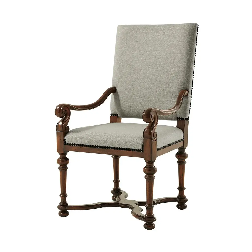 A hand-carved armchair, the rectangular padded back and an upholstered seat on turned tapering legs joined by a wavy "X" stretcher. The original William and Mary. Dimensions: 24.5" W x 26.5" D x 42" H Seat height - 20.25" Arm height - 25"