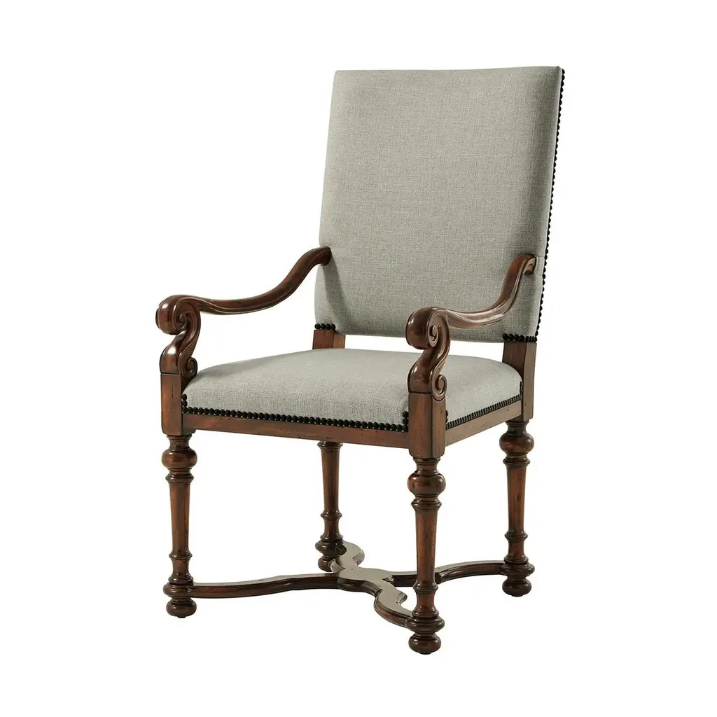 A hand-carved armchair, the rectangular padded back and an upholstered seat on turned tapering legs joined by a wavy "X" stretcher. The original William and Mary.Dimensions: 24.5" W x 26.5" D x 42" HSeat height - 20.25"Arm height - 25"