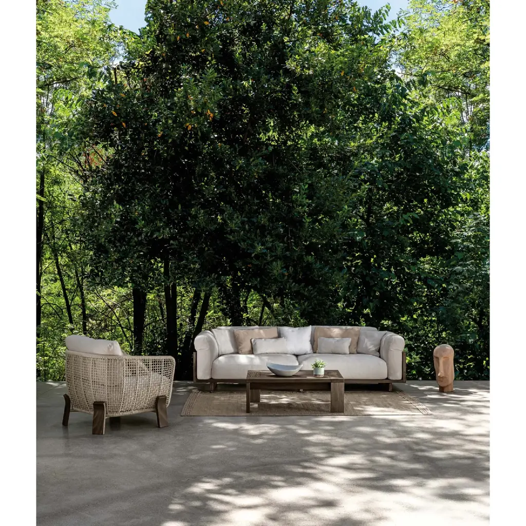 The Argo living armchair is the ideal piece of furniture to create elegant and natural combinations in your outdoor area. The seating cushions, with large and sculptural volumes, are enriched by the bold and consistent textures of the chosen fabrics, perfectly in line with the double braided rope weaving enveloping the backrest and the armrests.