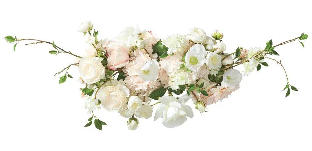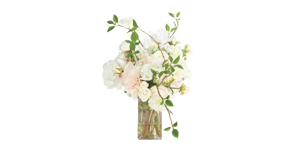 Dahlias, ranunculus, roses, oh my! This lush faux floral arrangement in blush and cream is stunningly handcrafted and never fades. A tall linear vase is perfect for squeezing into tight spots like home office desks, bookshelves, or night tables.