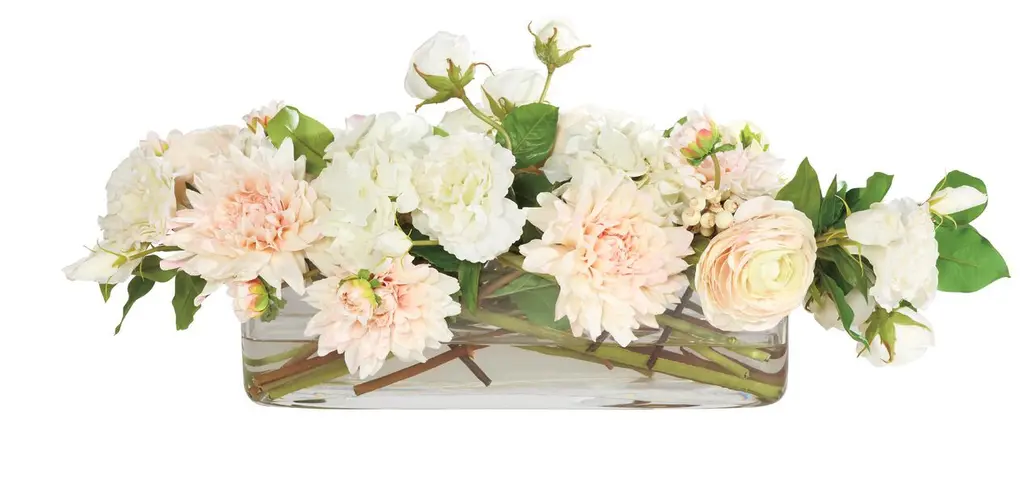 White and blush are a timeless, romantic combination for floral décor, so our talented artisan partners created this lush faux beauty by hand—just for you. Its low linear vase makes it perfect as a dining table centerpiece.