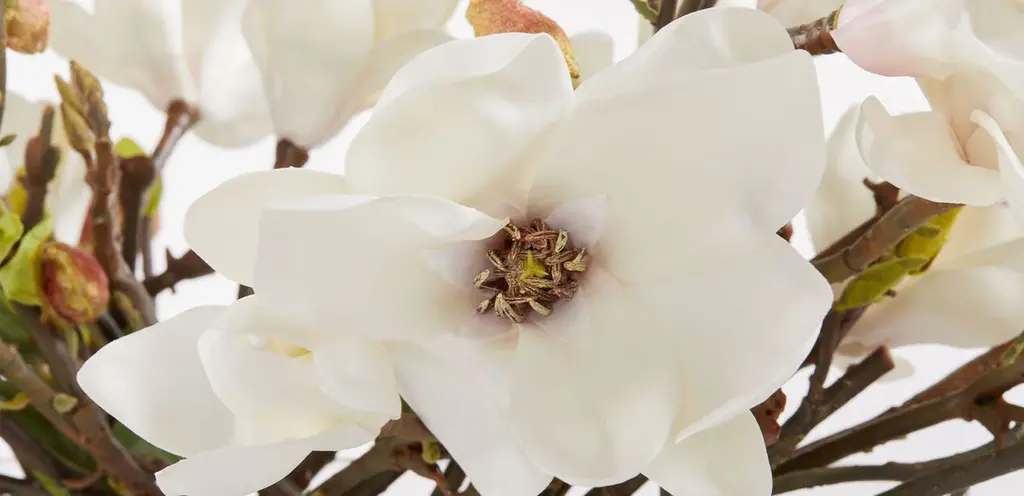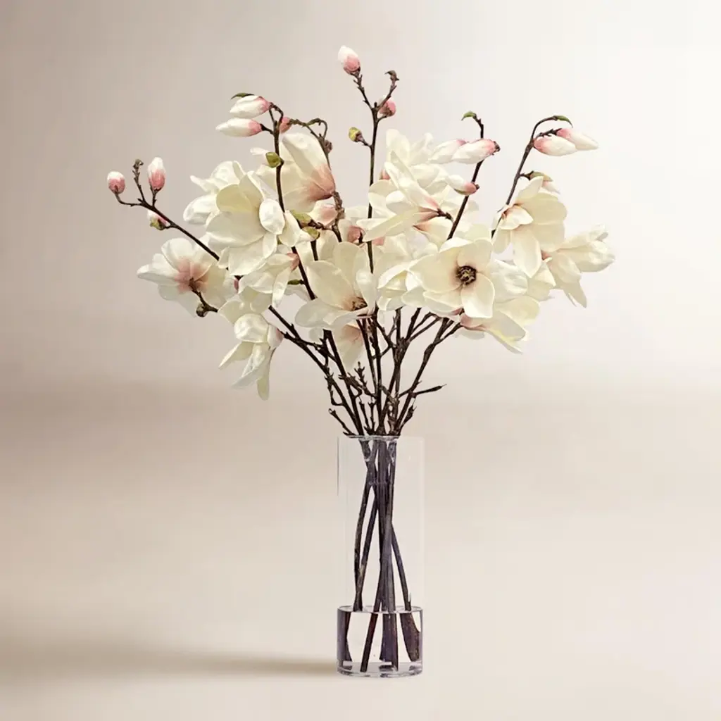 Lush white faux magnolias, crafted and arranged by talented artisans, bloom from the vase in a captivating arc. A narrow glass vase makes this faux floral arrangement perfect for night tables, desks, and bookshelves.