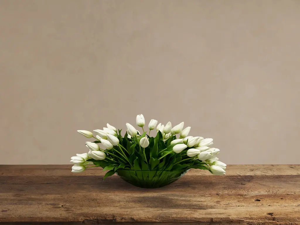 Bud by bud, talented artisans crafted this lush arrangement of faux tulips by hand. With deep green leaves and stems gently draping over the sides of the low vase, the arrangement appears larger than life—perfect for a dramatic centerpiece.