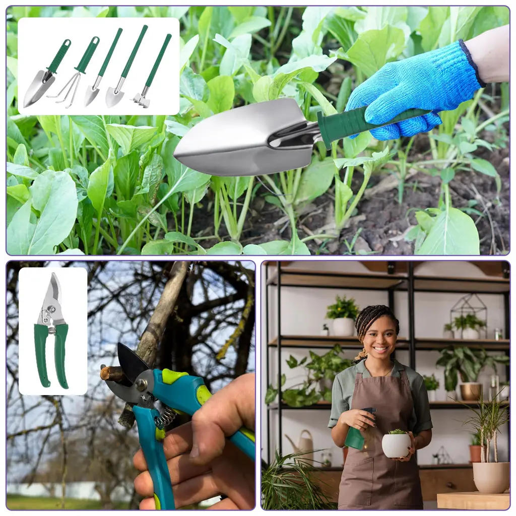 1. The gardening tools are made of good quality plastic that is lightweight yet durable, the included supplies are all designed to be long-lasting and withstand outdoor conditions.2. The gardening planting tools feature a sleek and ergonomic design that allows for comfortable use. The shovels have edges for easy digging and planting, while the stainless steel scissor is great for trimming plants, and the water sprayer has a nozzle for easy watering.3. The Garden Tool Set is perfect for planting, digging, pruning, and watering your garden, is easy to use and suitable for both beginners and experienced gardeners.4. Whether plant a new garden, tend to existing plants, or simply enjoy some outdoor gardening, the gardening tool set is a versatile and convenient option.5. Please remember to clean and dry the gardening tools after each use to prevent rusting. Store the tools in the case when not in use to keep them organized and protected.