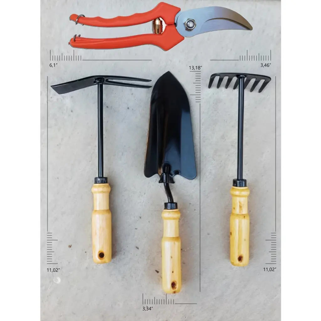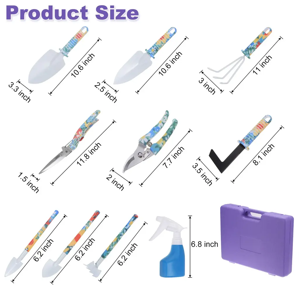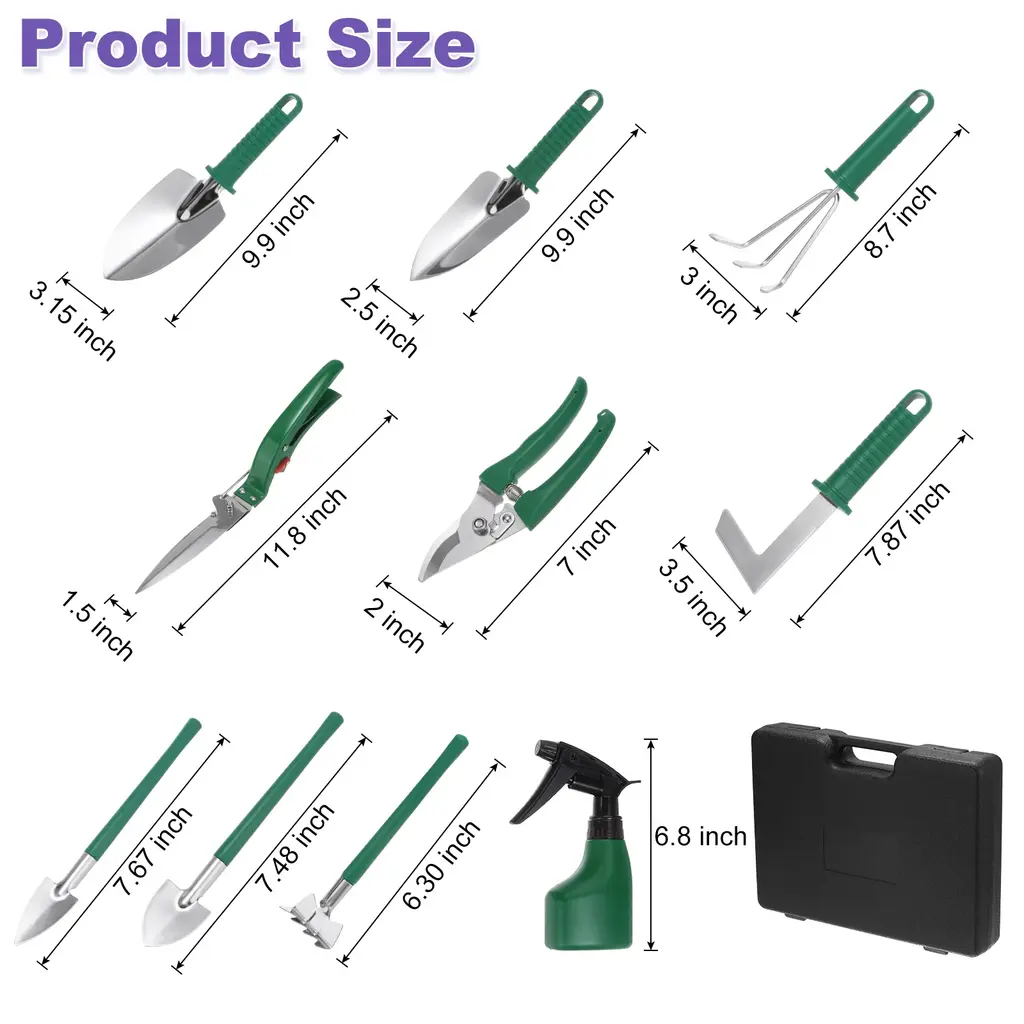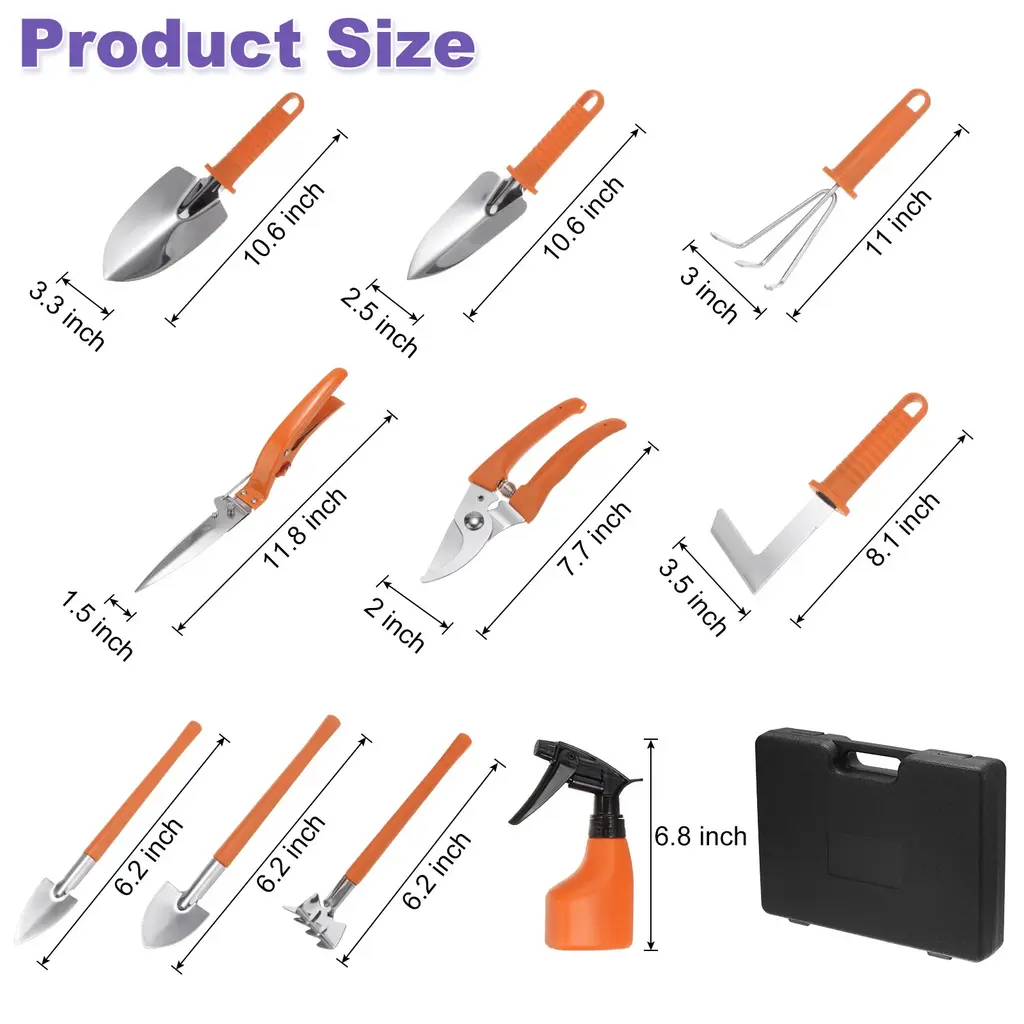 1. The gardening tools are made of good quality plastic that is lightweight yet durable, the included supplies are all designed to be long-lasting and withstand outdoor conditions.2. The gardening planting tools feature a sleek and ergonomic design that allows for comfortable use. The shovels have edges for easy digging and planting, while the stainless steel scissor is great for trimming plants, and the water sprayer has a nozzle for easy watering.3. The Garden Tool Set is perfect for planting, digging, pruning, and watering your garden, is easy to use and suitable for both beginners and experienced gardeners.4. Whether plant a new garden, tend to existing plants, or simply enjoy some outdoor gardening, the gardening tool set is a versatile and convenient option.5. Please remember to clean and dry the gardening tools after each use to prevent rusting. Store the tools in the case when not in use to keep them organized and protected.