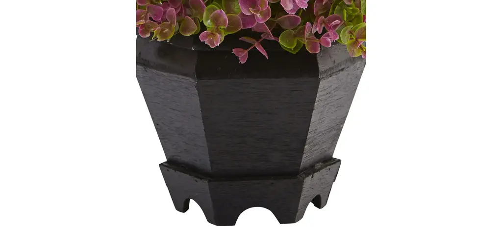 Bursting with tiny leaves, this 13in Sedum and Eucalyptus Artificial Plant with Planter creates a timeless arrangement. The multi-tone leaves create a fall look with green and purples hues. Little sprigs of eucalyptus spill over the edge of the arrangement. Comes with a black wooden planter.